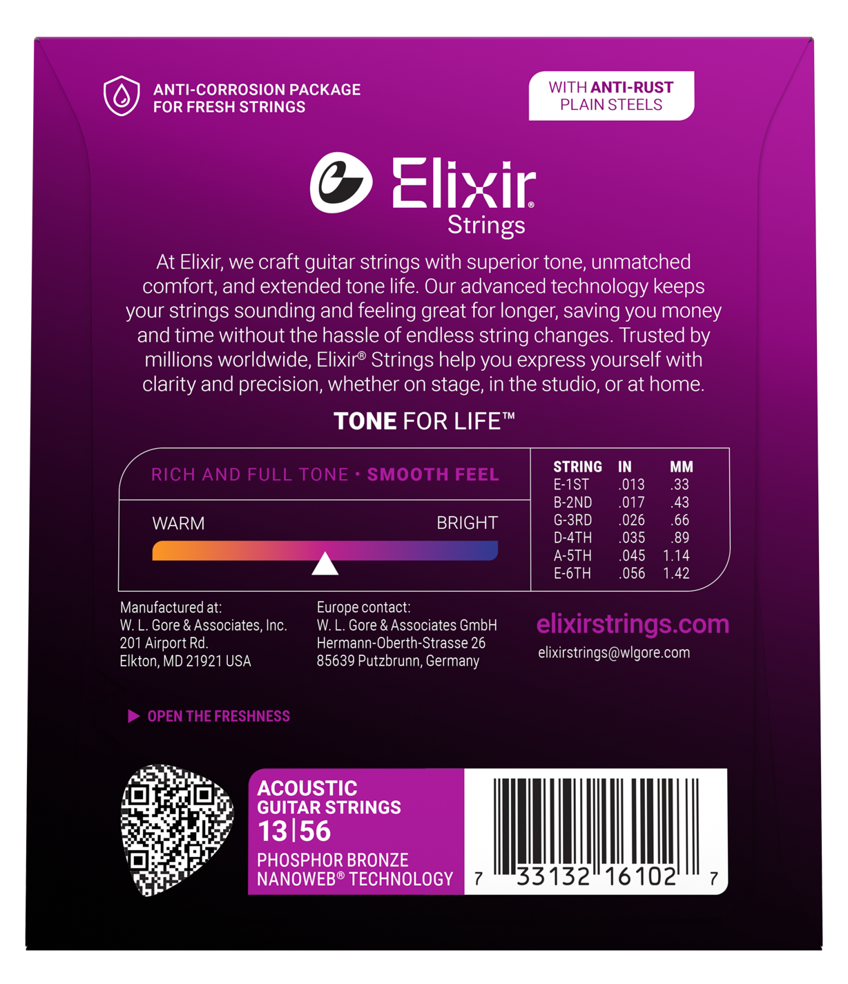 Elixir Acoustic Phosphor Bronze Strings with Nanoweb Coating deliver a warm, sparkling tone with exceptional clarity and extended life. The ultra-thin coating protects the entire string, keeping debris out of the windings while preserving brightness and consistency. These strings provide a smooth, comfortable feel that enhances playability, with reduced finger squeak making them ideal for both live performance and studio work. Anti-Rust plated plain steel strings resist corrosion, ensuring durability across the entire set. Designed for players who want reliable tone that lasts, these strings reduce the hassle and cost of frequent changes. At Riffs & Licks Music, we think these strings combine rich tone, smooth playability and long-lasting performance that acoustic players will appreciate.