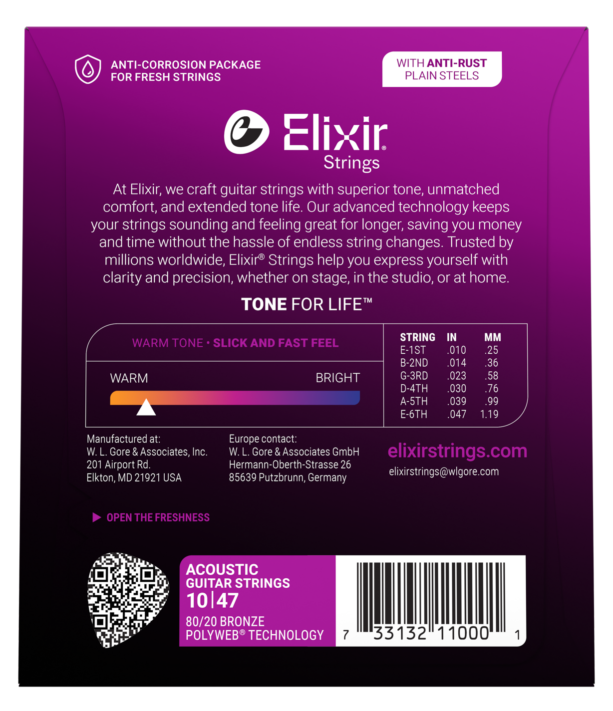 Elixir Acoustic 80/20 Bronze Strings with Polyweb Coating provide a warm, played-in tone along with extended tone life. The ultra-thin coating protects the entire string, preventing dirt from collecting in the windings and preserving clarity. Their smooth feel is gentle on the fingers and enhances playability, while reduced finger squeak makes them ideal for both live performance and recording. Anti-Rust plated plain steel strings resist corrosion, giving the whole set longer life. With less need for frequent string changes, these strings are a reliable option for guitarists who value durability and consistent sound. At Riffs & Licks Music, we think these strings deliver warmth, comfort and lasting performance that players can count on.