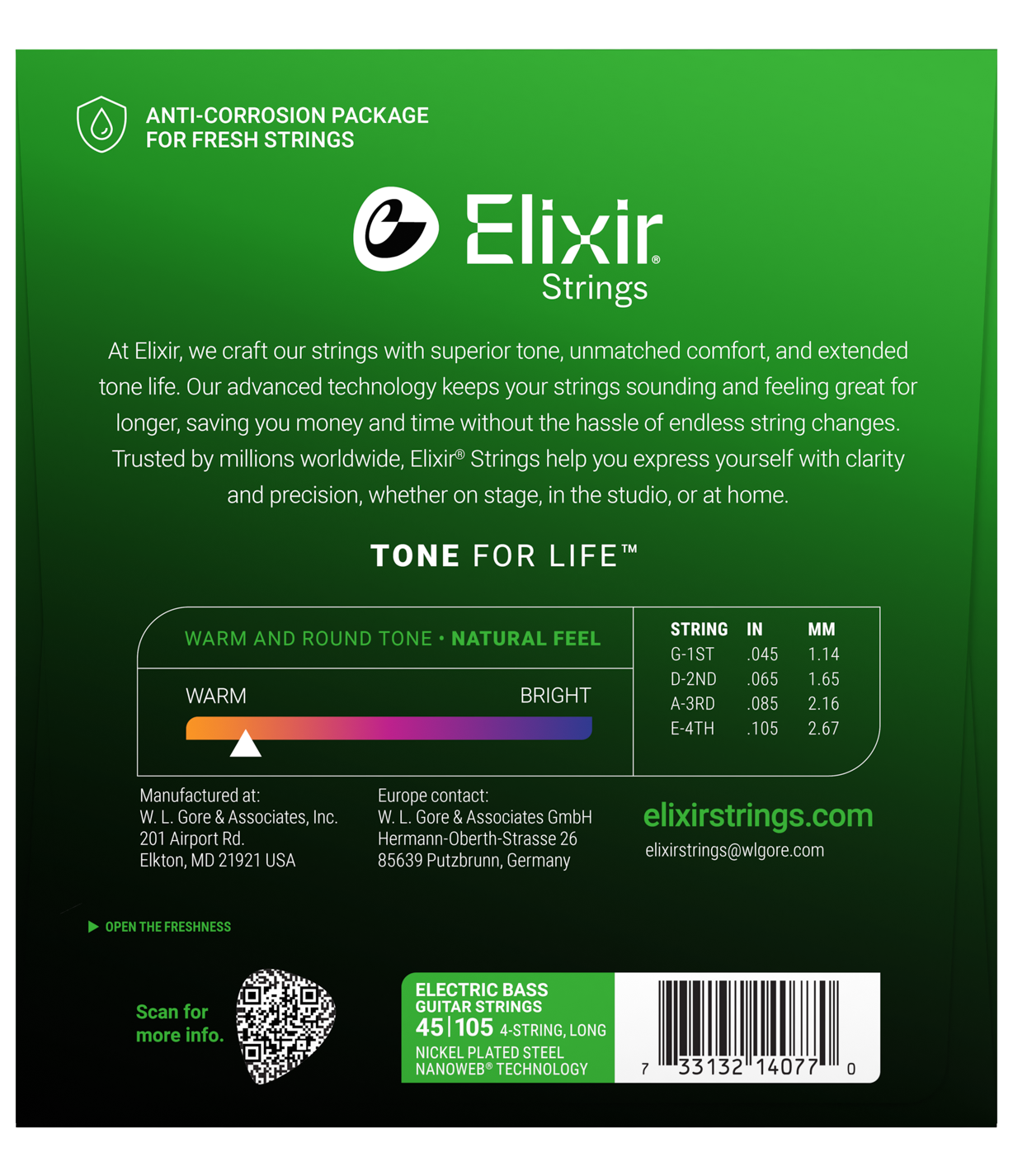 Elixir Bass Strings with Nanoweb Coating are crafted from nickel plated steel to deliver a rich, rounded tone with enhanced clarity and strong midrange presence. Developed in collaboration with thousands of bass players worldwide, these strings feature a specialised Nanoweb Coating designed exclusively for bass, providing longer tone life than uncoated alternatives. The coating protects the entire string, keeping dirt out of the windings and ensuring consistent sound and response. With optimised tension profiles, they offer smooth playability, natural feel and reduced finger squeak, while standing up to hard-hitting playing styles. At Riffs & Licks Music, we think these strings combine durable performance, lasting tone and comfortable feel—ideal for gigging and recording bassists alike.