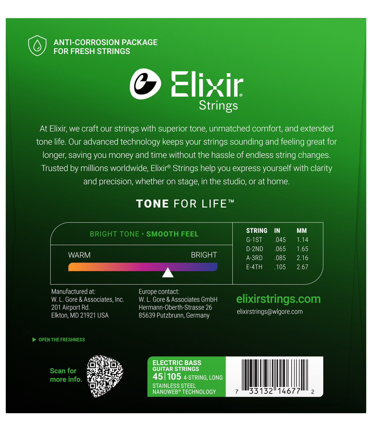 Elixir Stainless Steel Bass Strings with Nanoweb Coating deliver a bright stainless tone with powerful lows and long-lasting performance. Developed with input from thousands of bass players, these strings feature a specialised coating designed exclusively for bass. The ultra-thin coating protects the entire string, preventing grime from building up between the windings while ensuring consistent tone and response. With optimised tension profiles, they provide smooth playability, enhanced grip and reduced finger squeak, even under aggressive playing. Built for durability, they hold up to heavy attacks and maintain their sound far longer than uncoated strings. At Riffs & Licks Music, we think these strings are perfect for bassists seeking a bright, punchy tone with deep lows and extended life.