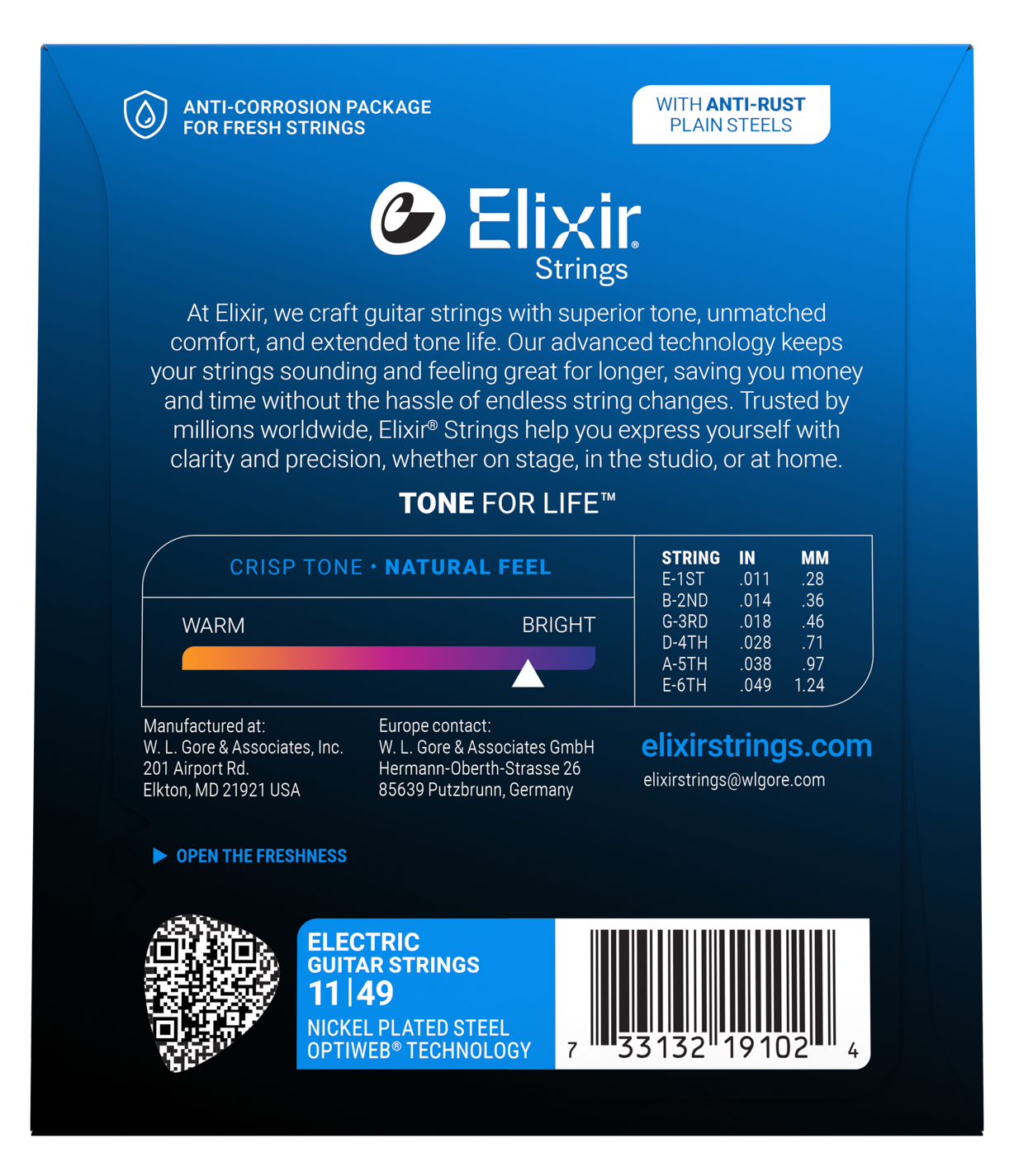 Elixir Electric Nickel Plated Steel Strings with Optiweb Coating provide the feel and tone of natural uncoated strings while extending tone life. The Optiweb coating delivers a crisp, lively sound and a natural grip, giving players the response they expect without sacrificing durability. The ultra-thin coating protects against corrosion and debris, ensuring consistent tone over time, while Anti-Rust plated plain steel strings further extend lifespan. Designed for guitarists who want the brightness and familiarity of uncoated strings but with less maintenance, these strings balance tone, comfort and longevity. At Riffs & Licks Music, we think they are an ideal choice for players seeking natural feel and sound with long-lasting reliability.