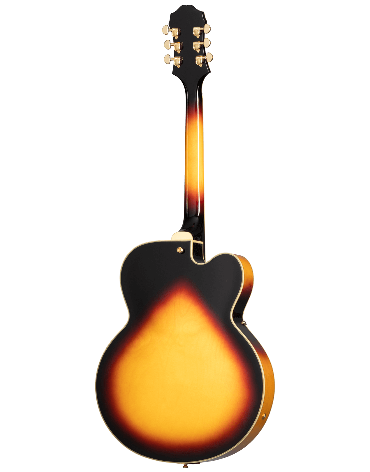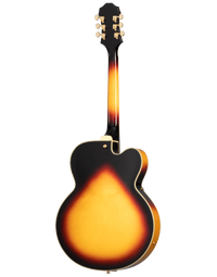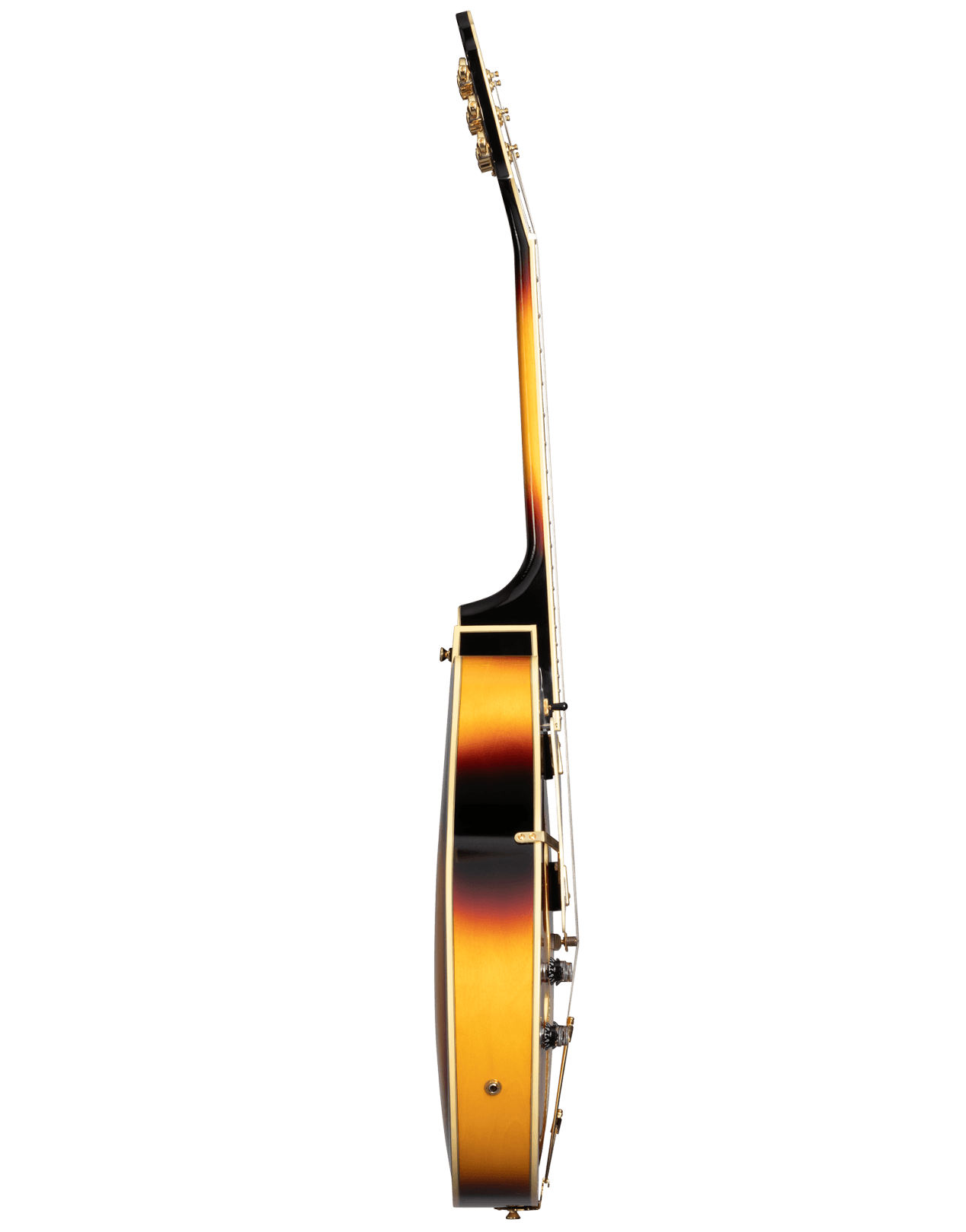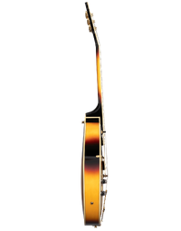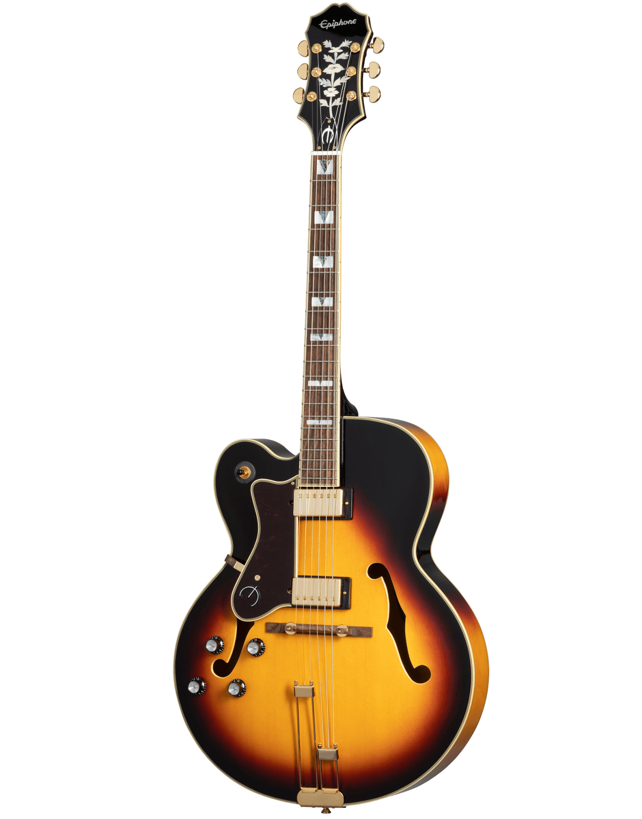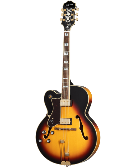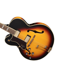 Discover the epitome of hollowbody jazz guitars with the Epiphone Broadway Traditional Left-Handed in Vintage Sunburst. This legacy-rich instrument, cherished for over 70 years, is now available for left-handed players seeking unparalleled jazz elegance. Equipped with Alnico Classic PRO humbuckers, a vintage-style gold Frequensator Split Trapeze tailpiece, and premium tuners, it delivers exceptional tone and versatility across genres. The gold hardware, along with the intricate mother-of-pearl and abalone fretboard and headstock inlays, exude classic sophistication.
