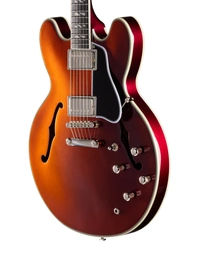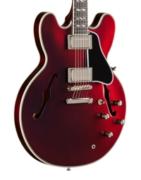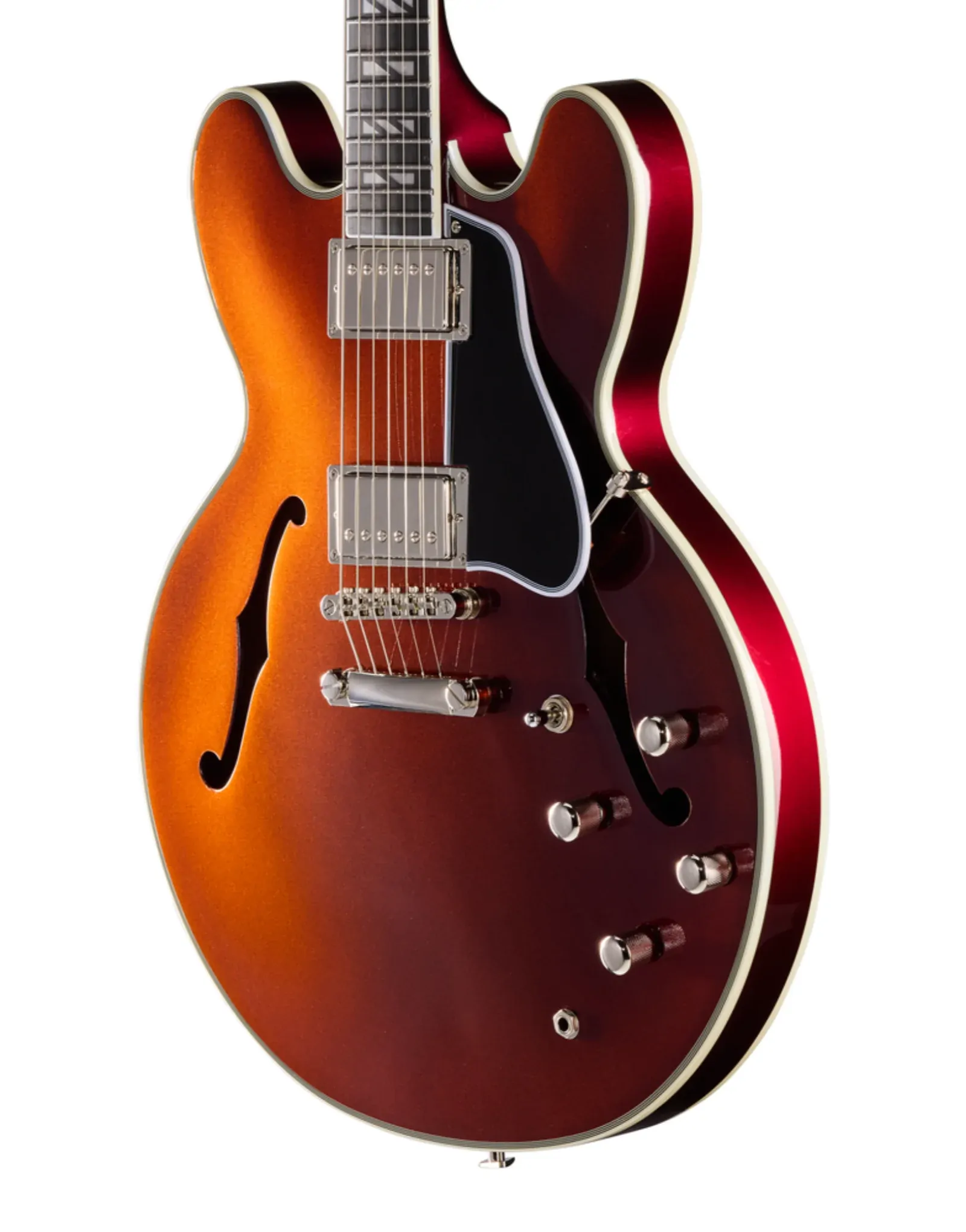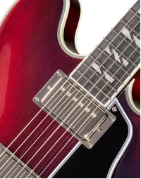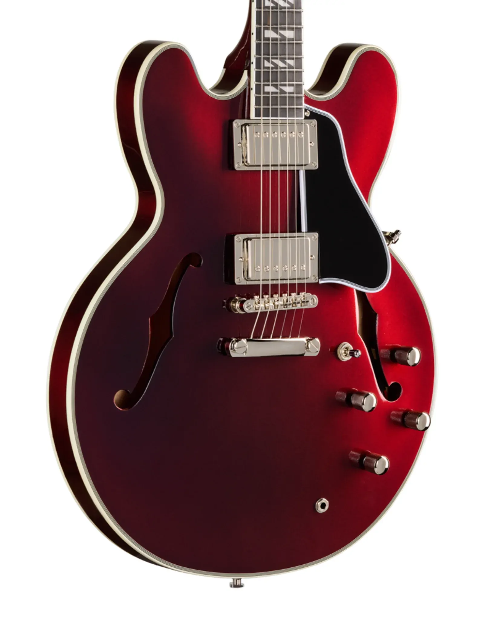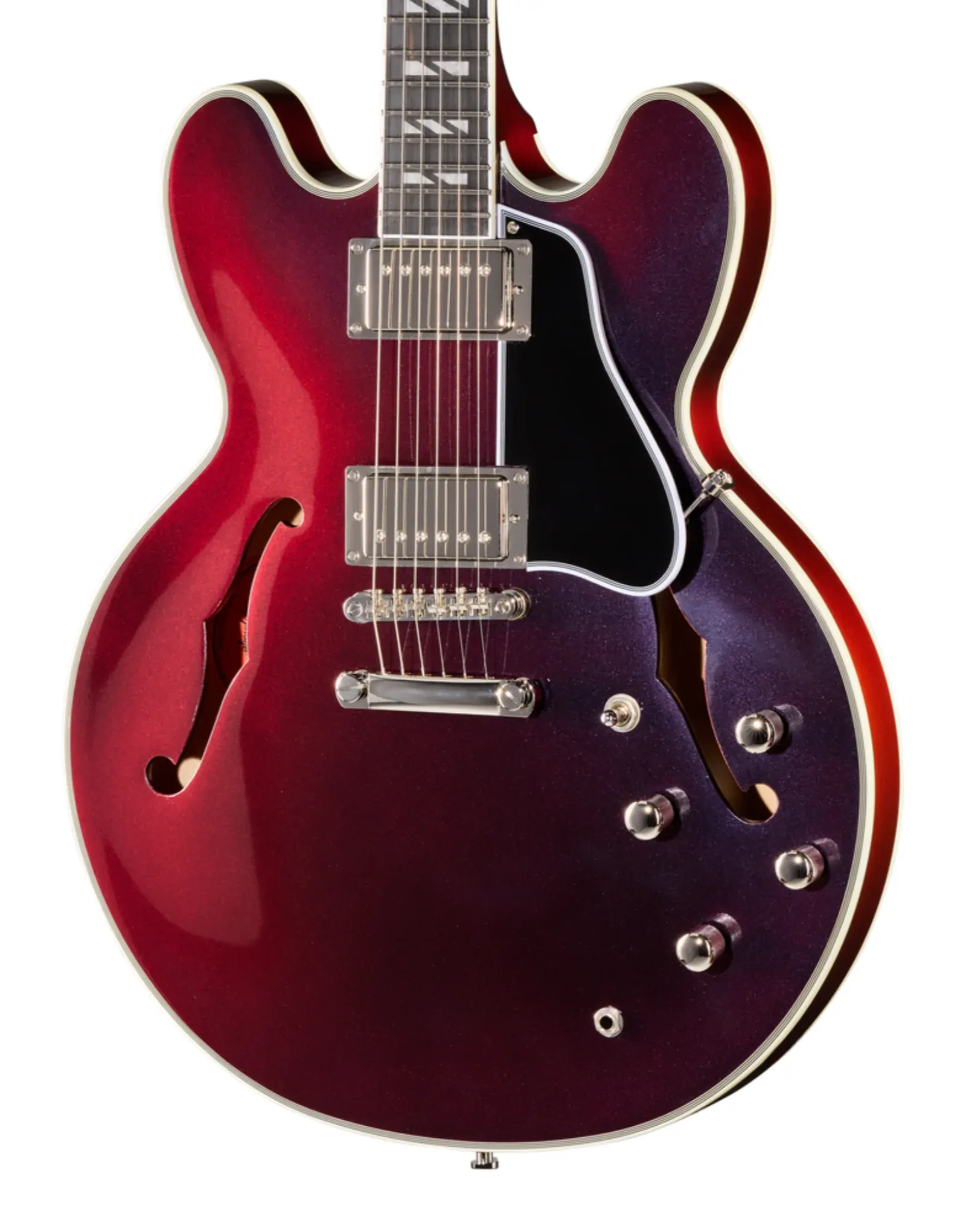 The Epiphone Futura ES-355 Thinline Semi-Hollowbody Midnight Ember Shift leans toward a more controlled semi-hollow response, making it easier to manage once you start adding gain. The layered maple and poplar body with a centre block keeps the low end tight and the top end clear, so chords stay separated when you’re playing with a band or stacking parts in the studio.