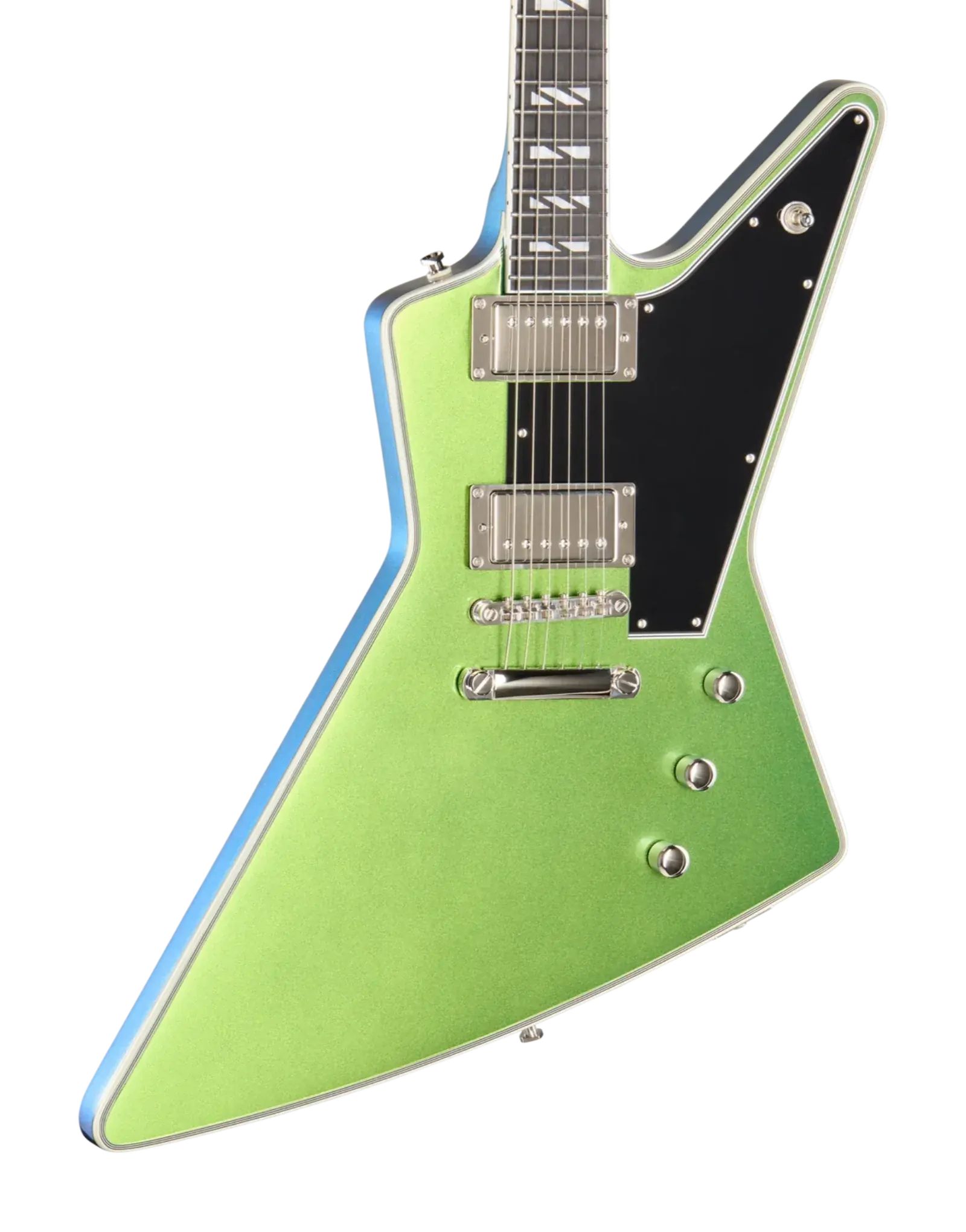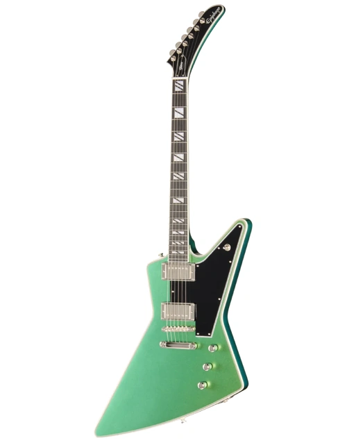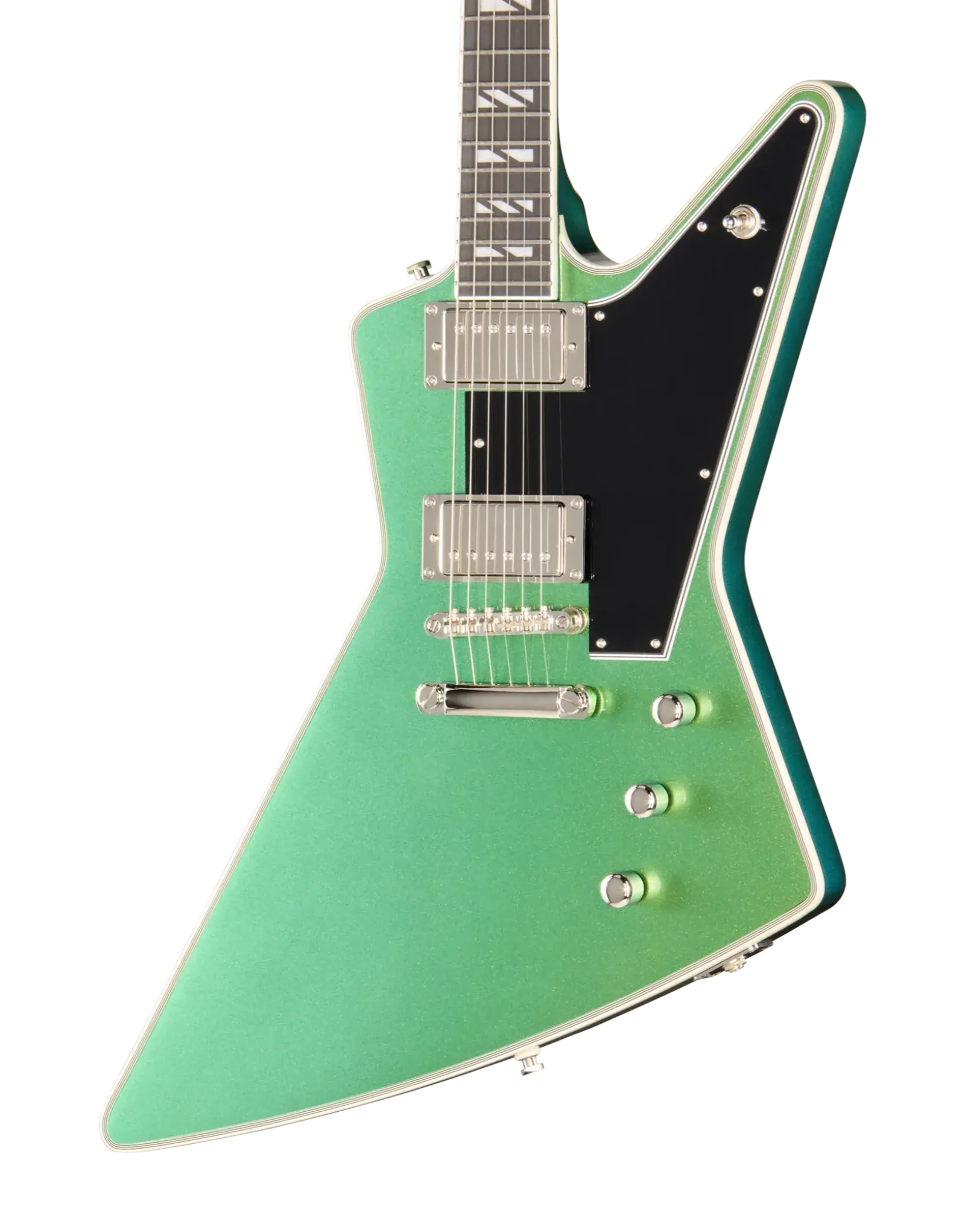 The Epiphone Futura Explorer Custom is built around a solid mahogany body that leans into a heavier, more direct response. There’s no weight relief here, so the low end feels firm and planted, and notes carry with a bit more authority when you start pushing gain, perfect for players who want something that holds together when things get loud.