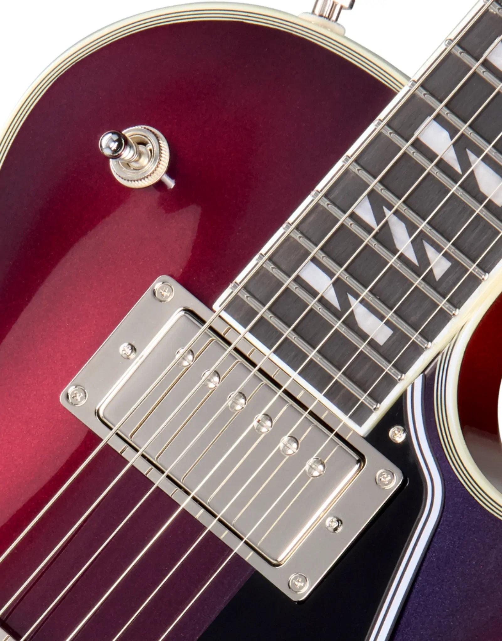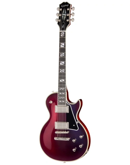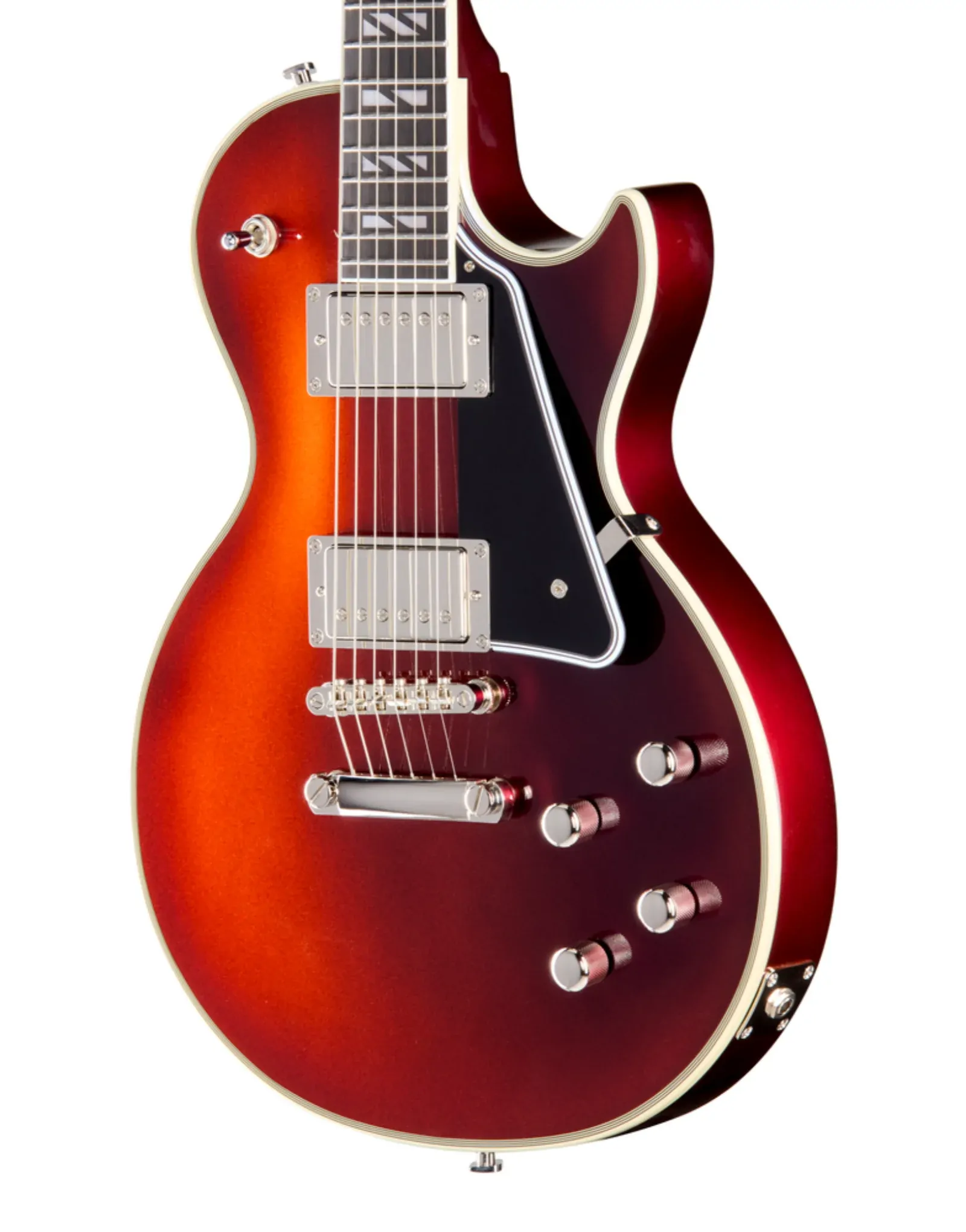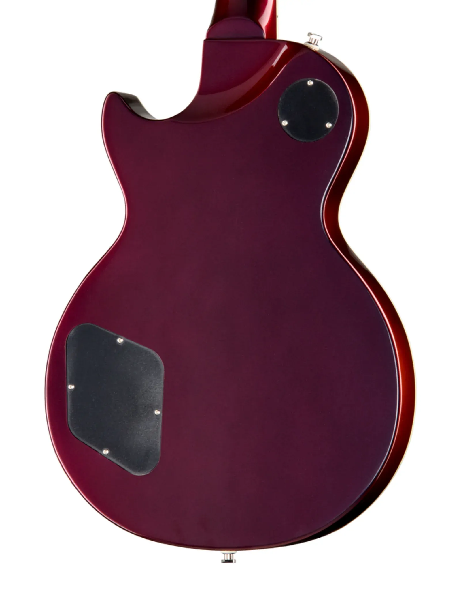 The Epiphone Futura Les Paul Custom Midnight Ember Shift balances weight and clarity in a way that works well once you start pushing an amp. The mahogany body and maple cap combination gives you that familiar low-end push, but there’s enough top-end detail to keep chords from collapsing into each other, especially when you’re stacking parts or playing in a full band.