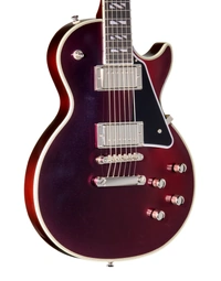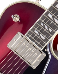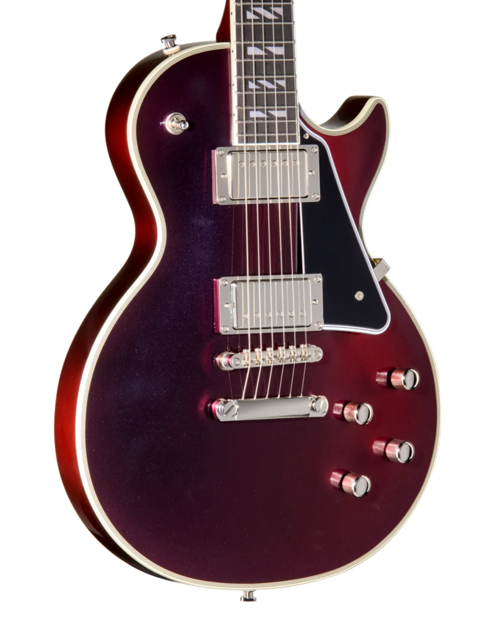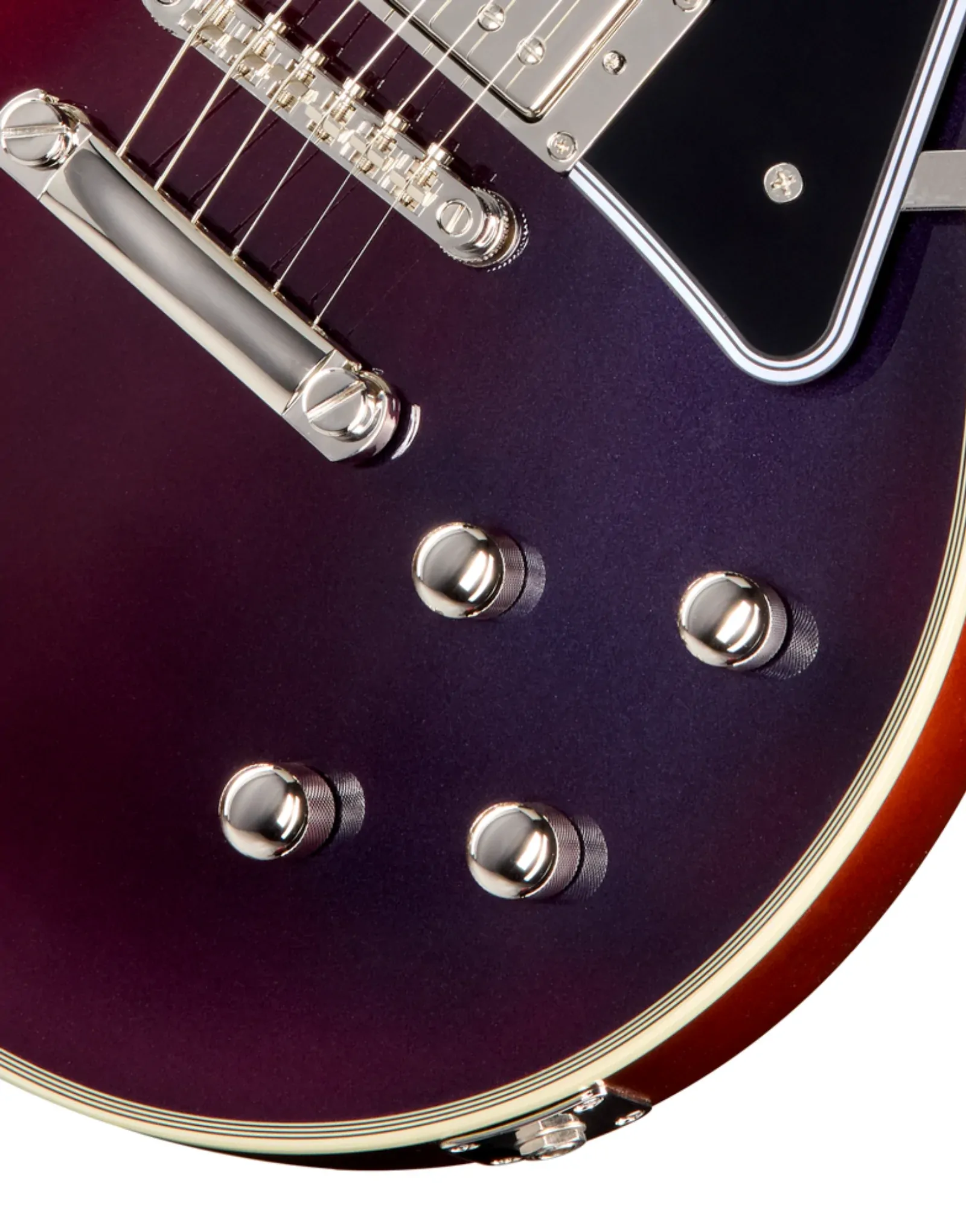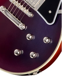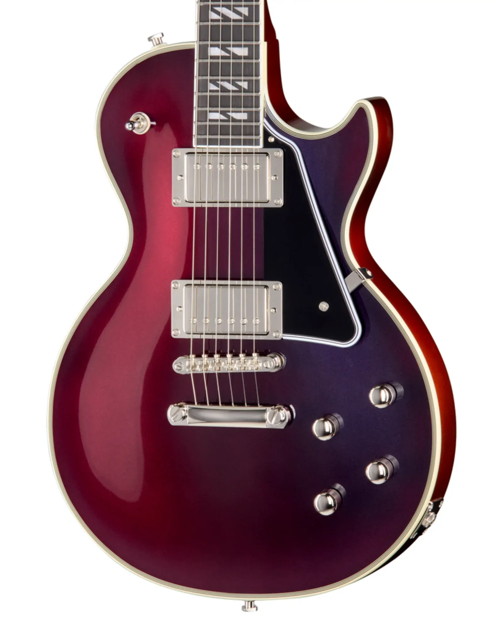 The Epiphone Futura Les Paul Custom Midnight Ember Shift balances weight and clarity in a way that works well once you start pushing an amp. The mahogany body and maple cap combination gives you that familiar low-end push, but there’s enough top-end detail to keep chords from collapsing into each other, especially when you’re stacking parts or playing in a full band.