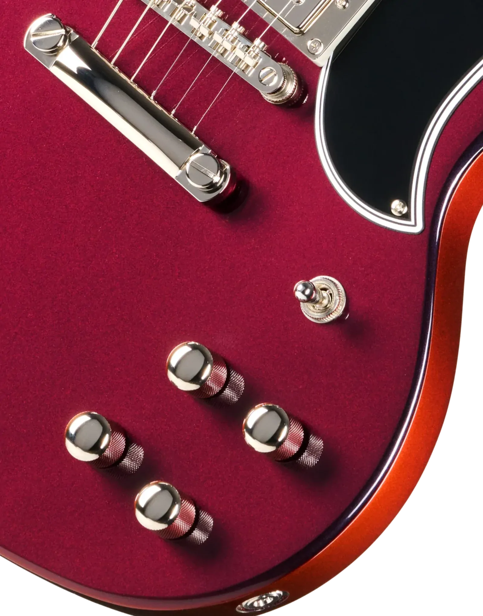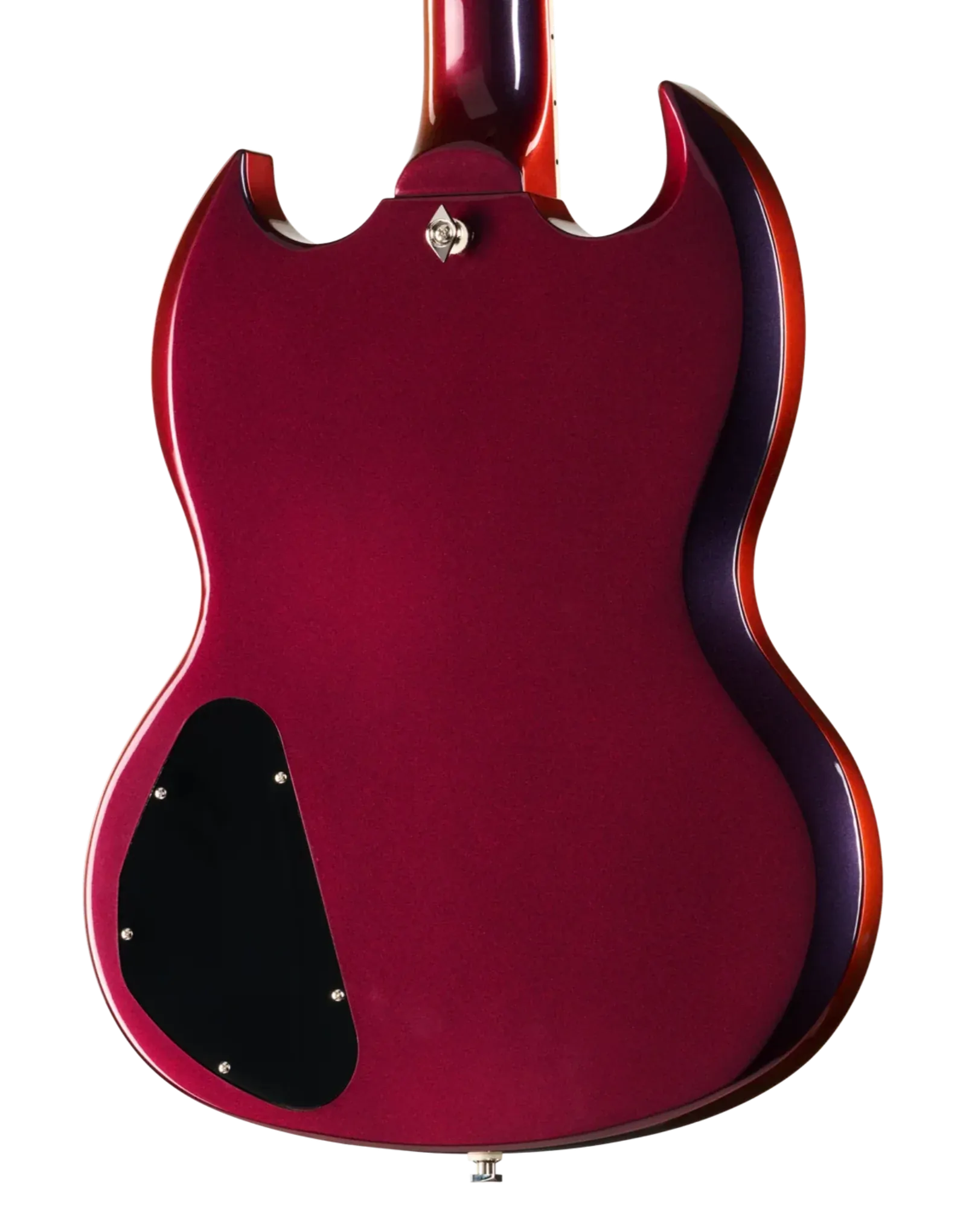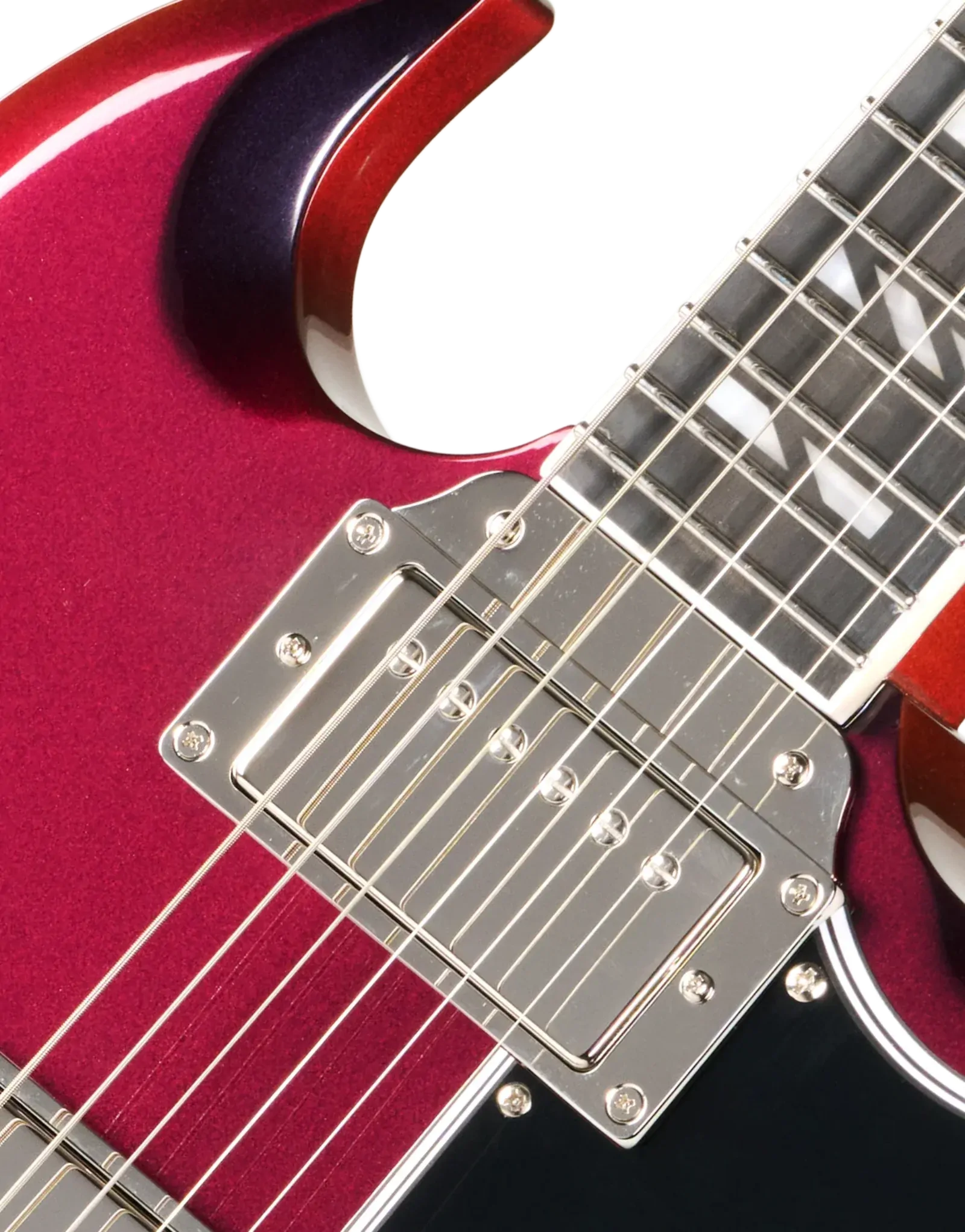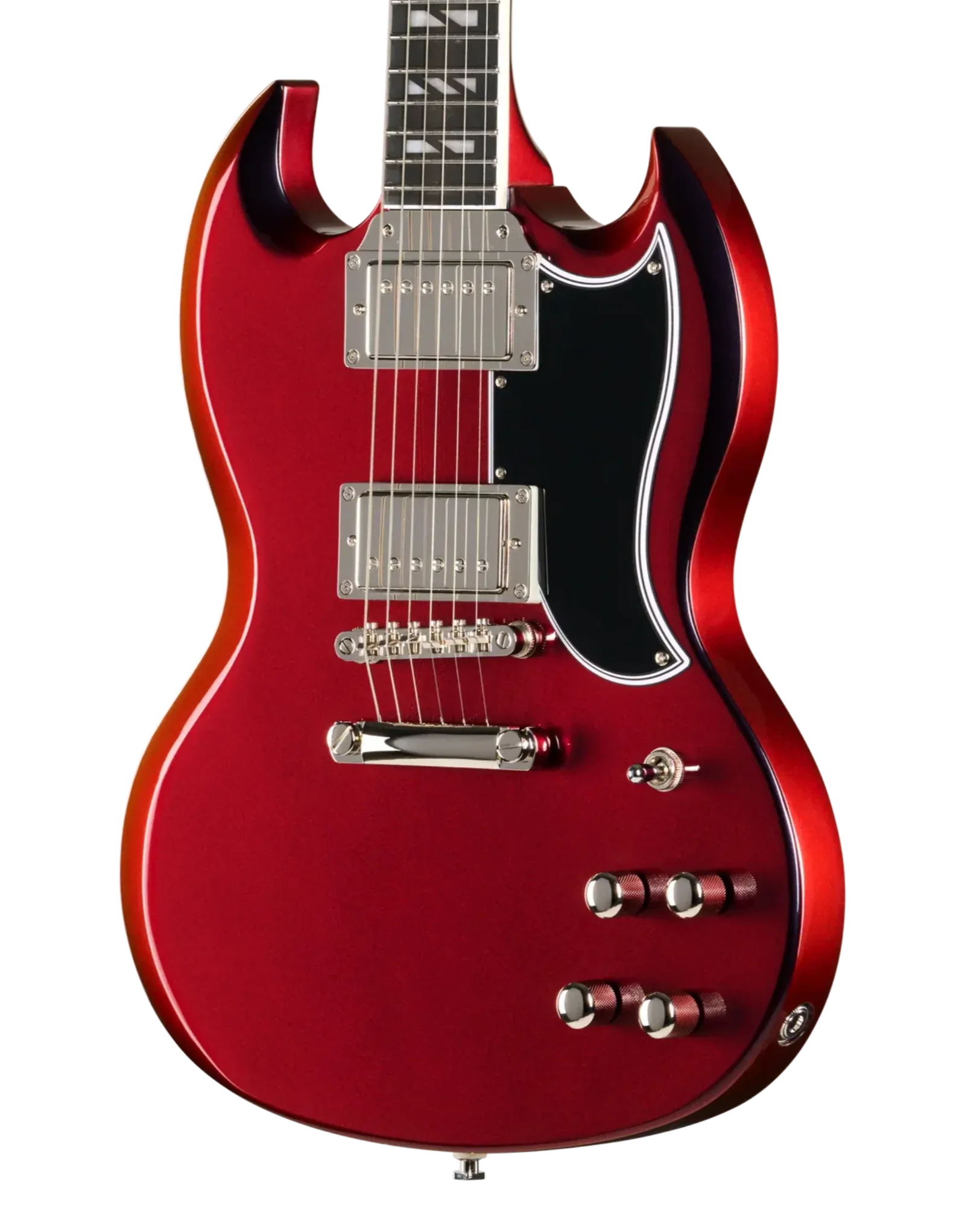 The Epiphone Futura SG Custom Midnight Ember Shift keeps that direct, immediate response SG players tend to like, but with a bit more control when you start adding gain. The all-mahogany body gives you a strong midrange presence, while still leaving enough top-end detail for chords to stay separated when you’re playing with a band or layering parts.