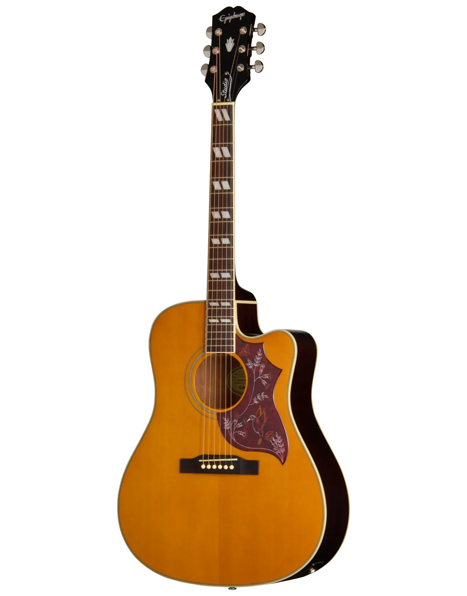 The Epiphone Hummingbird Studio EC in Antique Natural combines the timeless elegance of Gibson’s legendary Hummingbird with the modern playability of a cutaway design. Its square-shoulder dreadnought body and solid spruce top deliver a full, balanced tone that suits both strumming and fingerpicking, while the layered mahogany back and sides add warmth and depth. The mahogany neck features a comfortable Rounded C profile and a bound rosewood fretboard with classic split parallelogram inlays, ensuring smooth playability and vintage style. The distinctive tortoise shell pickguard, Kalamazoo-style headstock, and multi-ply binding all pay tribute to the original Hummingbird’s iconic aesthetic. Equipped with Fishman Presys II electronics and an onboard tuner, it’s ready for the stage or studio straight out of the box. Finished in a natural gloss and supplied with a gig bag, it’s the perfect mix of heritage and practicality.