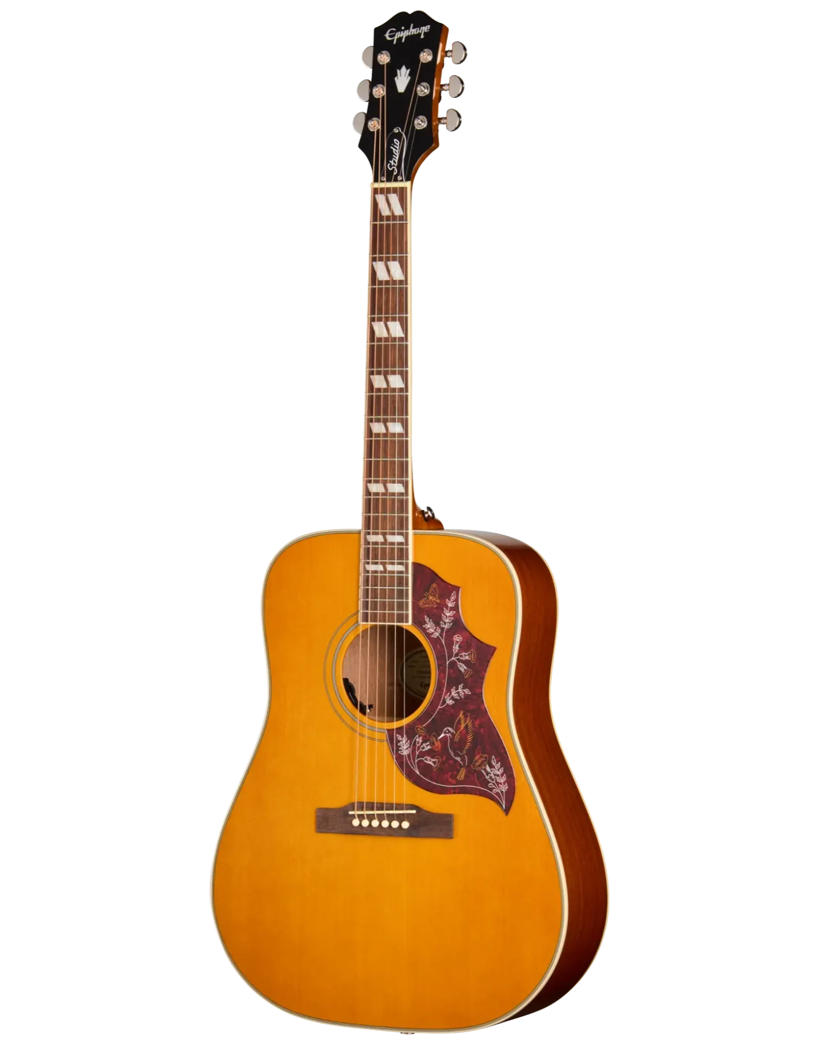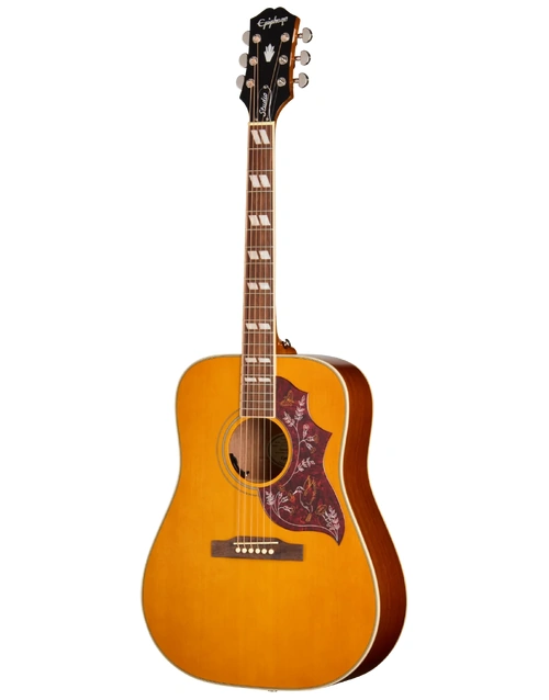 The Epiphone Hummingbird Studio in Antique Natural delivers the iconic look and feel of one of the world’s most recognisable acoustic guitars in an accessible, stage-ready format. Based on the legendary Gibson Hummingbird, this square-shouldered dreadnought combines a solid spruce top with layered mahogany back and sides for a warm, articulate tone that improves with age. The mahogany neck features a rounded C profile and a bound rosewood fretboard with classic split parallelogram inlays for a smooth, vintage playing experience. With elegant binding, a detailed Hummingbird pickguard, and Grover Rotomatic tuners, it’s a visually striking instrument built for reliability. Equipped with Fishman Presys VT electronics and discreet soundhole-mounted controls, it delivers a natural amplified tone with ease. Finished in Antique Natural and supplied with a gig bag, the Hummingbird Studio blends tradition, beauty, and performance.
