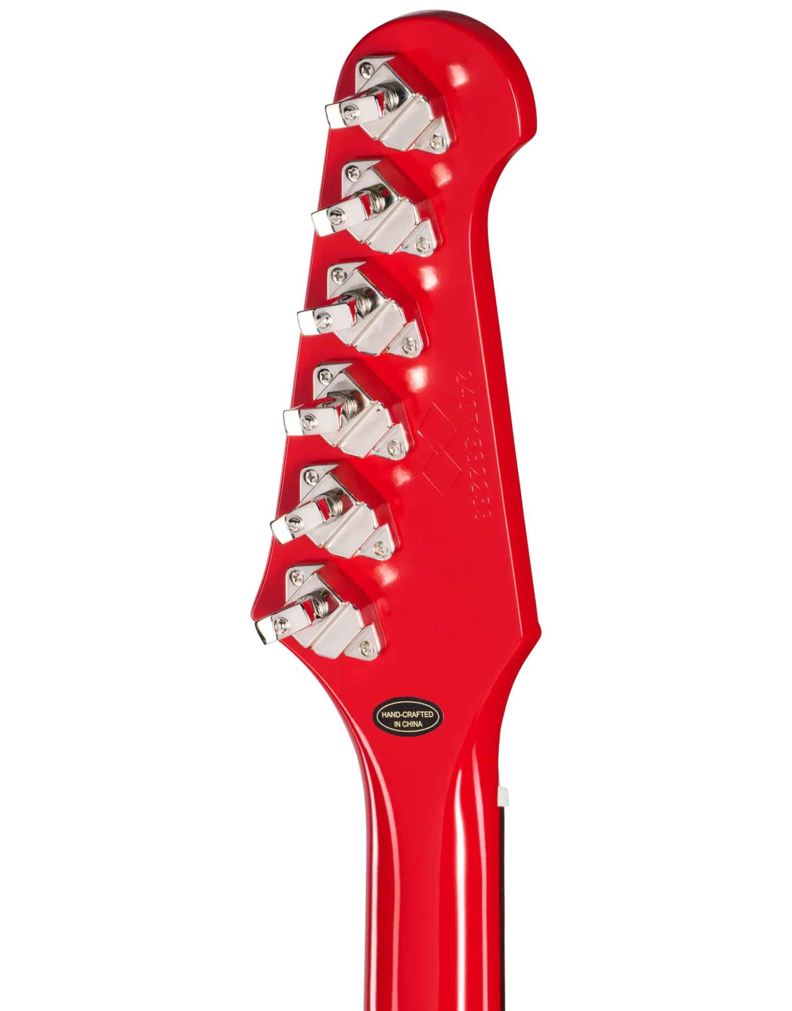 The Epiphone 1963 Firebird I Reissue in Cardinal Red delivers vintage-spec construction and tone in a modern, accessible format. Built in collaboration with Gibson Custom, this reissue features a 9-ply mahogany/walnut neck-through-body design with mahogany body wings, delivering excellent resonance and sustain. A single Gibson USA Firebird mini humbucker paired with CTS pots, a Mallory capacitor, and Switchcraft jack provides the bright, punchy tone Firebirds are known for. Kluson banjo-style tuners, a wraparound Lightning Bar bridge, and Vintage Gloss finish complete the retro styling, while the included Epiphone Inspired by Gibson Custom hardshell case ensures it travels safely.