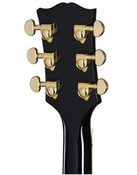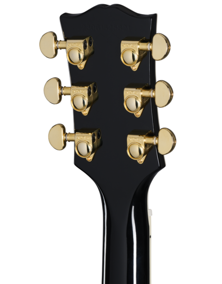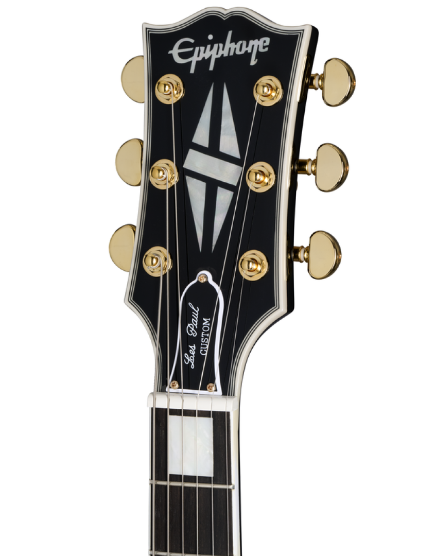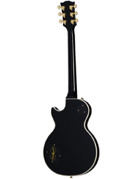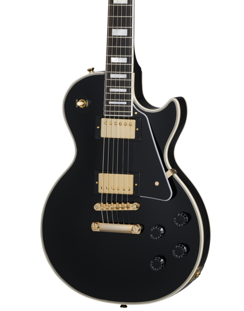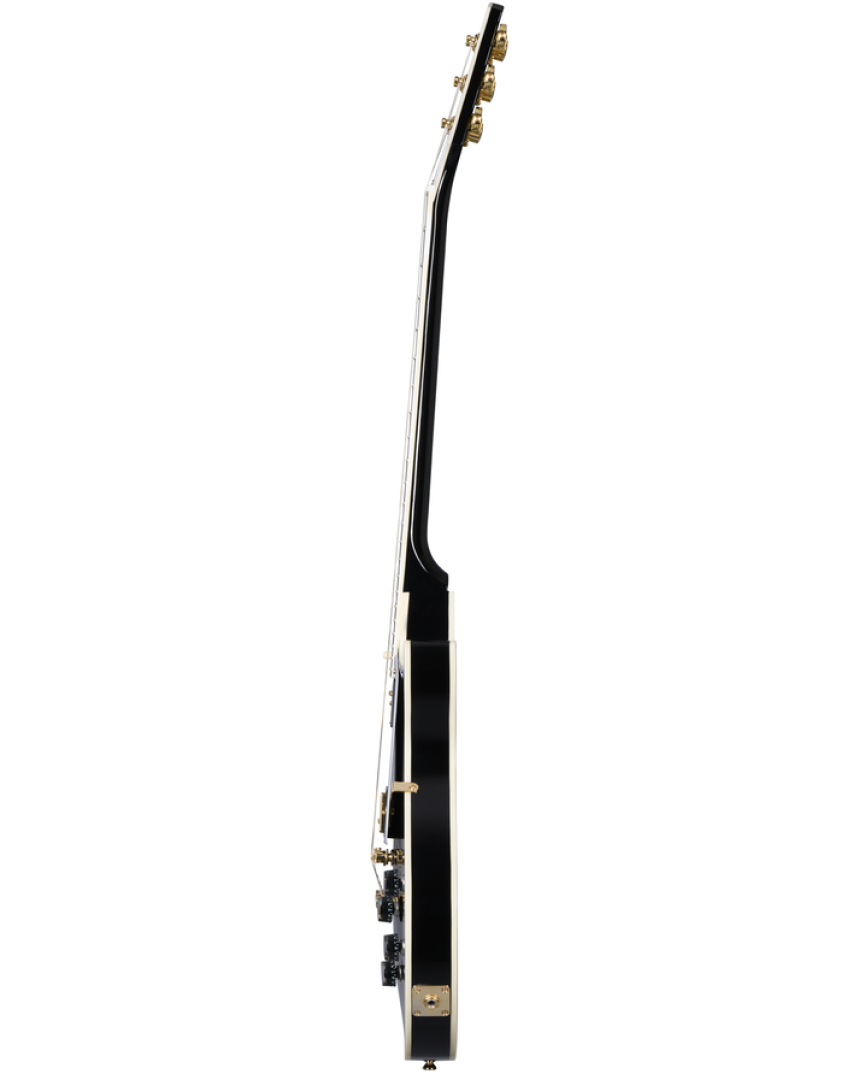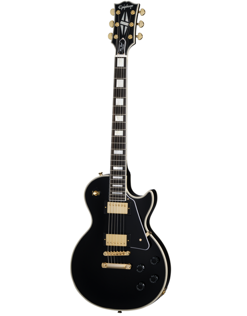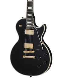 Introducing the Epiphone Inspired By Custom Shop Les Paul Custom Ebony, a masterpiece born from the collaboration with Gibson Custom. As the flagship model in the Inspired by Gibson Custom lineup, this guitar exudes elegance with its iconic "tuxedo" appointments. Crafted with a one-piece mahogany neck featuring a 50s Rounded C profile and an ebony fretboard adorned with mother-of-pearl block inlays, it offers both style and playability. The mother-of-pearl split diamond and Epiphone logo headstock inlays add to its classic charm. Enhanced with gold hardware, including Grover Rotomatic tuners, this Les Paul Custom boasts visual appeal and reliability. Its solid mahogany body with a maple cap delivers rich, biting tones, complemented by Gibson USA 490R and 498T pickups wired to premium CTS potentiometers, Mallory caps and Switchcraft components. Complete with an Inspired by Gibson Custom double diamond logo on the headstock and a black hard-shell case with goldenrod interior, this guitar is a true gem.