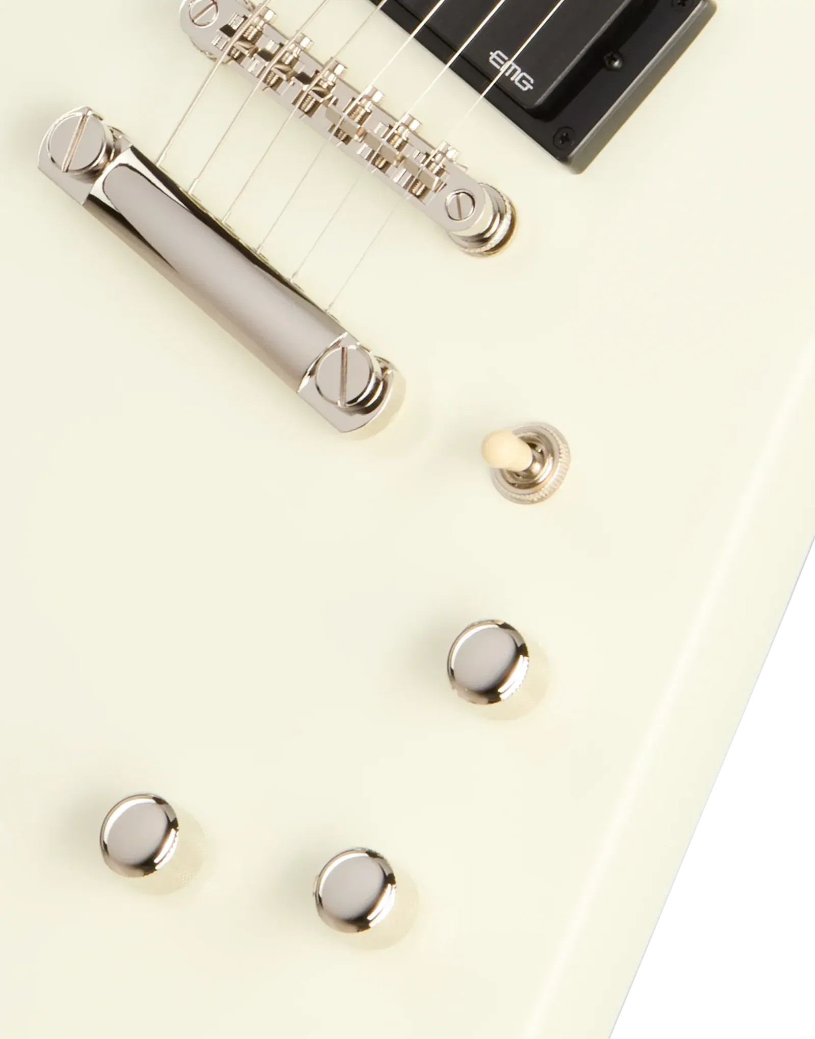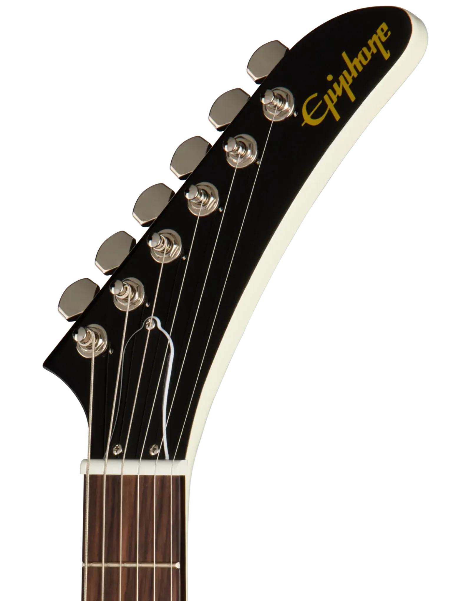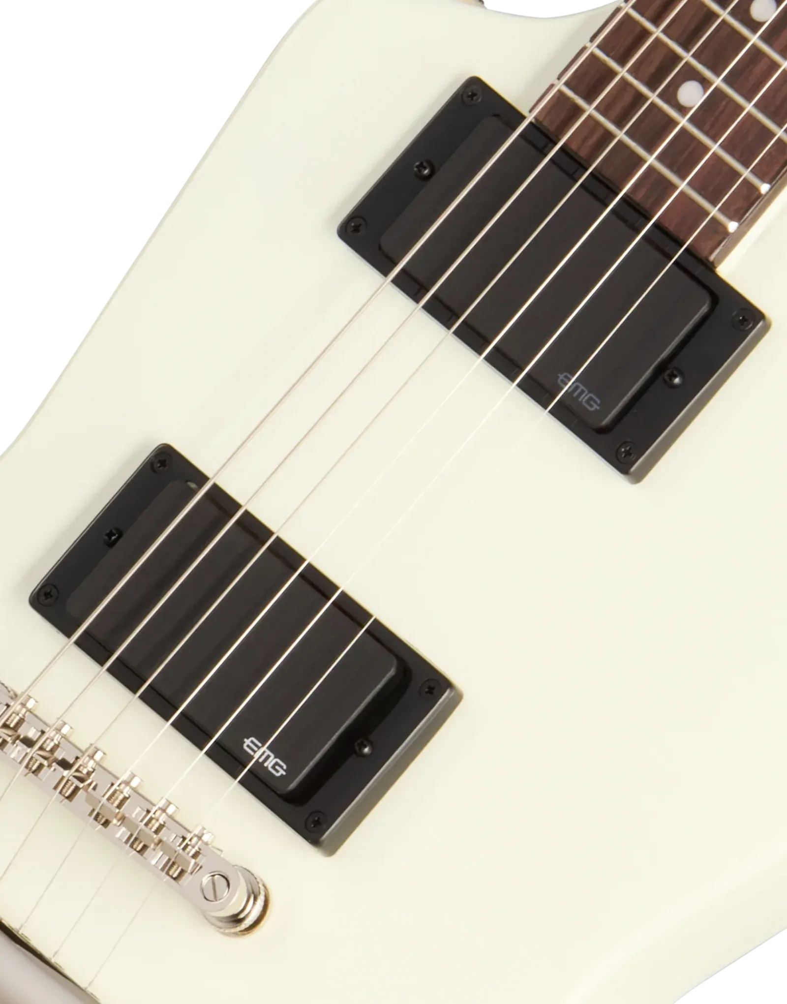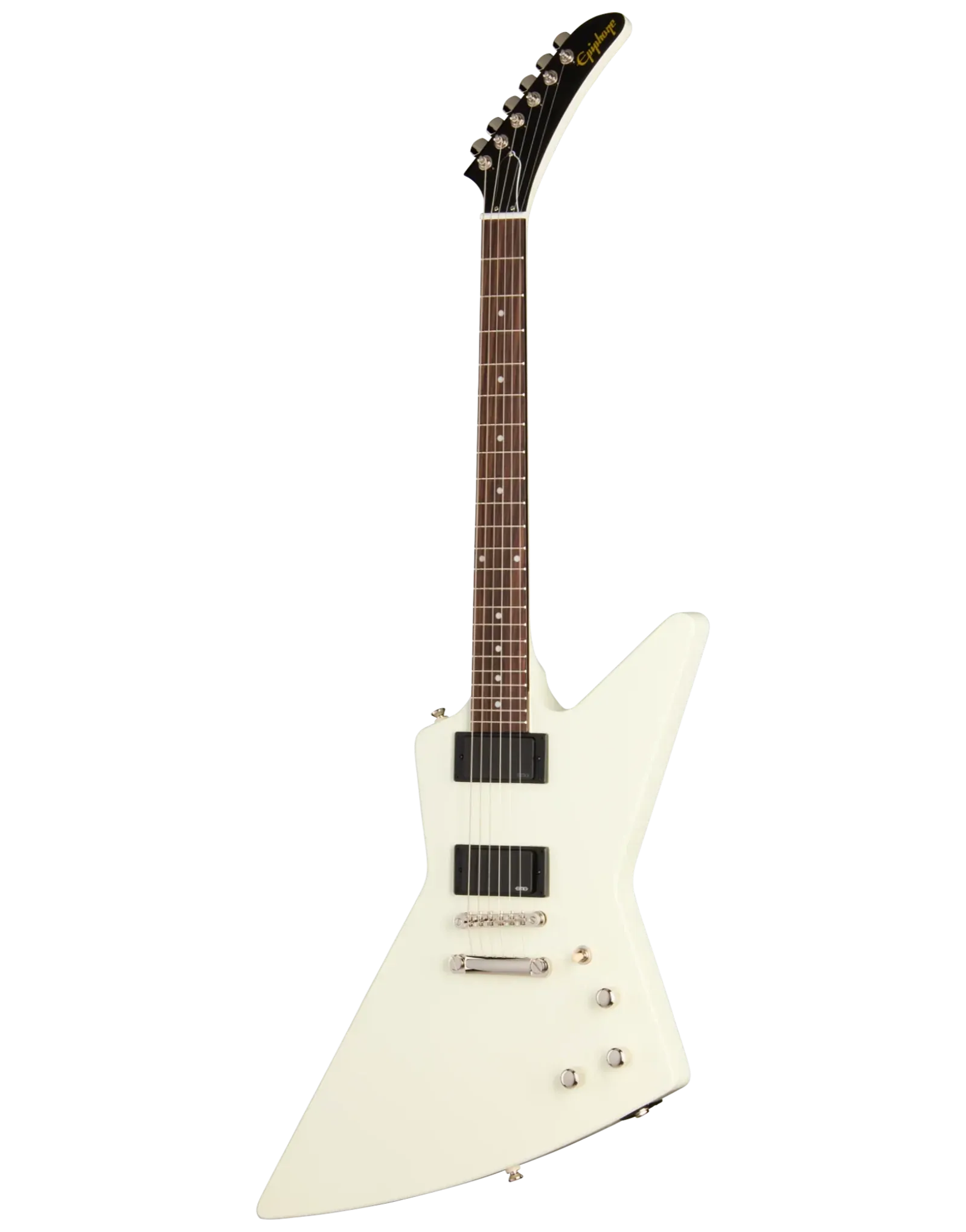 The Epiphone Inspired By Explorer ’80s EMG Classic White delivers the aggressive response and sustain associated with high-output active pickups in a full mahogany platform. A mahogany body and glued-in mahogany neck create a dense, resonant foundation that supports strong low-end weight and extended sustain. The 24.75" (628.65 mm) scale length slightly reduces string tension compared to longer scales, contributing to a smoother feel under bends and fast rhythm work.