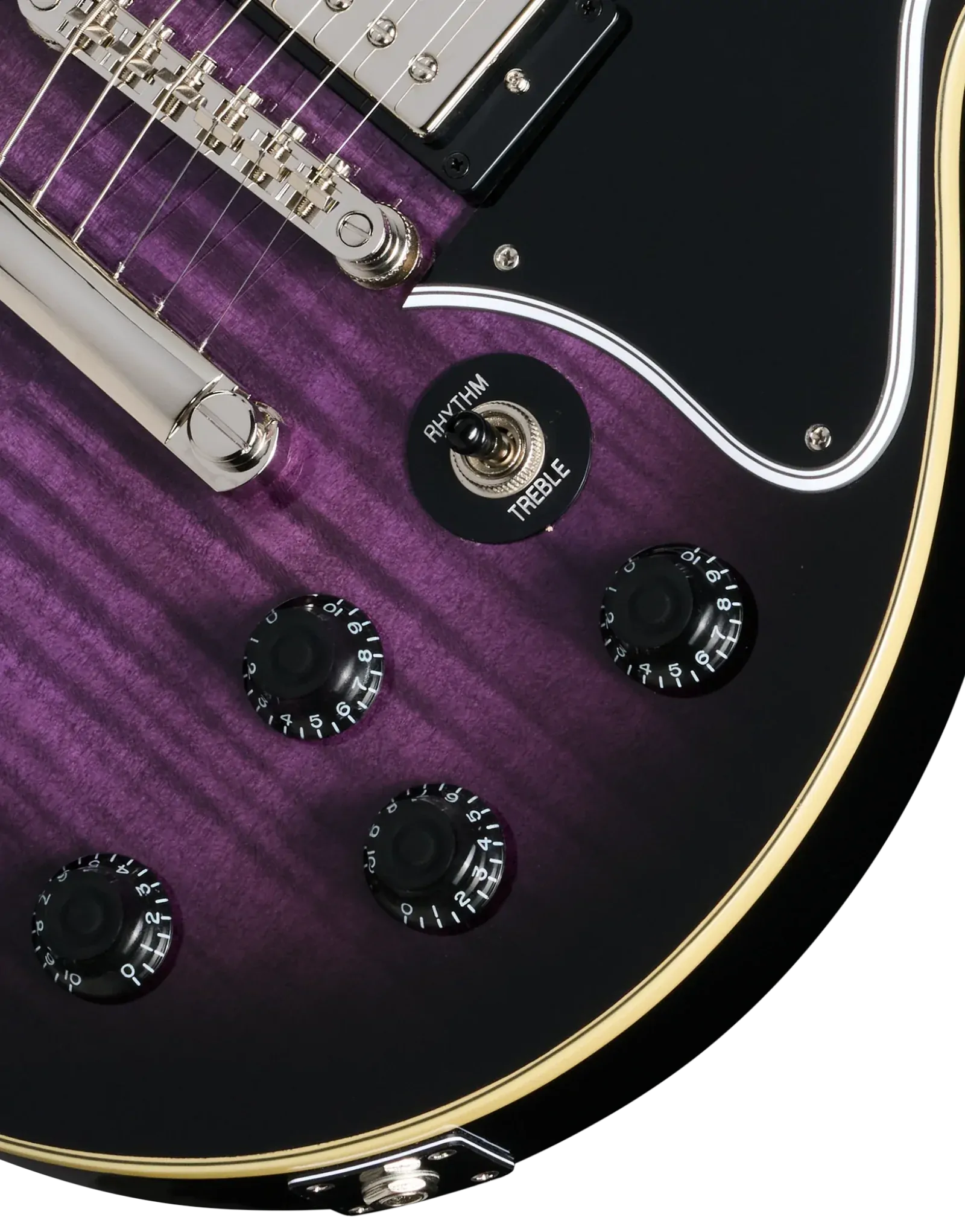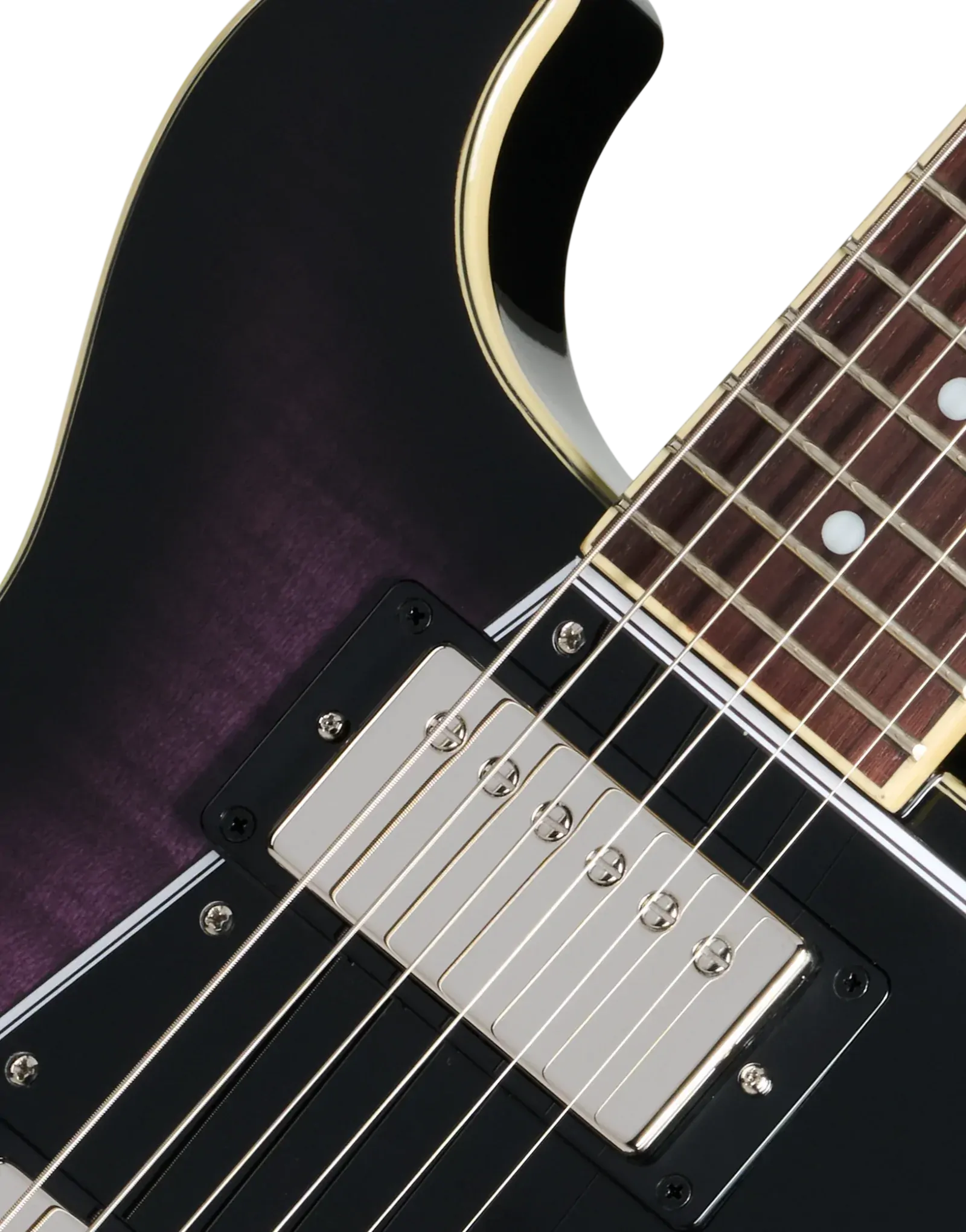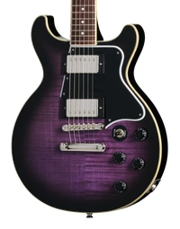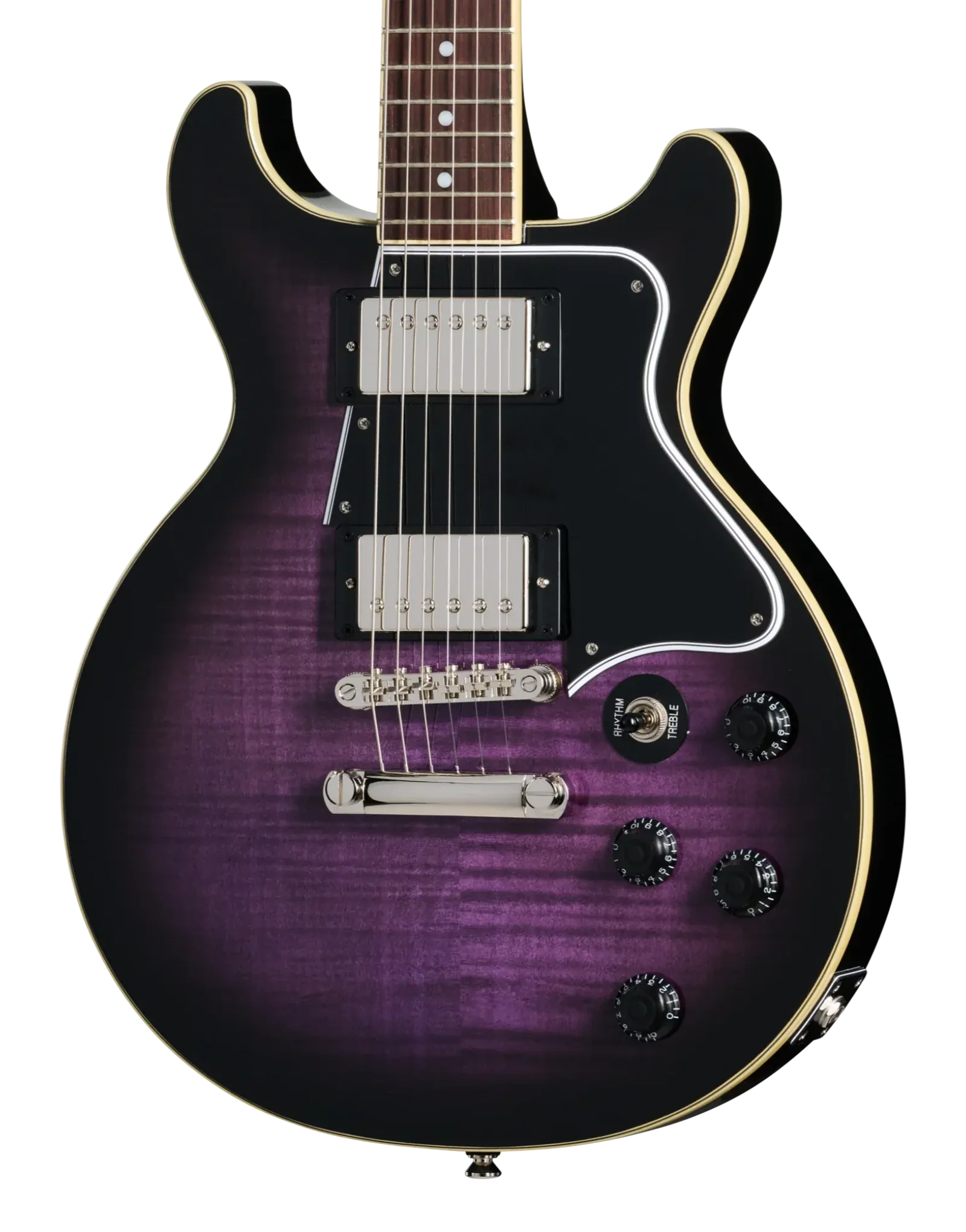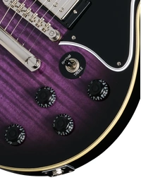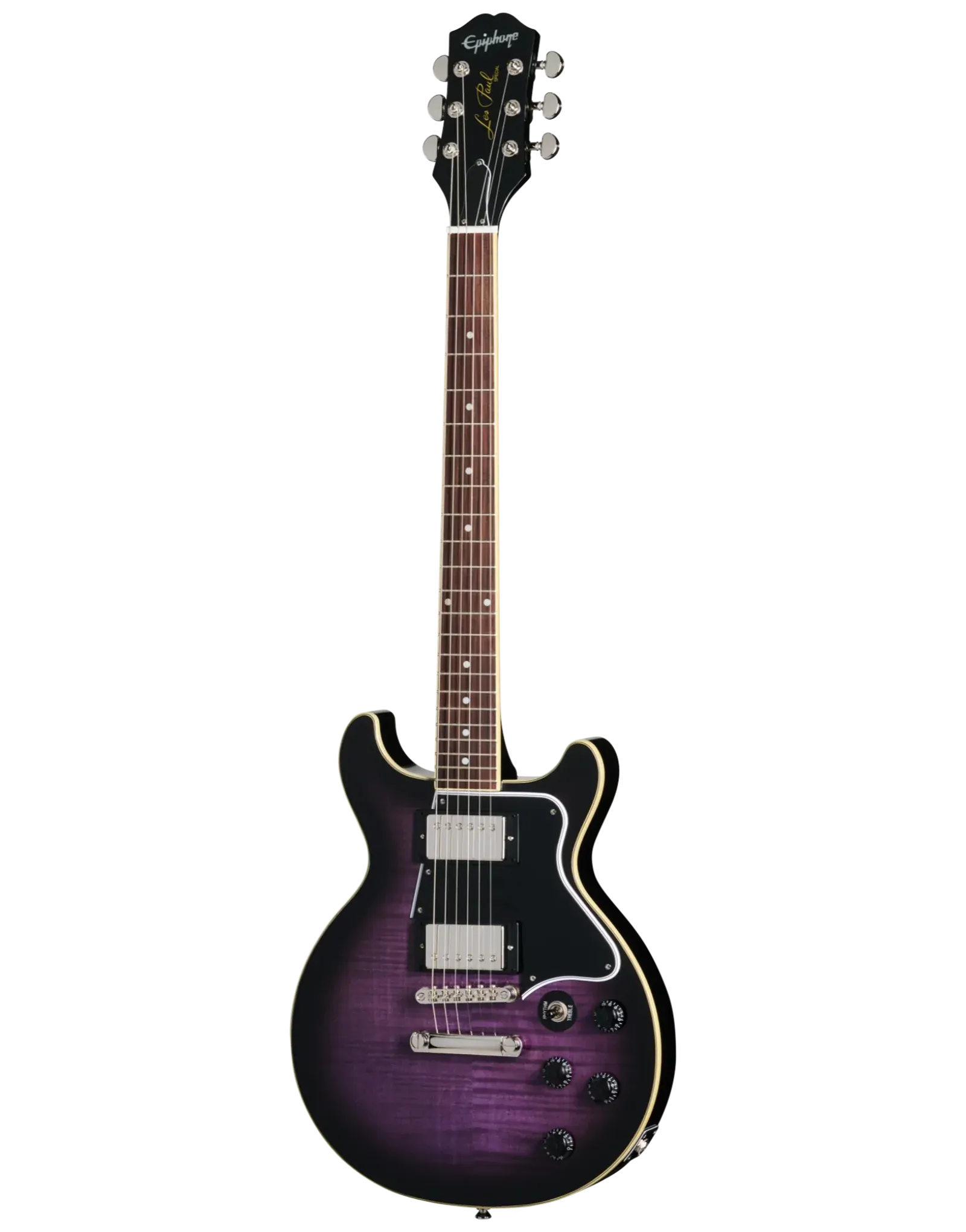 The Epiphone Inspired By Les Paul Special Double Cut Figured Dark Purple Burst blends vintage Les Paul Special heritage with bold modern styling. Its mahogany double cutaway body delivers warm midrange punch and strong sustain, while the AAA figured maple veneer top adds brightness and visual depth. The double cut design enhances upper-fret access, making it easier to explore lead lines and higher-register phrasing.