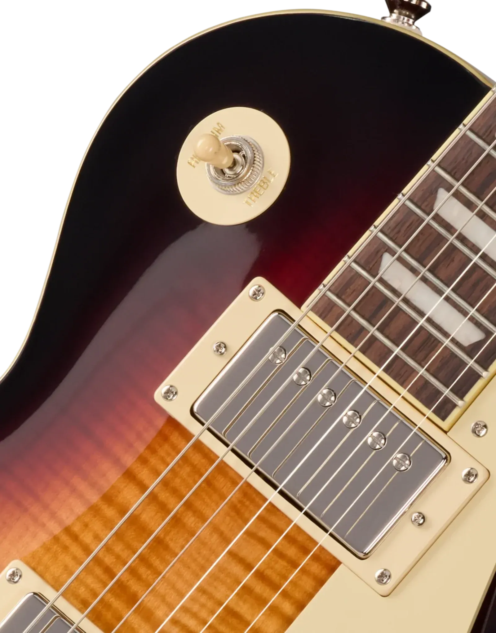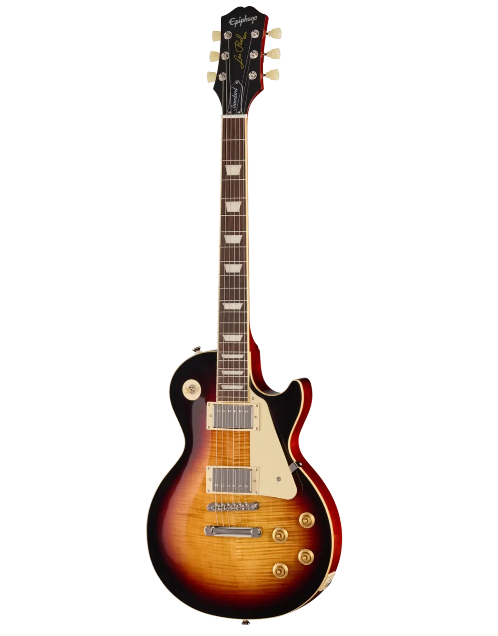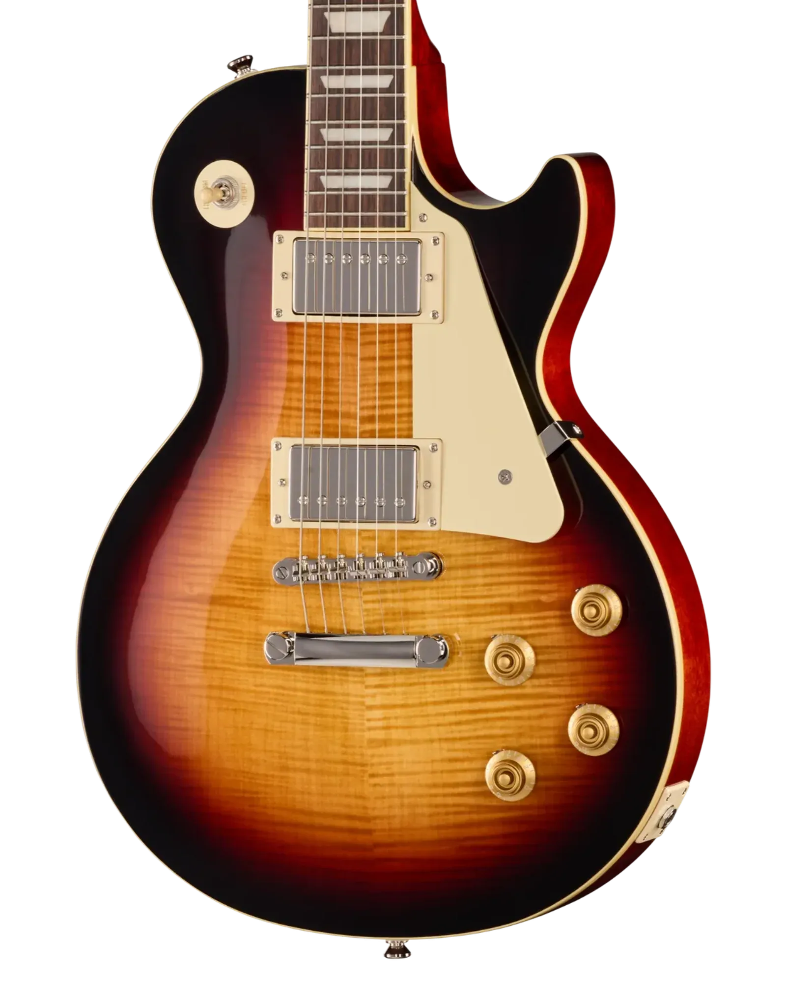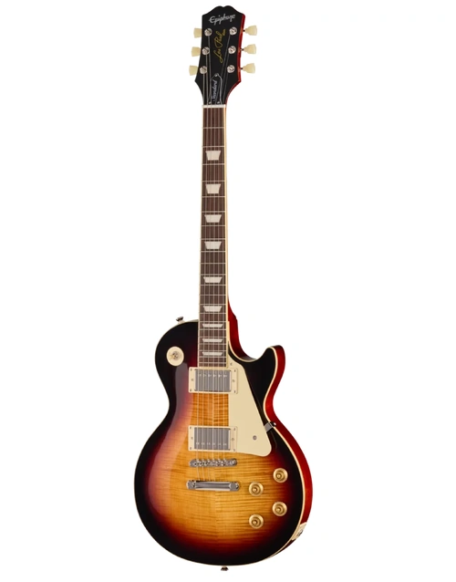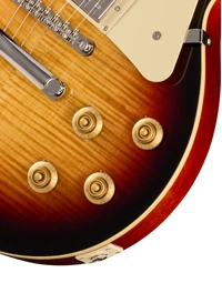 The Epiphone Inspired By Les Paul Standard '50s Bourbon Burst delivers the core elements of a classic Les Paul, combining a mahogany body with a maple cap for a tone that balances warmth, sustain, and clarity. The figured maple veneer adds visual depth without changing the fundamental response, keeping the focus on that familiar midrange push and rounded low end.