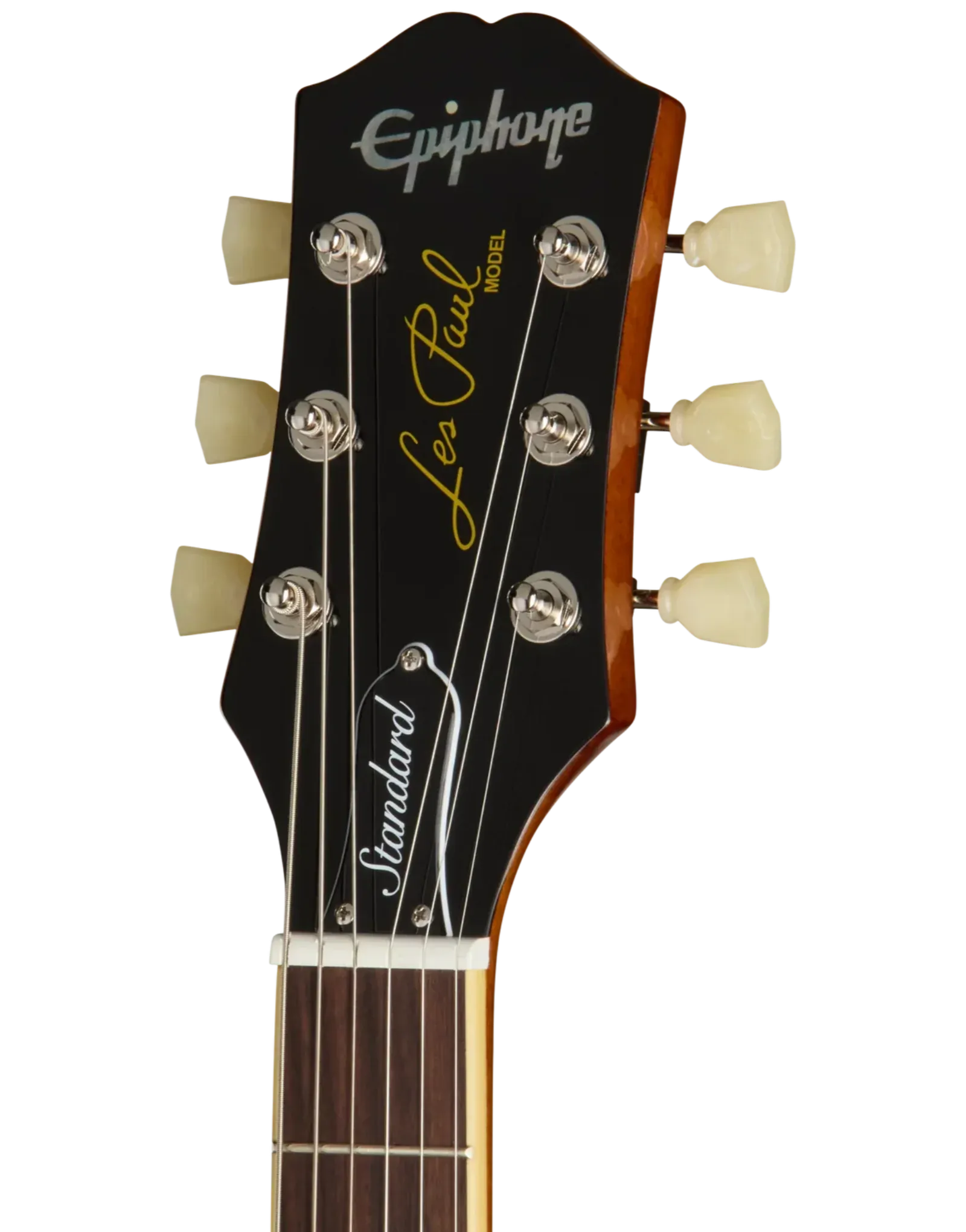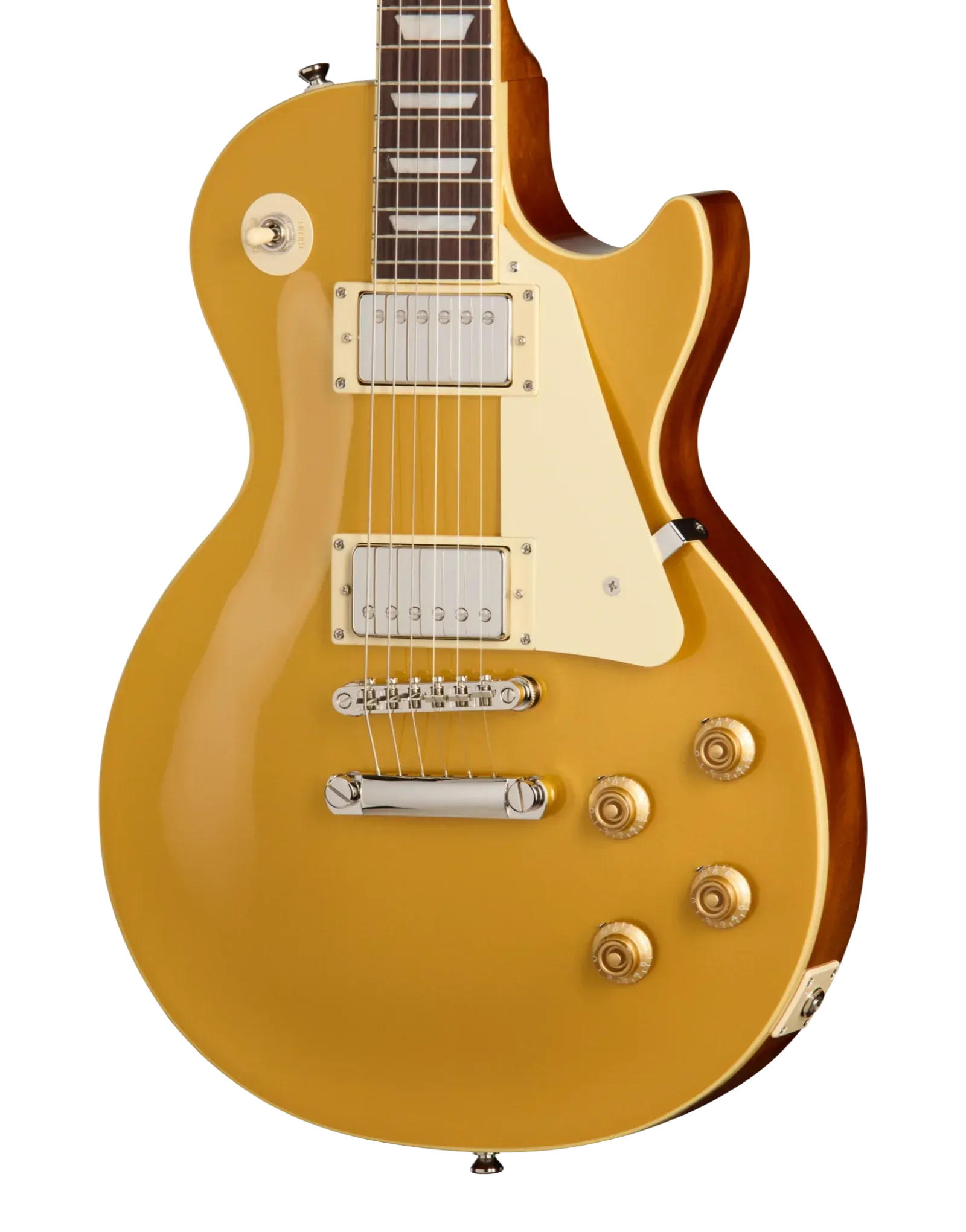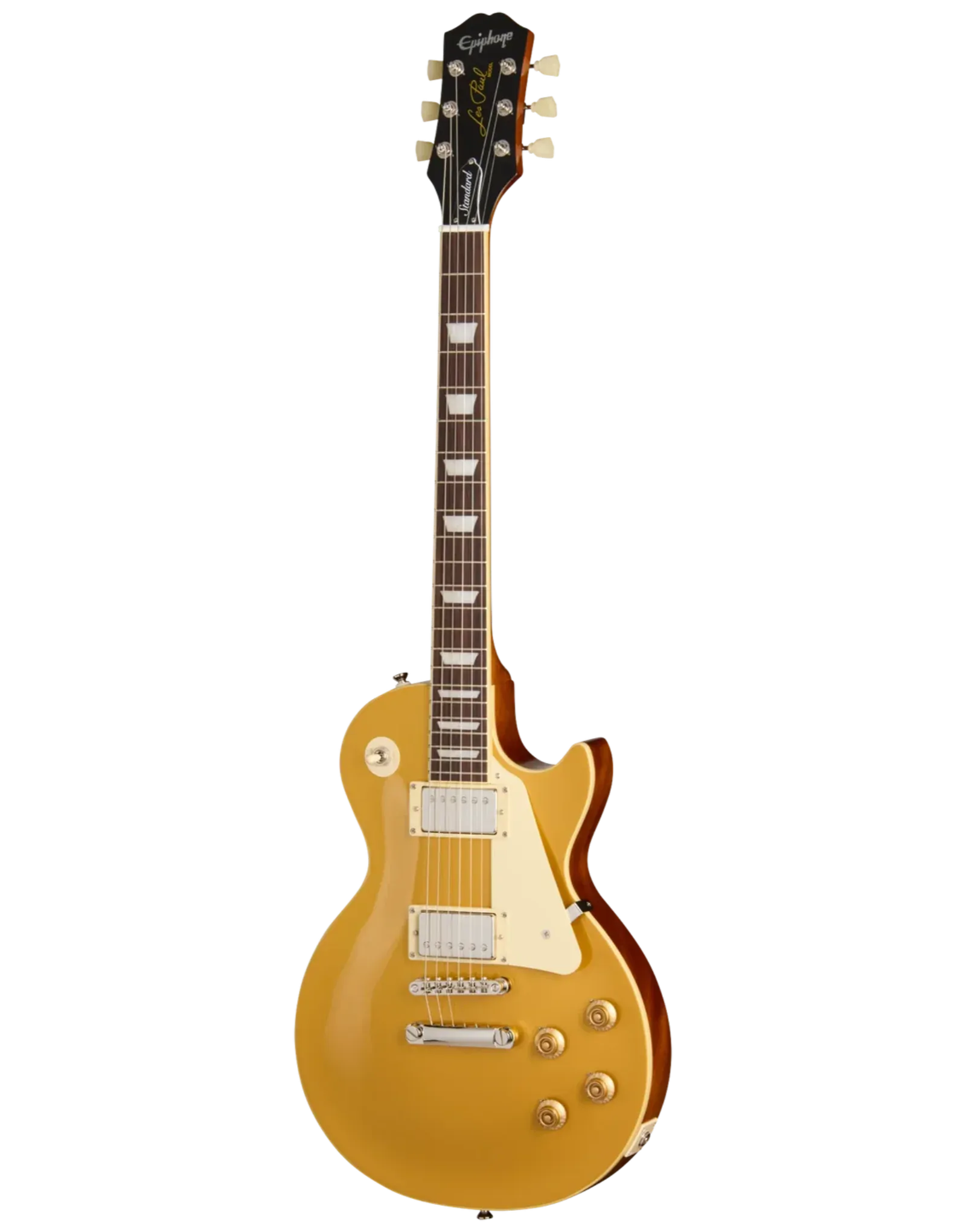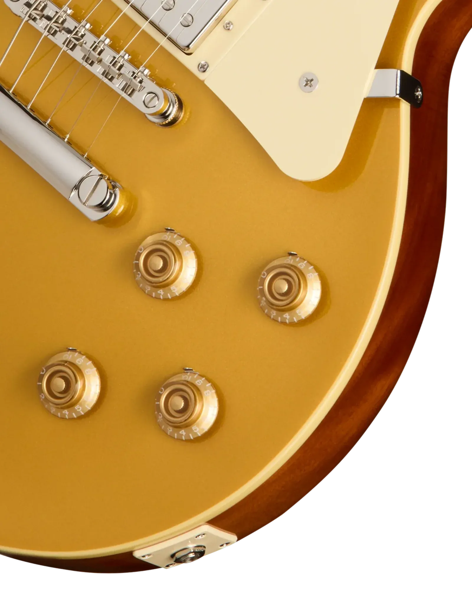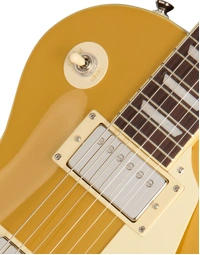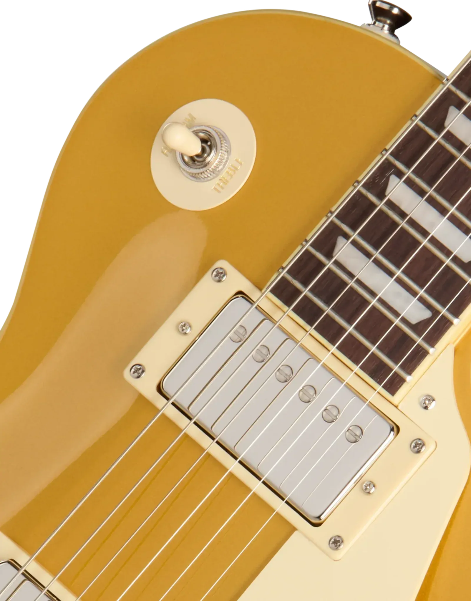 Epiphone Inspired By Les Paul Standard 50s Goldtop is built around the classic mahogany and maple construction that defines the voice of many single-cut electric guitars. The mahogany body produces strong midrange presence and natural sustain, while the maple cap introduces brightness and clarity that keeps chords defined under gain. This combination gives the Epiphone Inspired By Les Paul Standard 50s Goldtop a full, focused tone that remains articulate when moving between clean passages and heavier driven sounds.