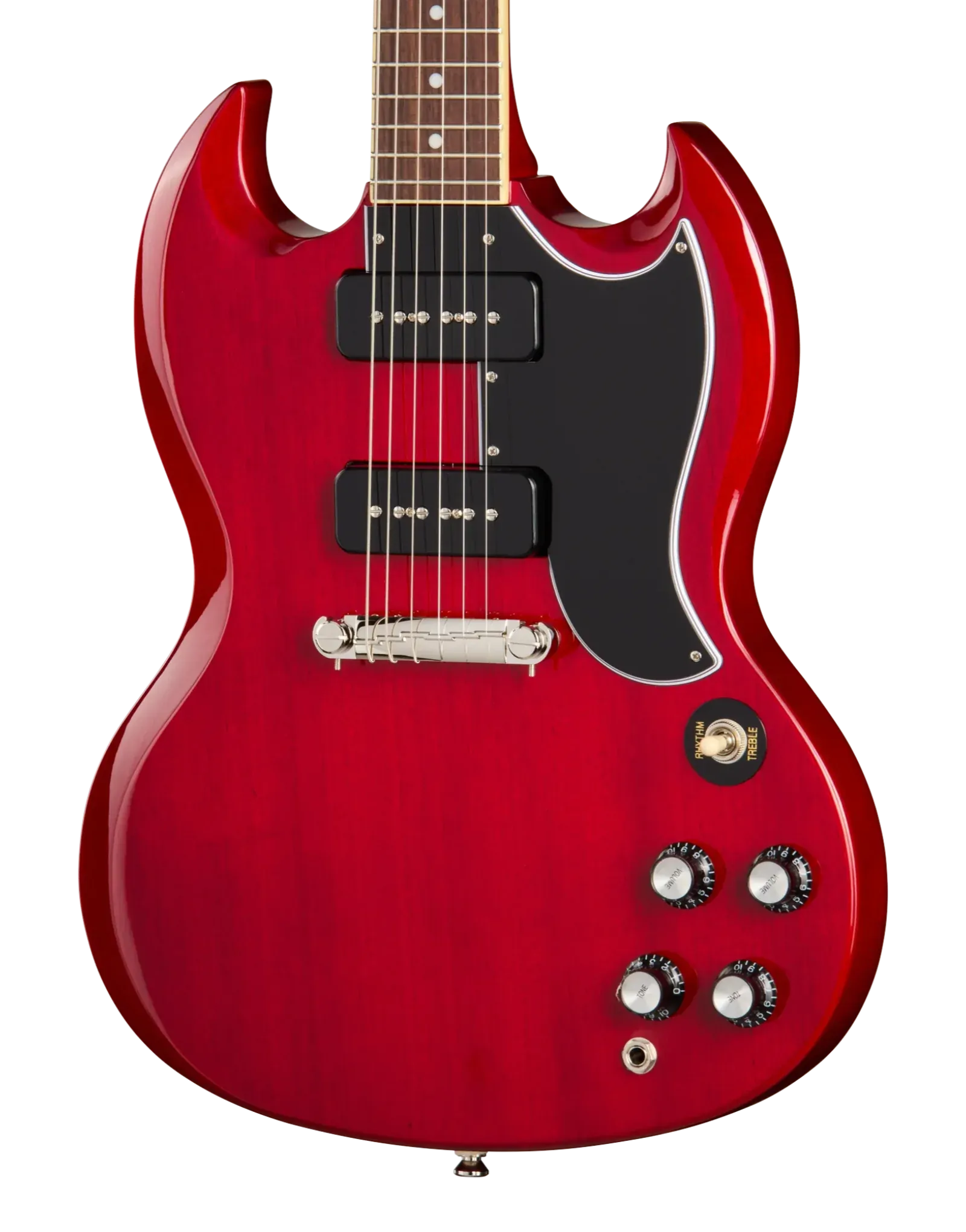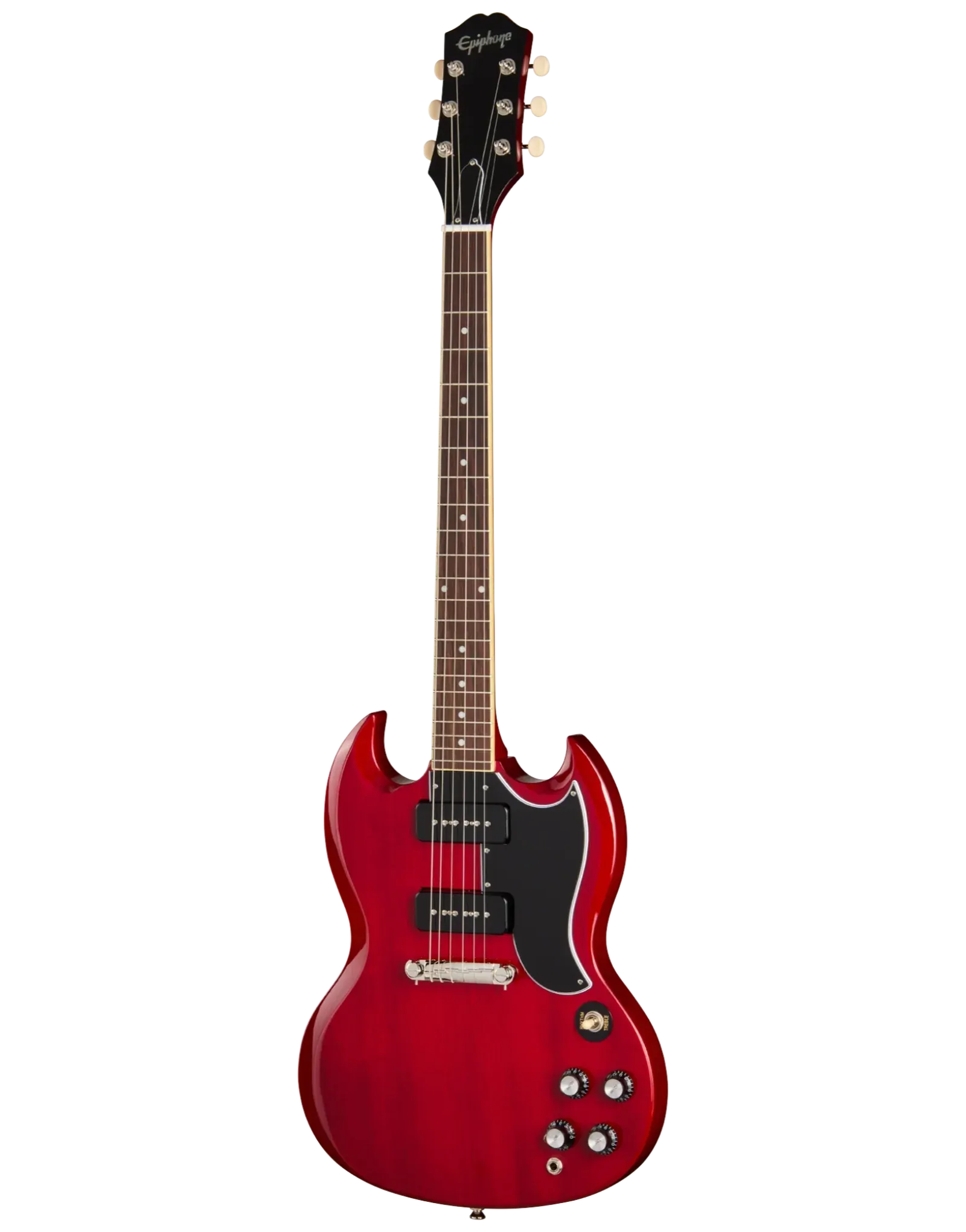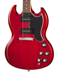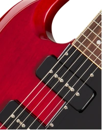 The Epiphone Inspired By SG Special P-90 Cherry delivers raw, articulate tone in a stripped-back double-cut design. Its mahogany body keeps weight balanced while enhancing midrange punch and natural sustain. A glued-in mahogany neck improves resonance, shaped to a fast and comfortable 60s SlimTaper profile for effortless movement across the fretboard.