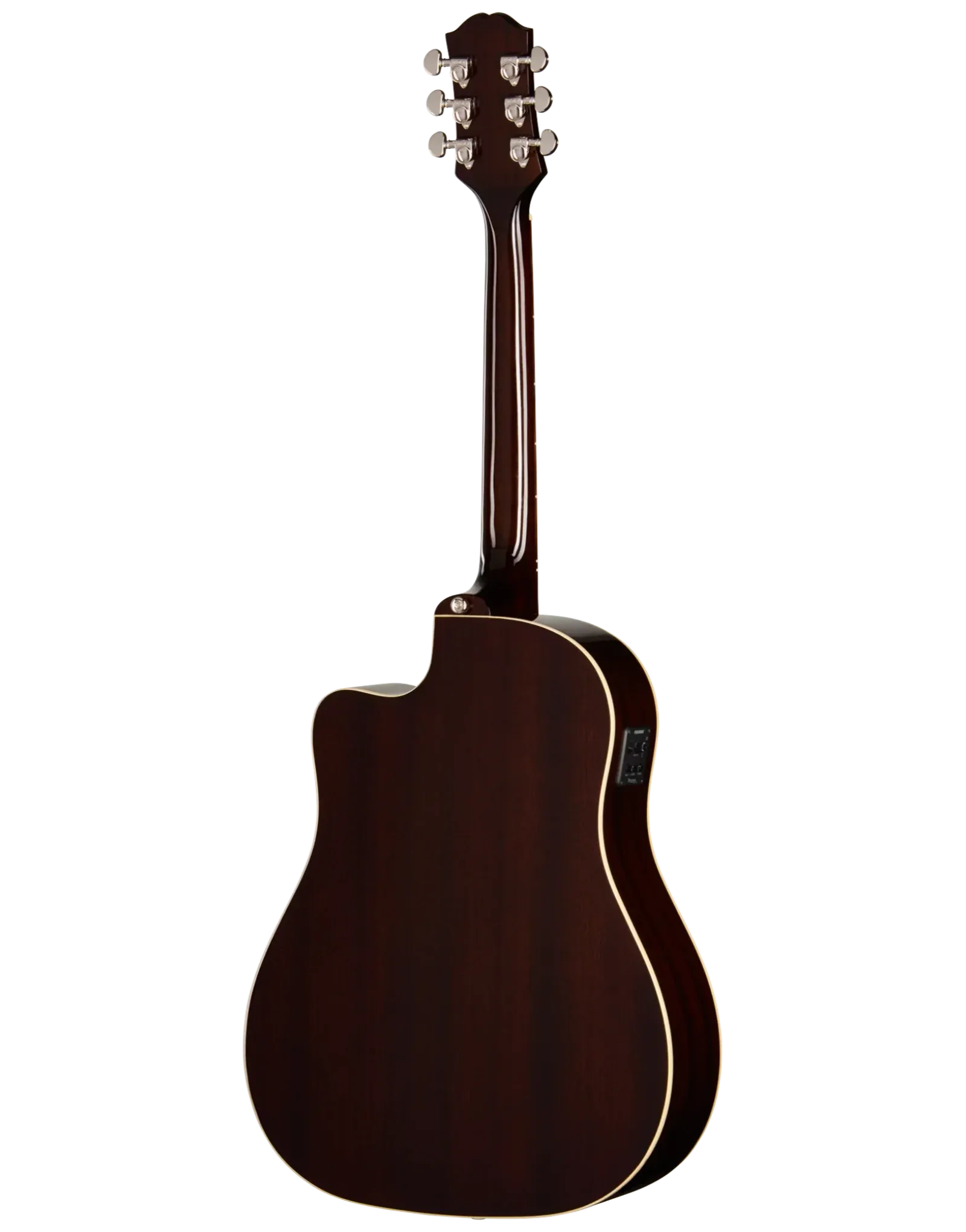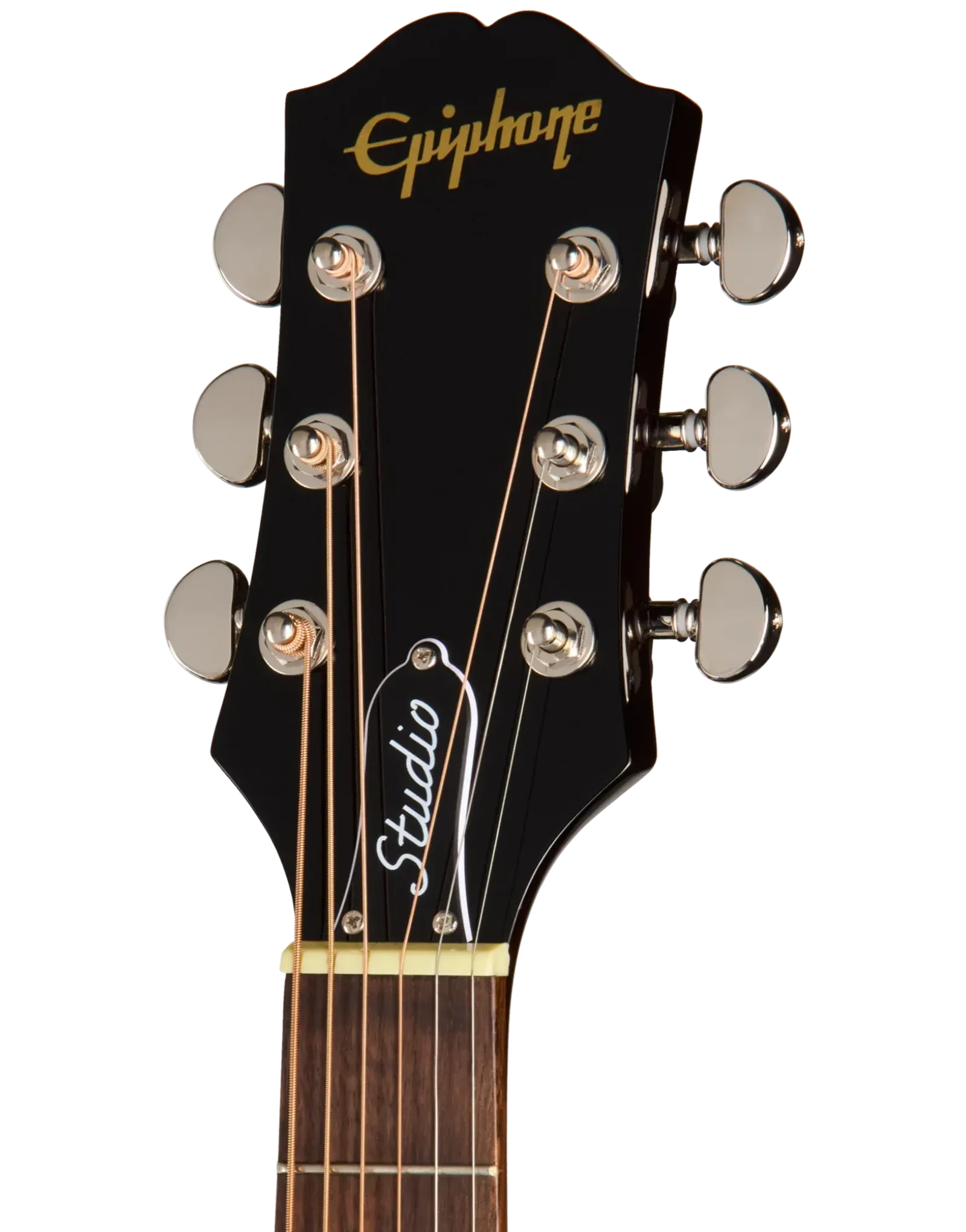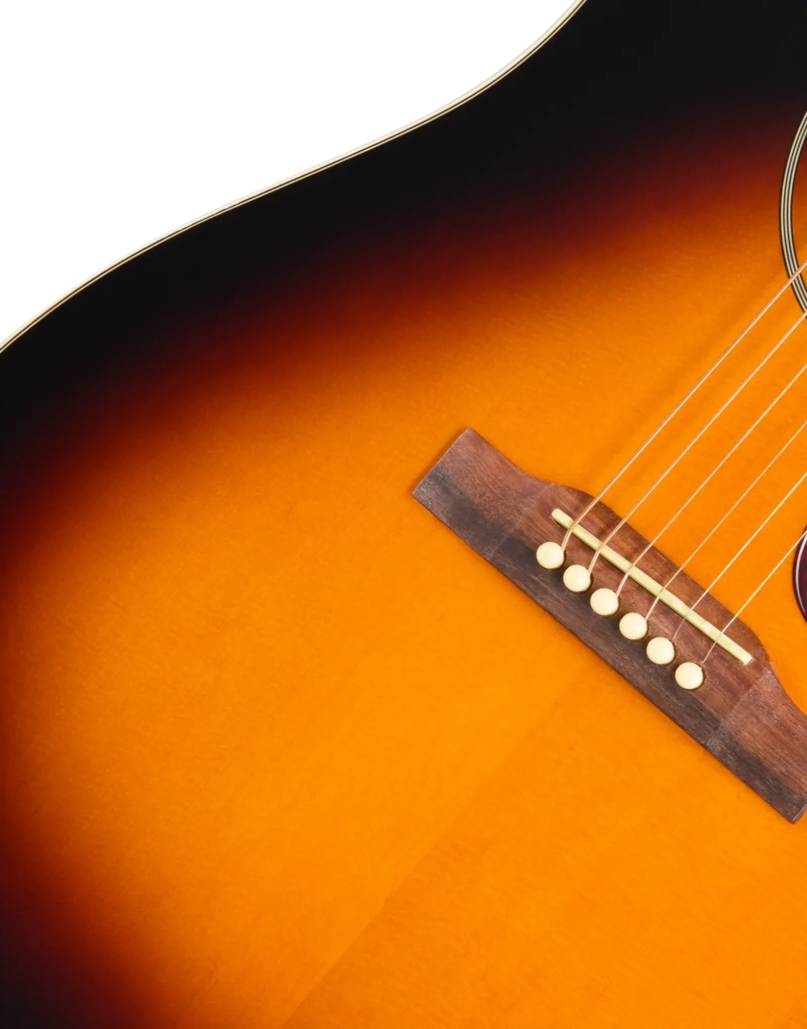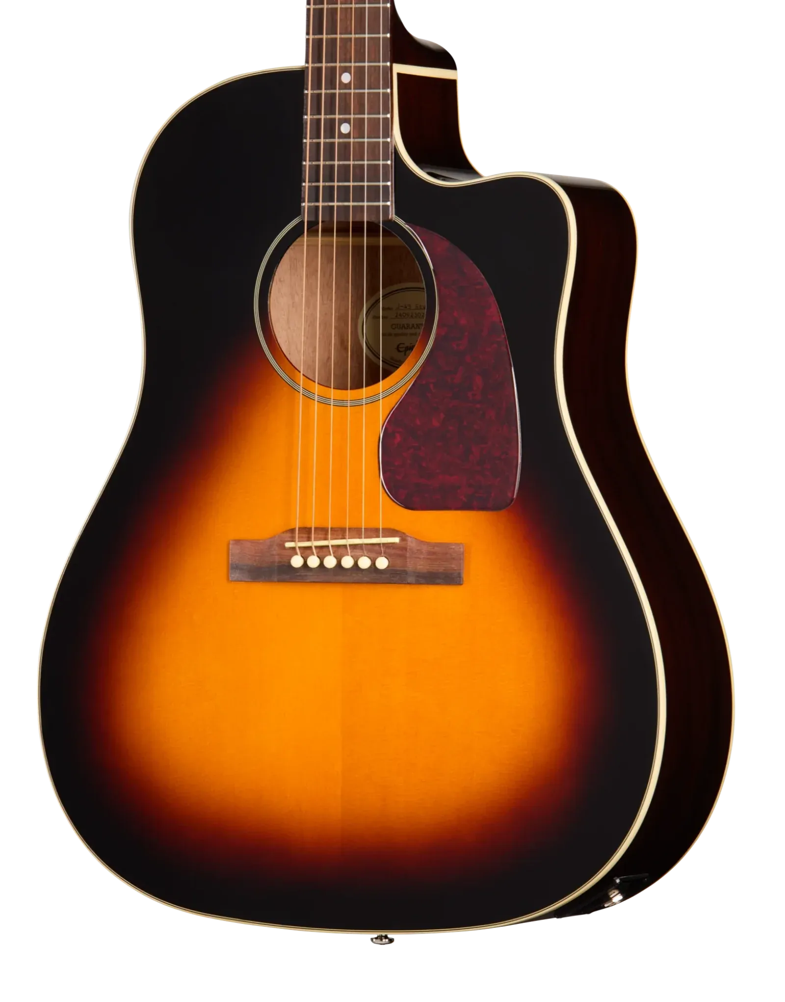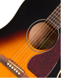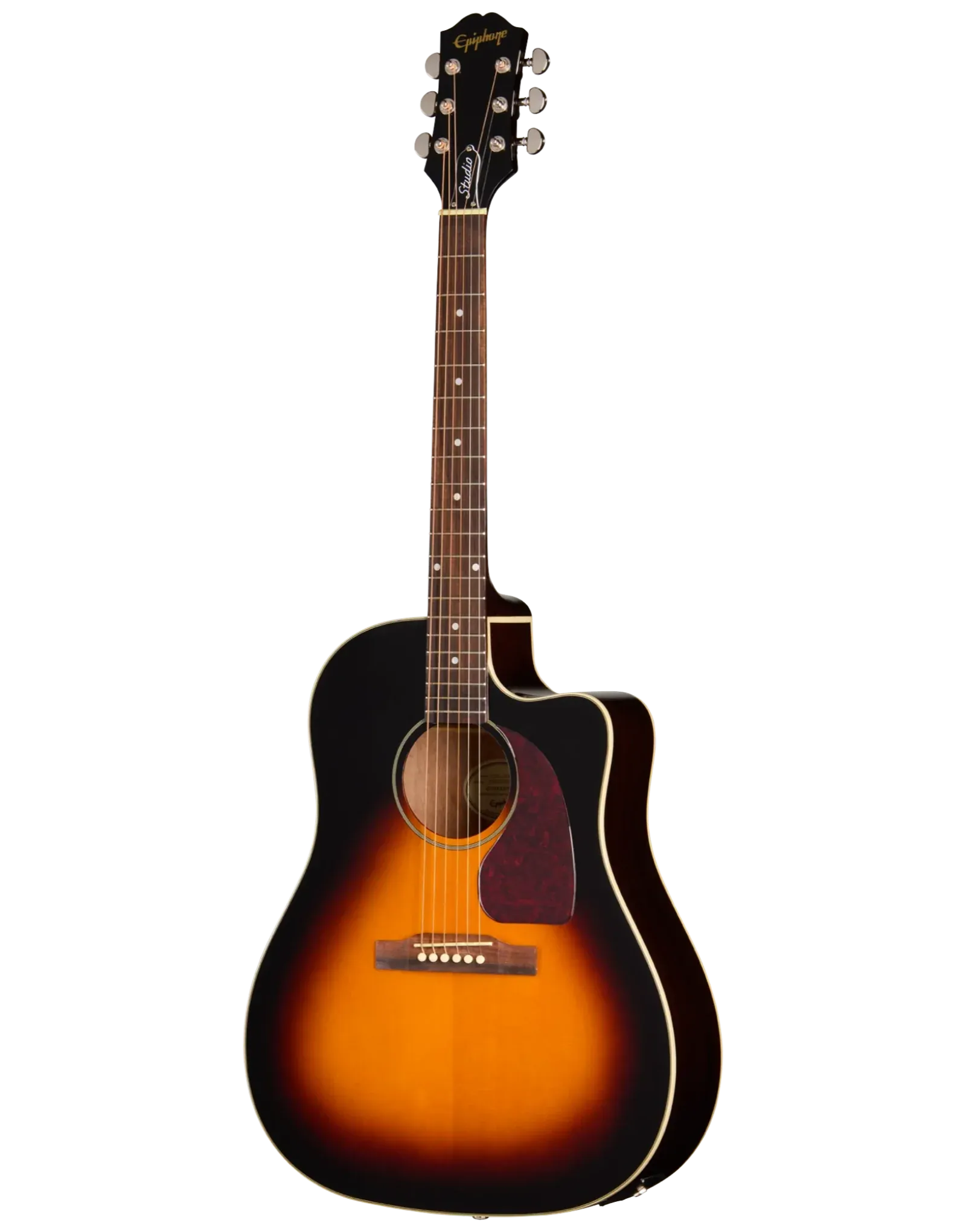 The Epiphone J-45 Studio EC in Vintage Sunburst brings classic slope-shoulder tone together with modern flexibility. Its solid spruce top delivers clear articulation and dynamic response, while the layered mahogany cutaway body adds warmth and balanced projection. The cutaway design provides easier access to upper frets, making it a practical choice for contemporary players.