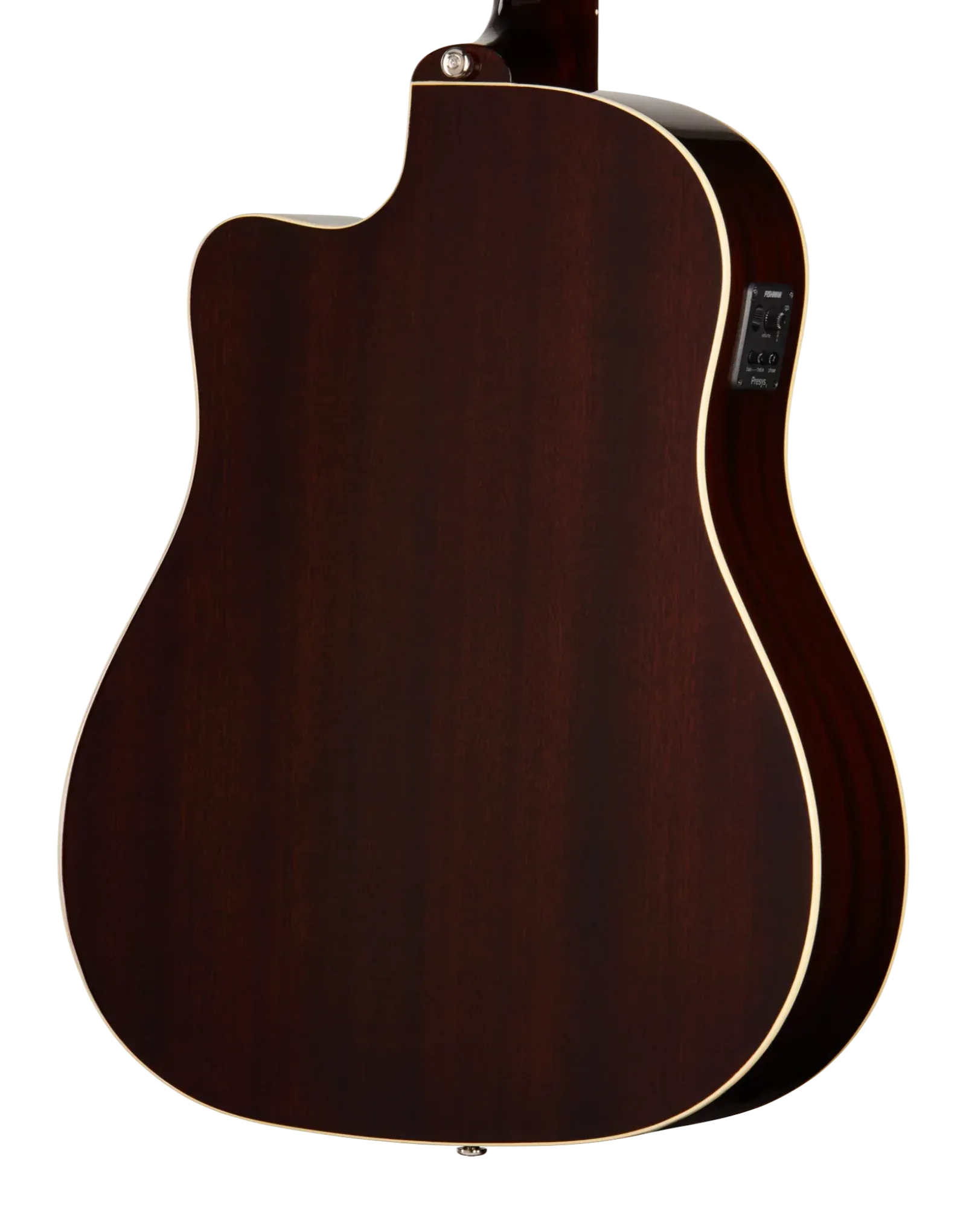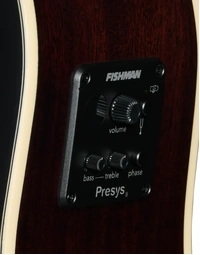 The 24.75" (628.65 mm) scale length and Rounded C mahogany neck offer a comfortable, familiar feel, matched with a 12" (304.8 mm) radius rosewood fretboard and 20 standard frets. Fishman Presys II electronics with S-Core under-saddle pickup, onboard tuner and side-mounted EQ controls make live performance straightforward and reliable. Finished in gloss Vintage Sunburst and supplied with a standard gig bag, it’s built for rehearsal, recording or stage use.