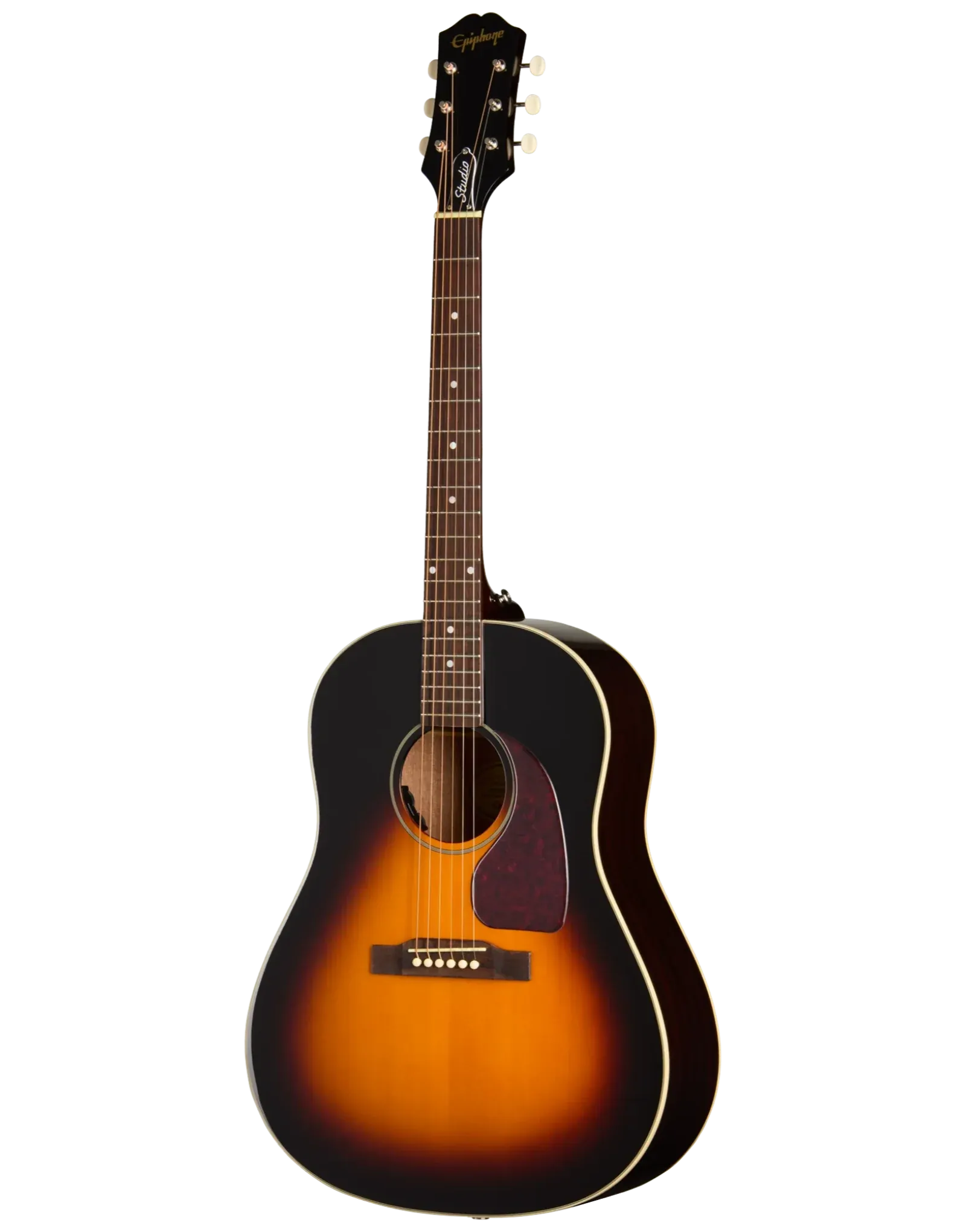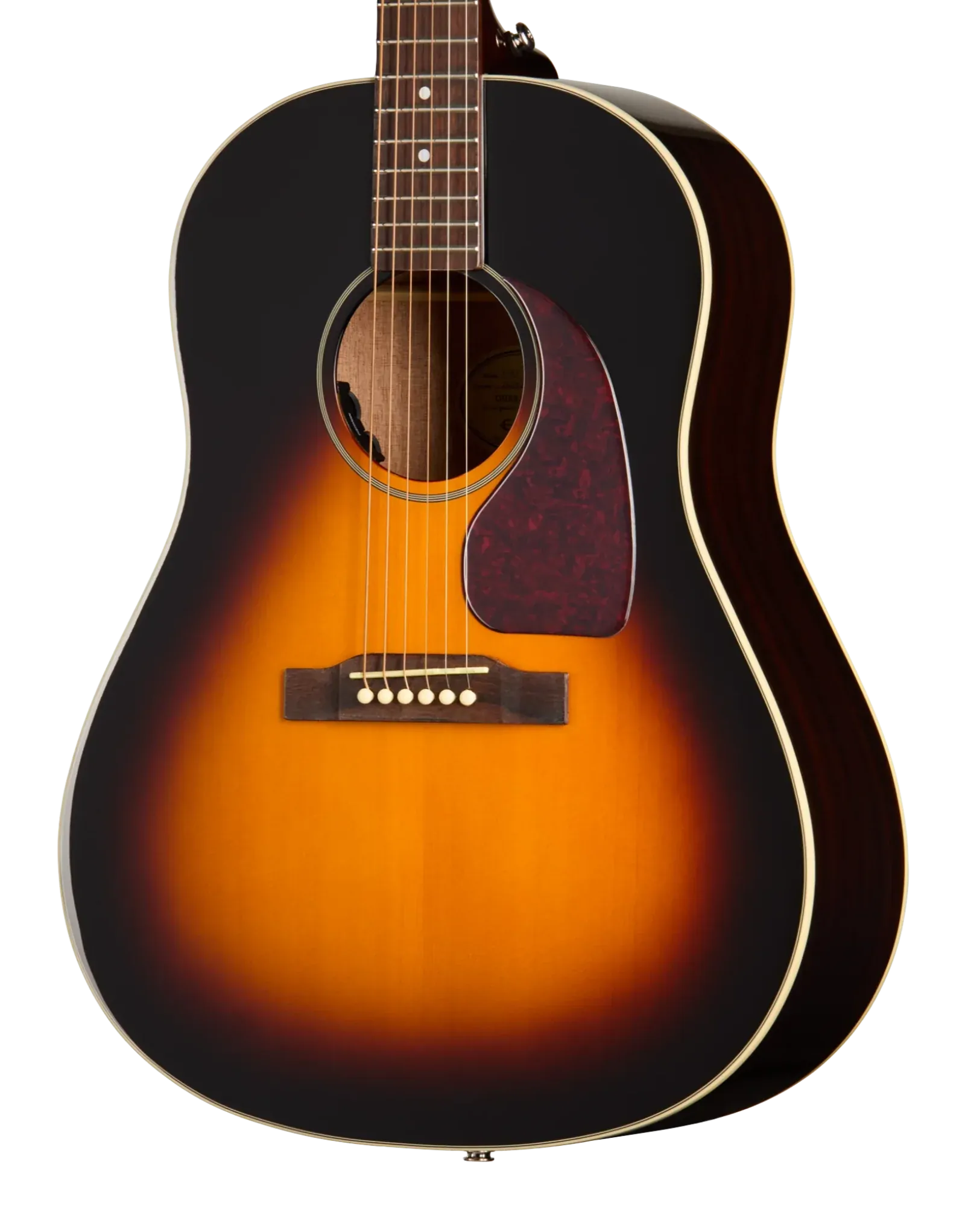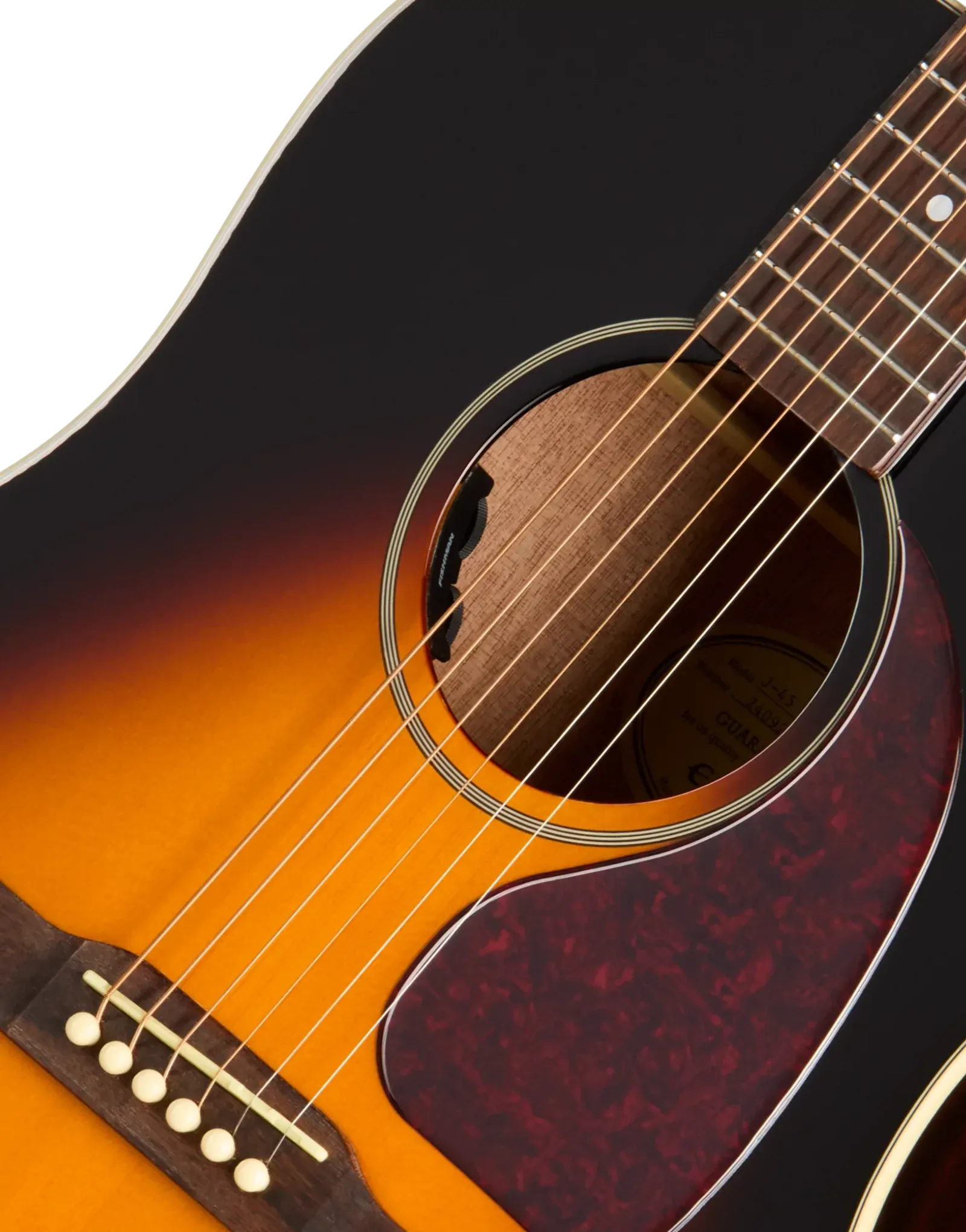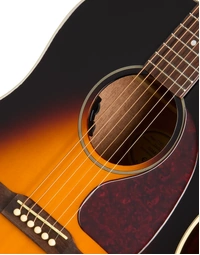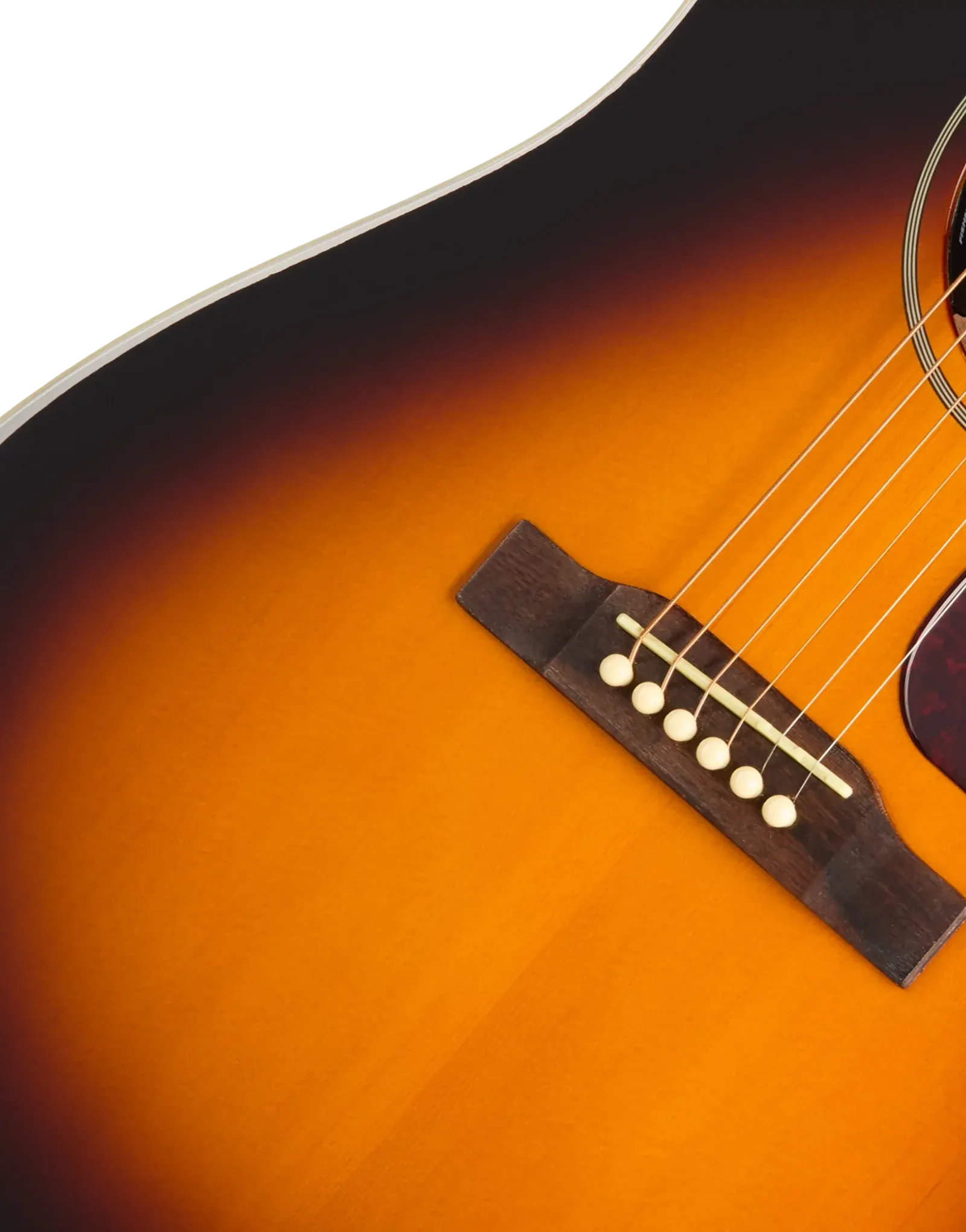 The Epiphone J-45 Studio Vintage Sunburst captures the essence of the classic round-shoulder dreadnought in a practical, player-focused design. Its solid spruce top delivers clear articulation and dynamic response, while layered mahogany back and sides add warmth and depth for a balanced, versatile voice.