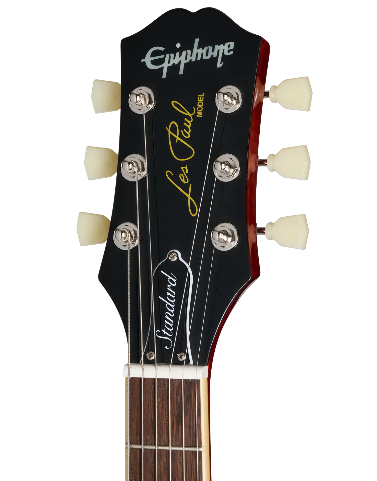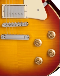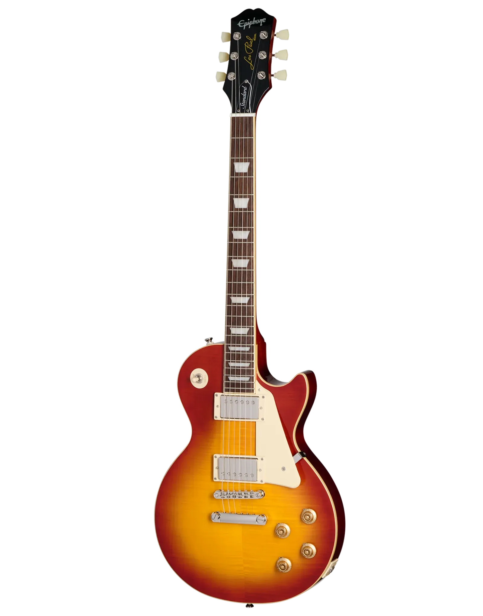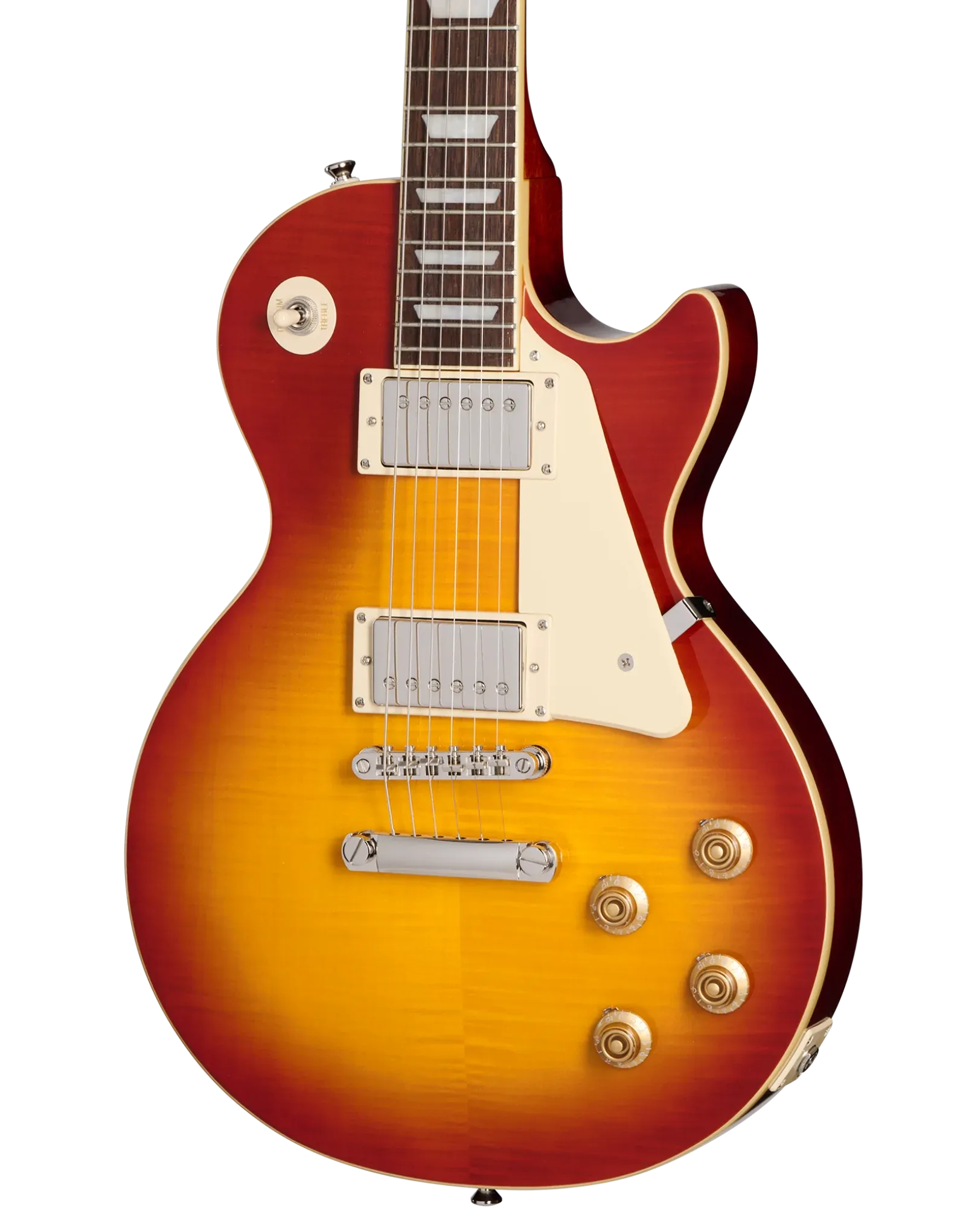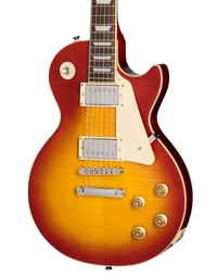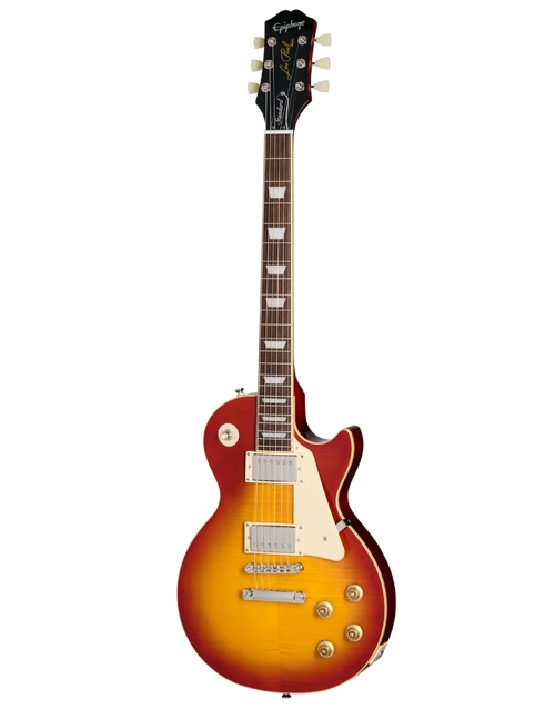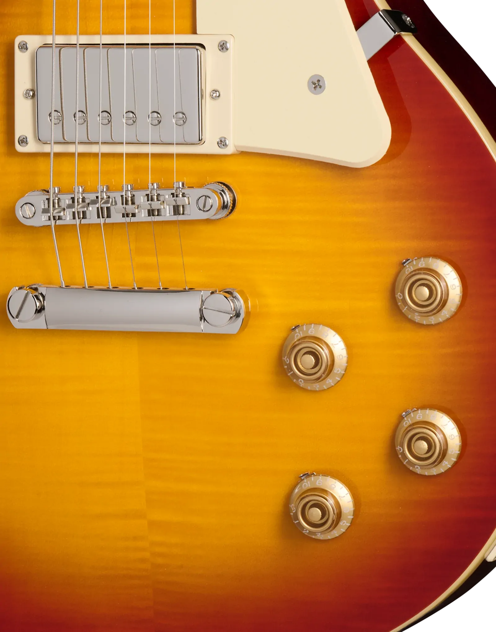 The Epiphone Les Paul Standard 50s Figured Top in Washed Cherry Sunburst delivers vintage-inspired tone and style with modern reliability. Built with a mahogany body, a maple cap, and a stunning AAA flame maple veneer, this guitar produces rich sustain and classic Les Paul warmth. The bound mahogany neck features a ’59 Rounded Medium C profile with a long tenon for added stability, while the laurel fretboard with trapezoid inlays provides a smooth playing experience.