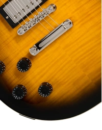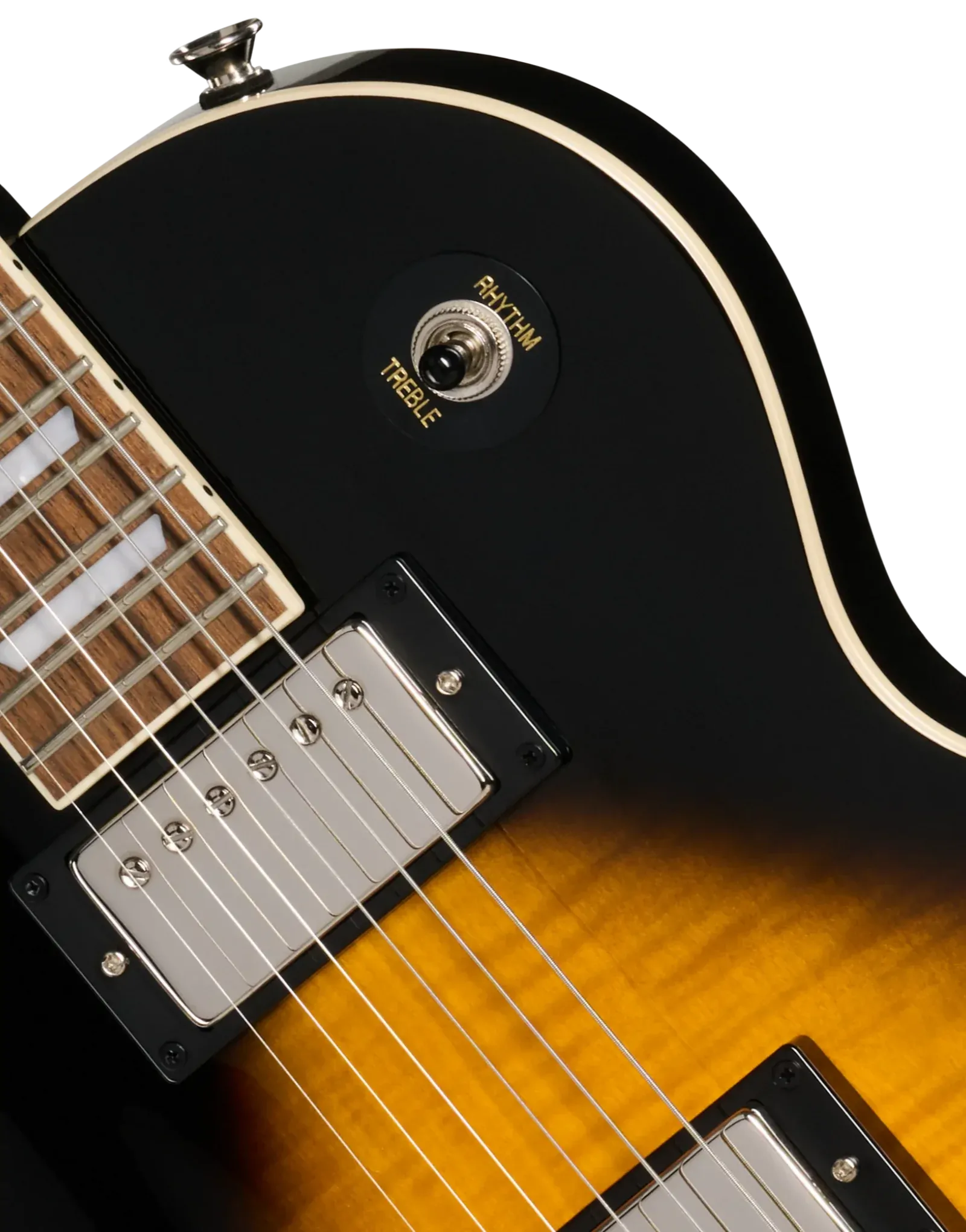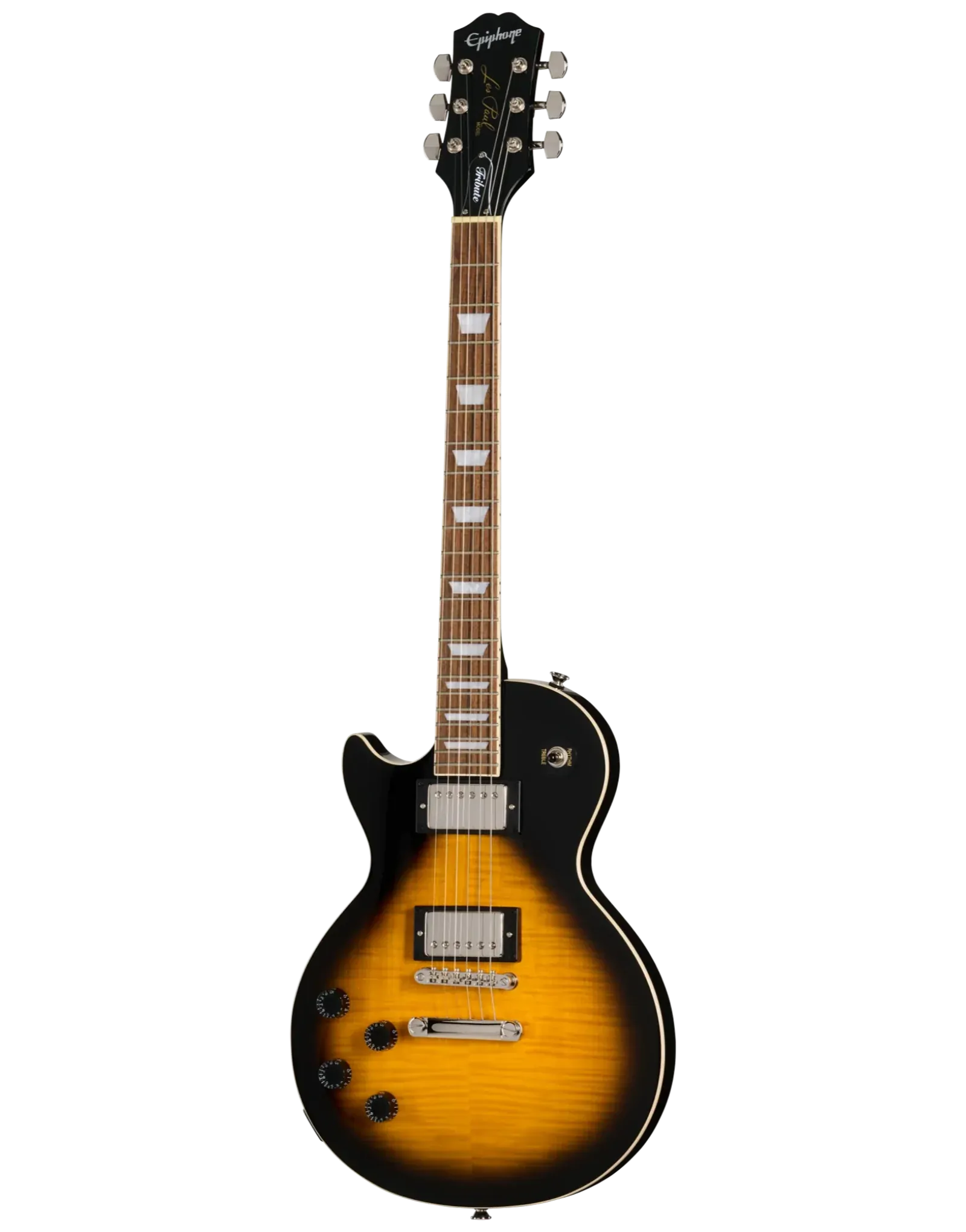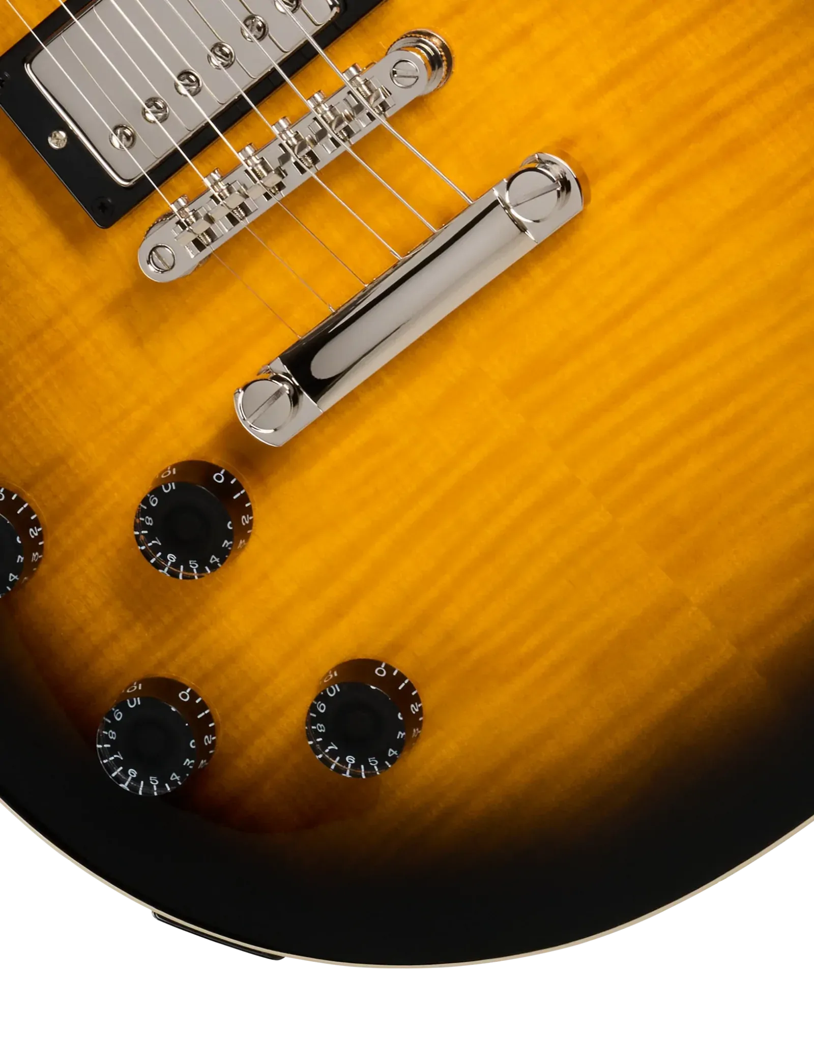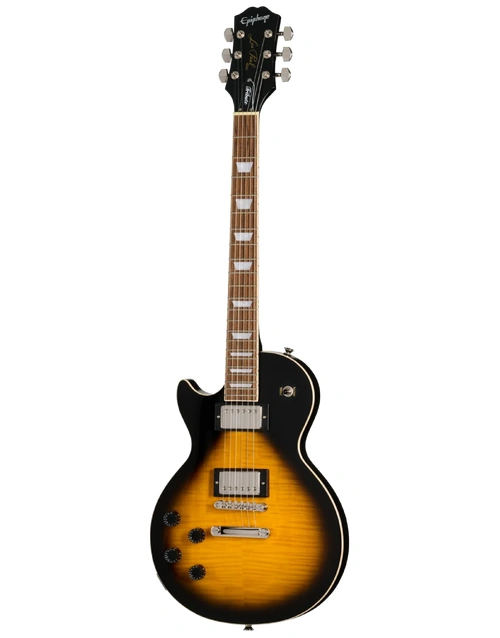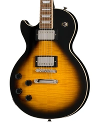 The Epiphone Les Paul Tribute Plus Left-Handed in Vintage Sunburst delivers authentic Les Paul tone and style in a player-friendly package built for left-handed guitarists. Featuring a mahogany body with an AAA flame maple veneer top, this model pairs timeless looks with exceptional sustain. The bolt-on mahogany neck with a 60s SlimTaper Rounded C profile and sculpted heel offers smooth, comfortable playability across the 22-fret bound laurel fingerboard. Powered by Epiphone 650R and 700T humbuckers with ceramic magnets, it produces bold, articulate tones ideal for rock, blues, and beyond. Complete with LockTone hardware and gloss finish, this guitar brings pro-level features to a wide range of players.