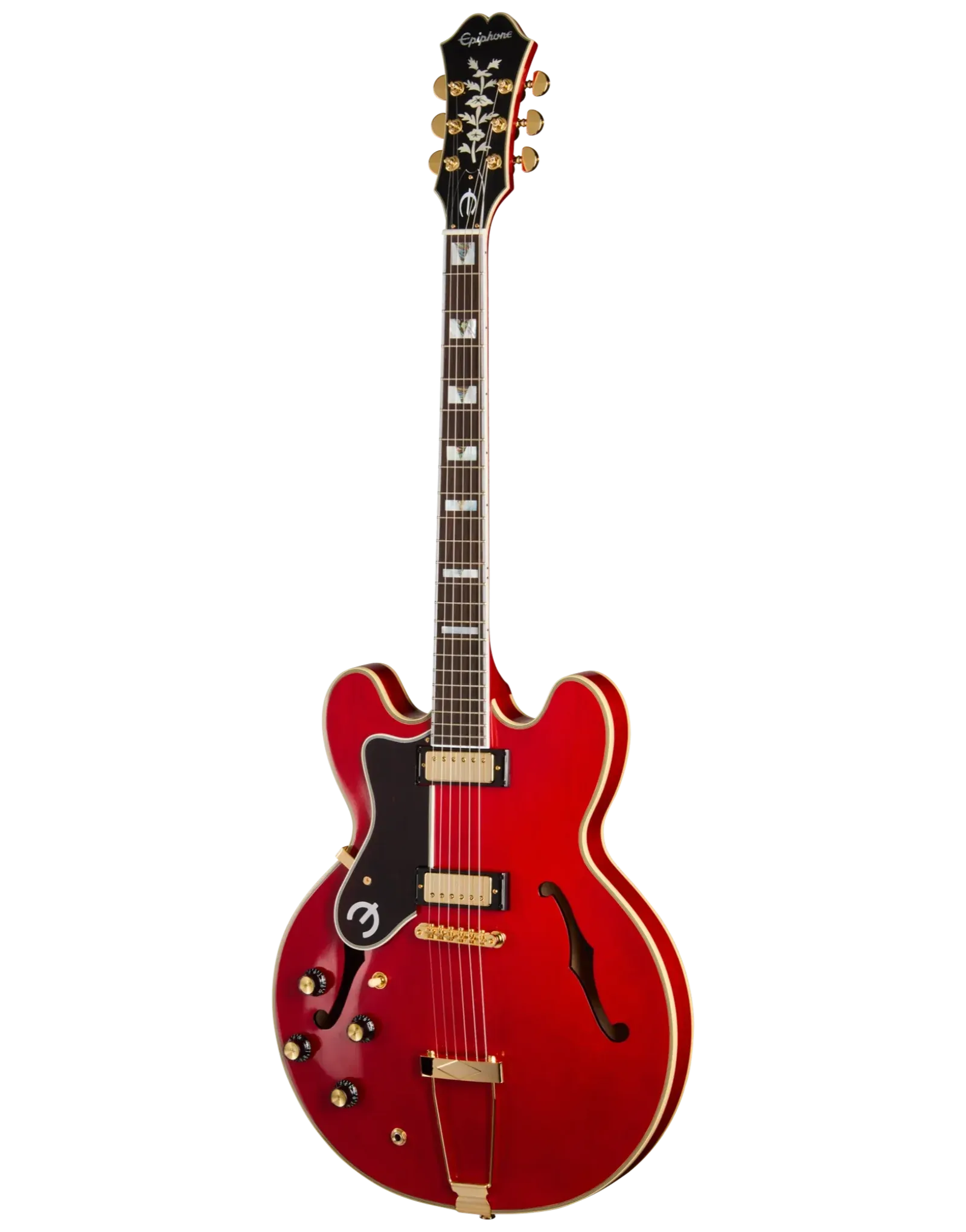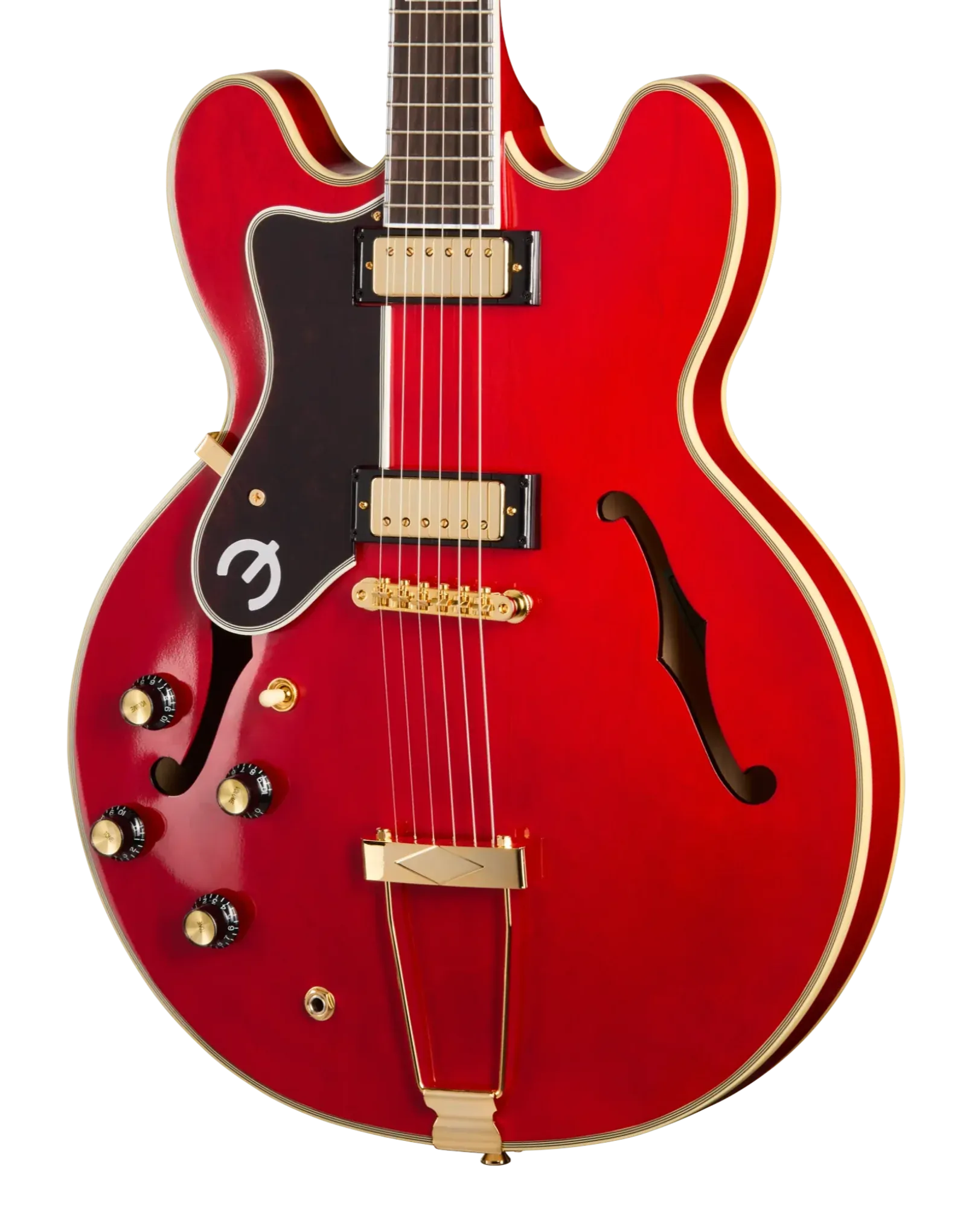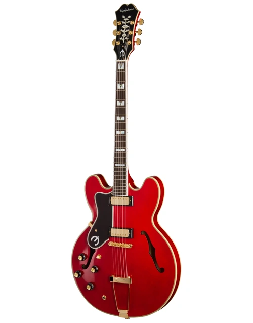 The Epiphone Masterbilt Gem Archer Sheraton Left-Handed model celebrates the legendary 1966 Sheraton played by Gem Archer of Oasis, Beady Eye, and Noel Gallagher’s High Flying Birds. Combining vintage charm with modern precision, this semi-hollow masterpiece features a 5-ply maple/poplar body, solid maple centre block for sustain, and a one-piece mahogany neck with a 60s C profile. USA-made Gibson Mini Humbuckers power its dynamic tone, while gold Grover Rotomatic tuners, a Graph Tech nut, and Casino-style trapeze tailpiece ensure smooth playability and tuning stability. Finished in Cherry Red Vintage Gloss and presented in a hardshell case, it’s a true collector’s piece built for the stage or studio.
