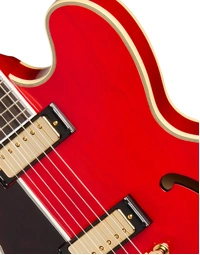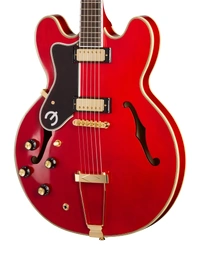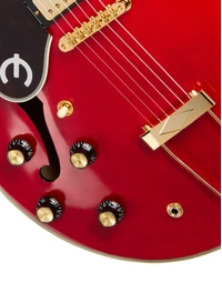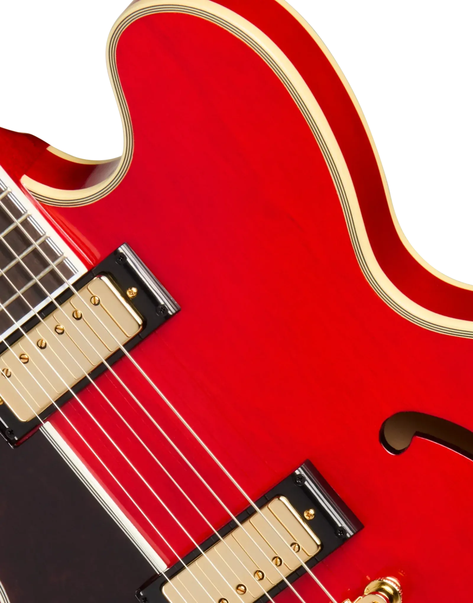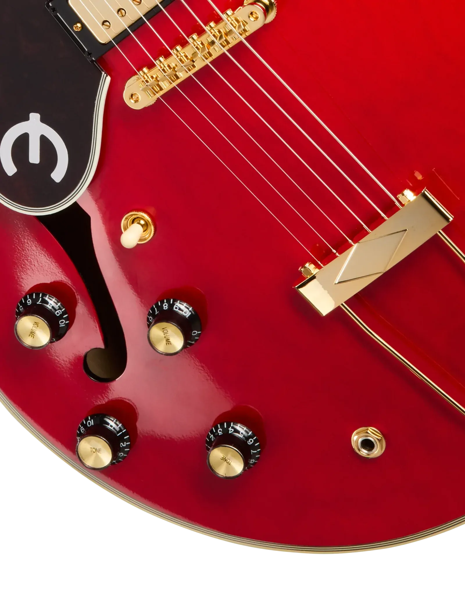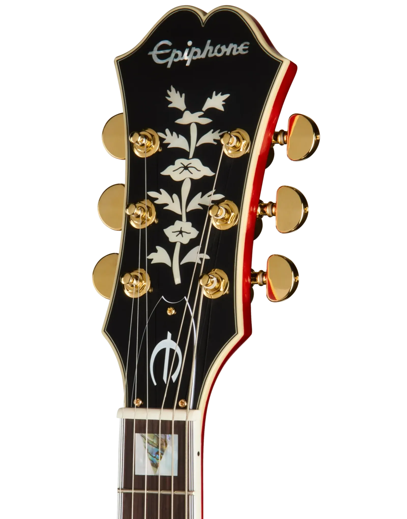 The Epiphone Masterbilt Gem Archer Sheraton Left-Handed model celebrates the legendary 1966 Sheraton played by Gem Archer of Oasis, Beady Eye, and Noel Gallagher’s High Flying Birds. Combining vintage charm with modern precision, this semi-hollow masterpiece features a 5-ply maple/poplar body, solid maple centre block for sustain, and a one-piece mahogany neck with a 60s C profile. USA-made Gibson Mini Humbuckers power its dynamic tone, while gold Grover Rotomatic tuners, a Graph Tech nut, and Casino-style trapeze tailpiece ensure smooth playability and tuning stability. Finished in Cherry Red Vintage Gloss and presented in a hardshell case, it’s a true collector’s piece built for the stage or studio.