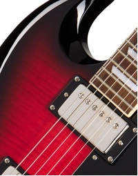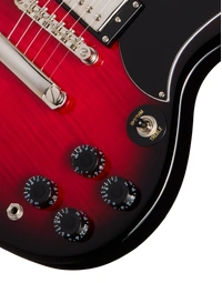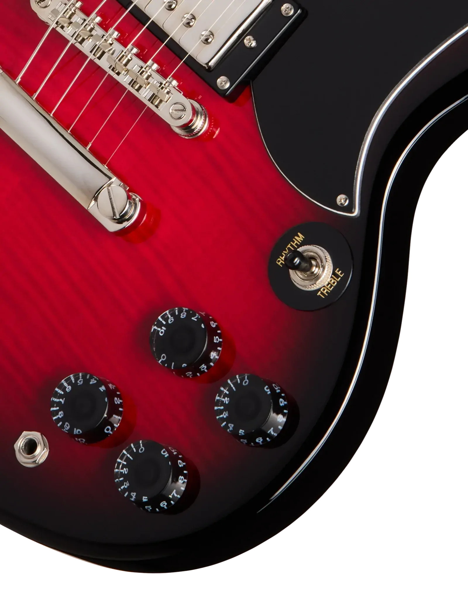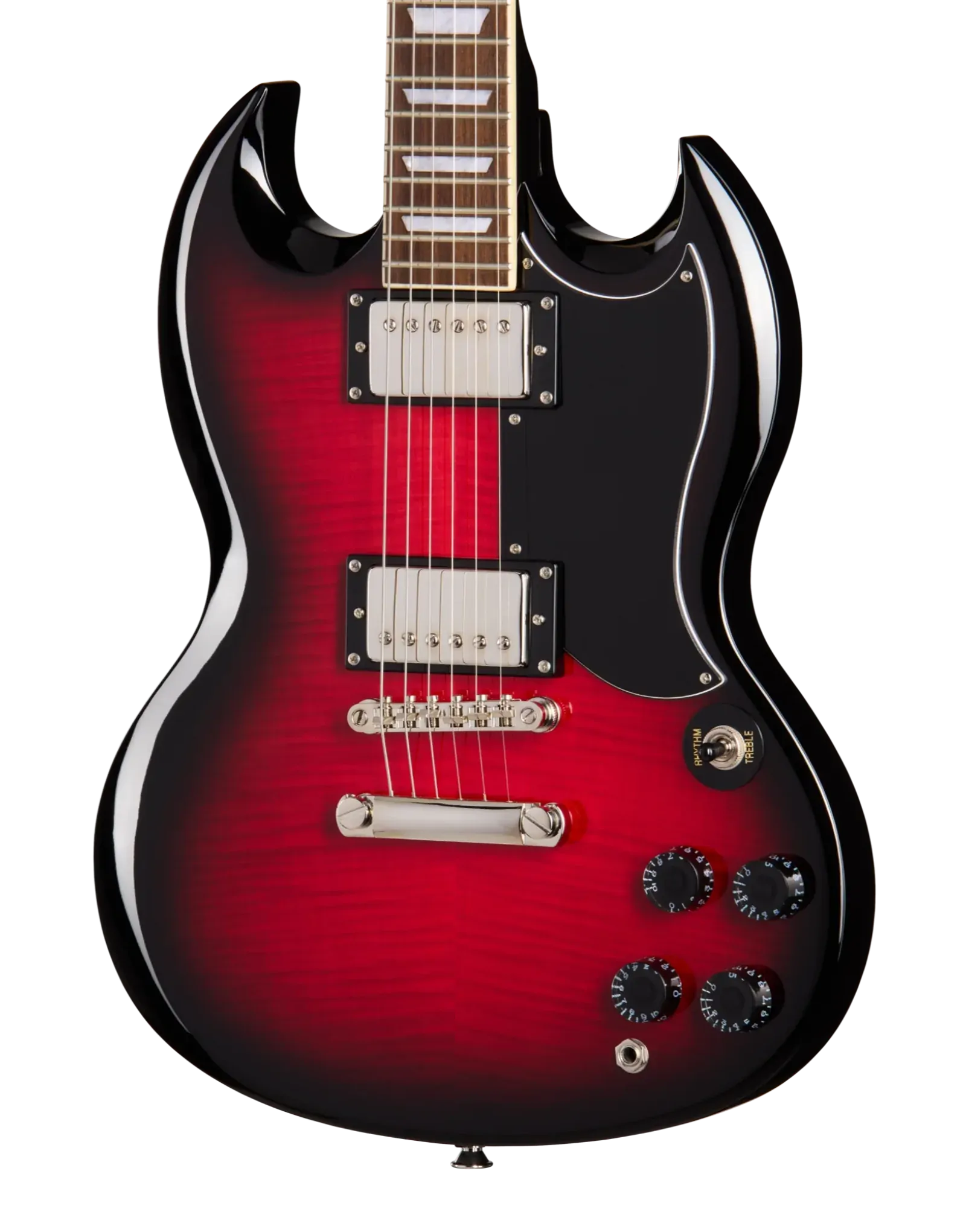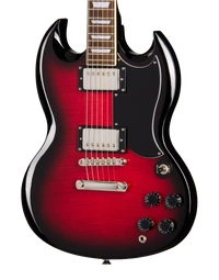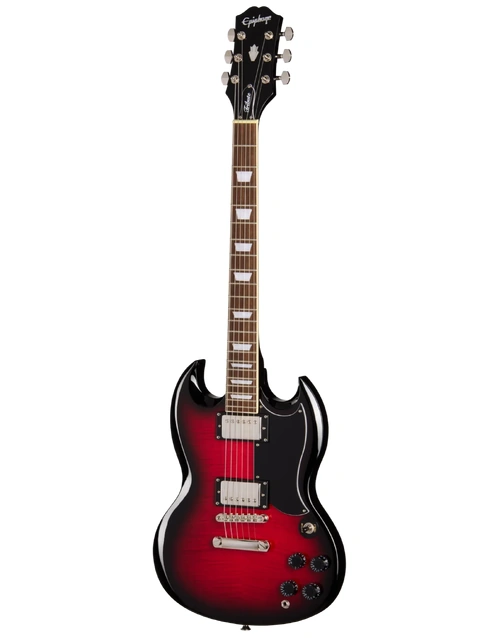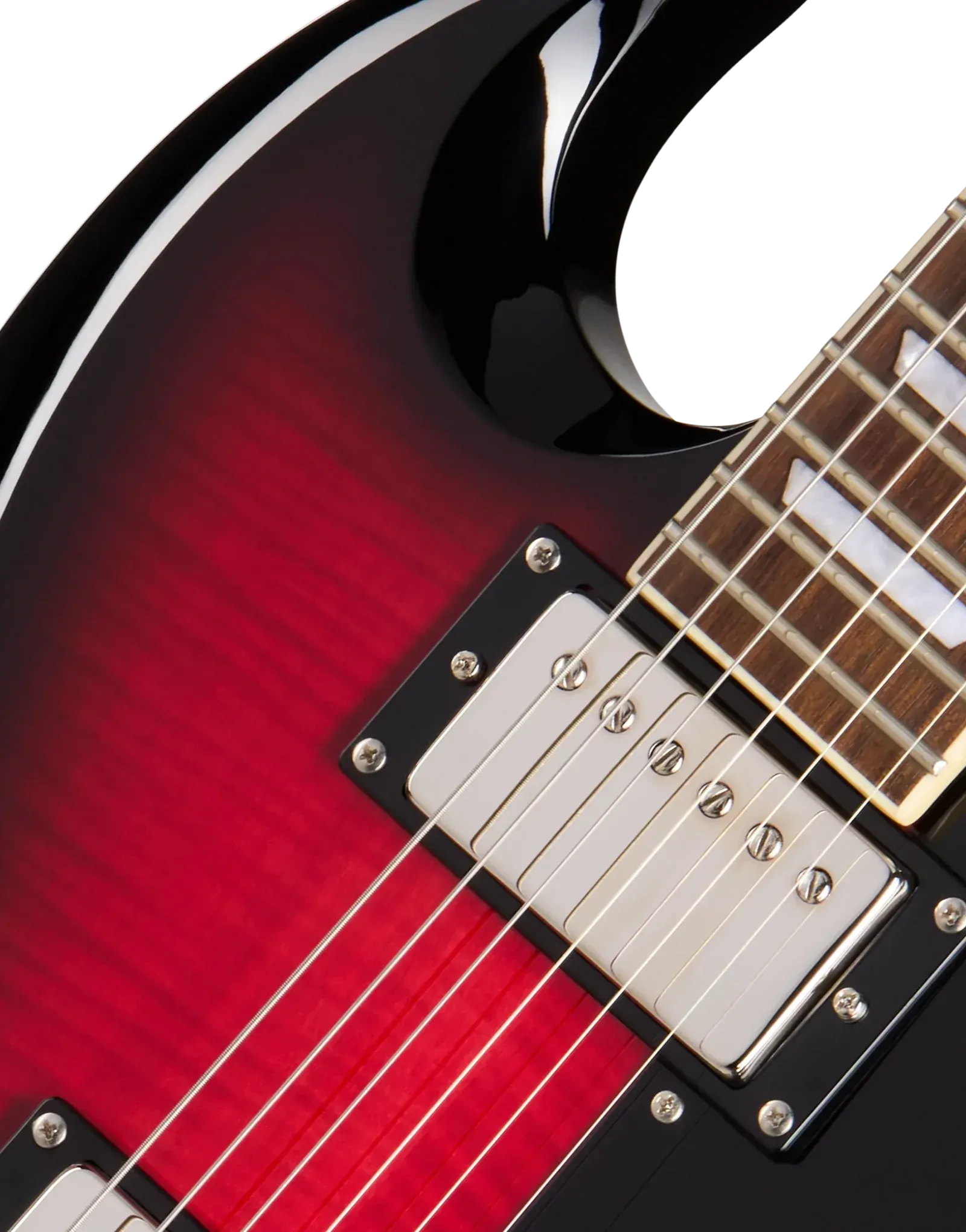 The Epiphone SG Tribute Plus in Cherry Burst celebrates the classic Gibson SG design while offering impressive tone and playability for today’s players. With a mahogany body topped by a striking flame maple veneer, it delivers resonant sustain and vintage-inspired style. The bolt-on mahogany neck features a 60s SlimTaper Rounded C profile and a tapered heel for smooth upper fret access, while the bound laurel fretboard with pearloid trapezoid inlays enhances the premium feel. Equipped with Epiphone 650R and 700T humbuckers with ceramic magnets, this SG produces a powerful, articulate sound ideal for rock and blues. LockTone hardware ensures tuning stability and sustain, rounding out a guitar that performs as good as it looks.