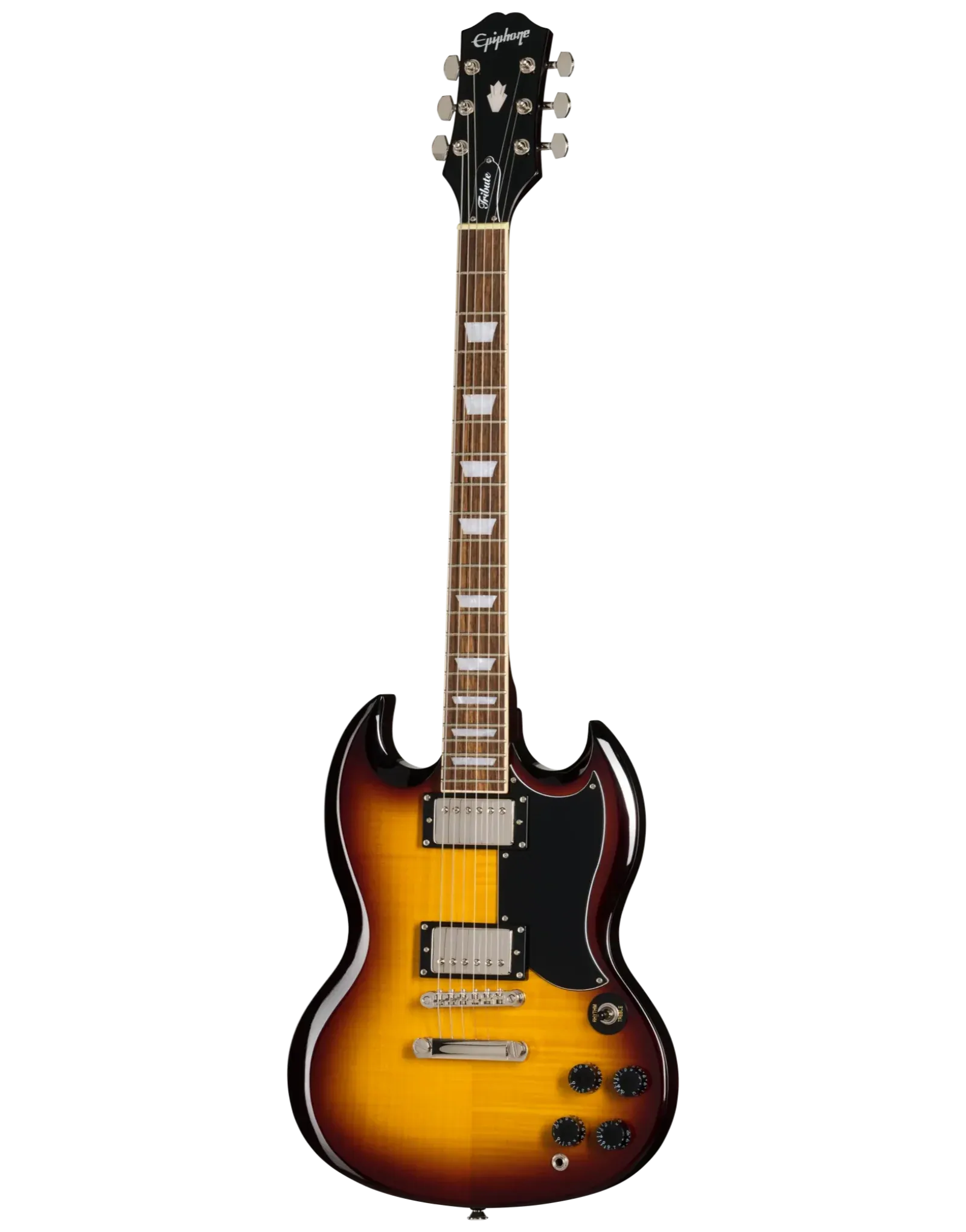The Epiphone SG Tribute Plus in Vintage Sunburst brings the timeless SG design to life with warm tone, modern comfort, and classic looks. Its mahogany body, paired with a flame maple veneer top, offers the rich sustain and bite players expect from an SG. The bolt-on mahogany neck features a smooth 60s SlimTaper Rounded C profile for fast, comfortable playing, while the bound laurel fretboard with pearloid trapezoid inlays adds a touch of vintage elegance. Dual Epiphone humbuckers—a 650R in the neck and a 700T in the bridge—deliver a bold, articulate sound powered by ceramic magnets. The LockTone Tune-O-Matic bridge and Stop Bar tailpiece enhance sustain and tuning stability, making this model perfect for stage, studio, or home practice.