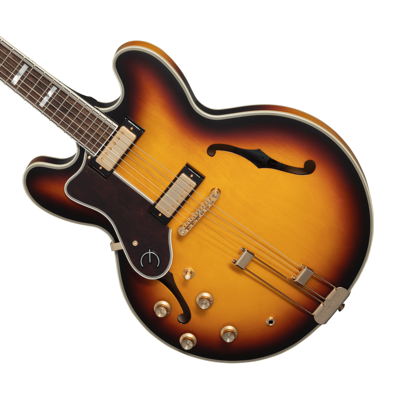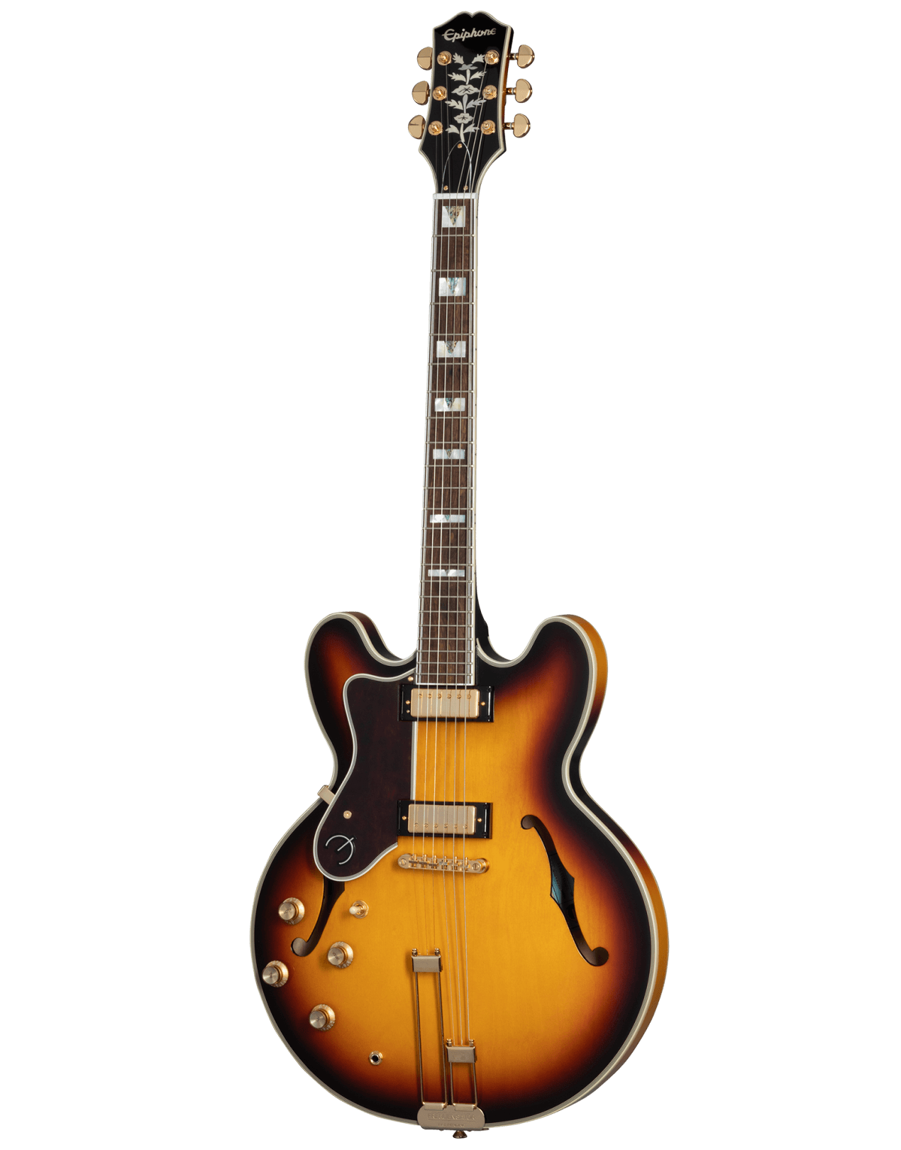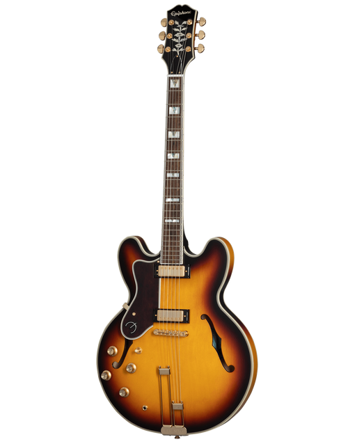 With a semi-hollow body crafted from layered maple and a maple centreblock for enhanced feedback resistance, this instrument exudes elegance and craftsmanship. The mahogany neck, adorned with a 22-fret bound Indian laurel fretboard and eye-catching block mother of pearl with abalone triangle inlays, provides smooth playability and a touch of sophistication. The bound headstock proudly displays the historic Epiphone logo and an exquisite tree of life design in mother of pearl. Equipped with Epiphone ProBucker mini humbuckers, this guitar delivers a wide dynamic tonal range that shines in almost any musical genre. The gold hardware, including the vintage-styled Frequensator Split Trapeze tailpiece, adds to the overall timeless aesthetic of this Epiphone legend.