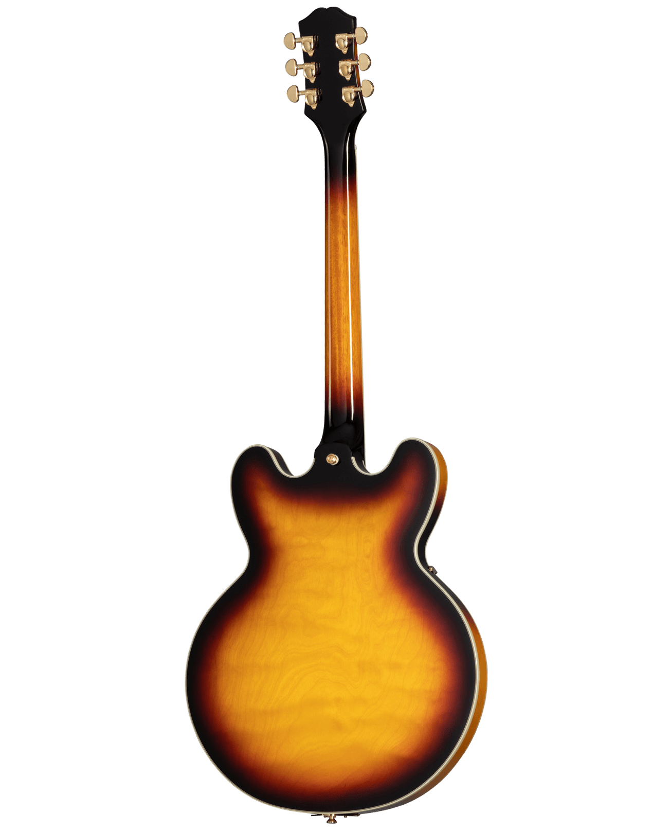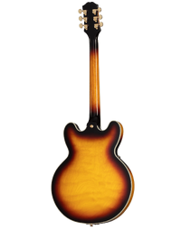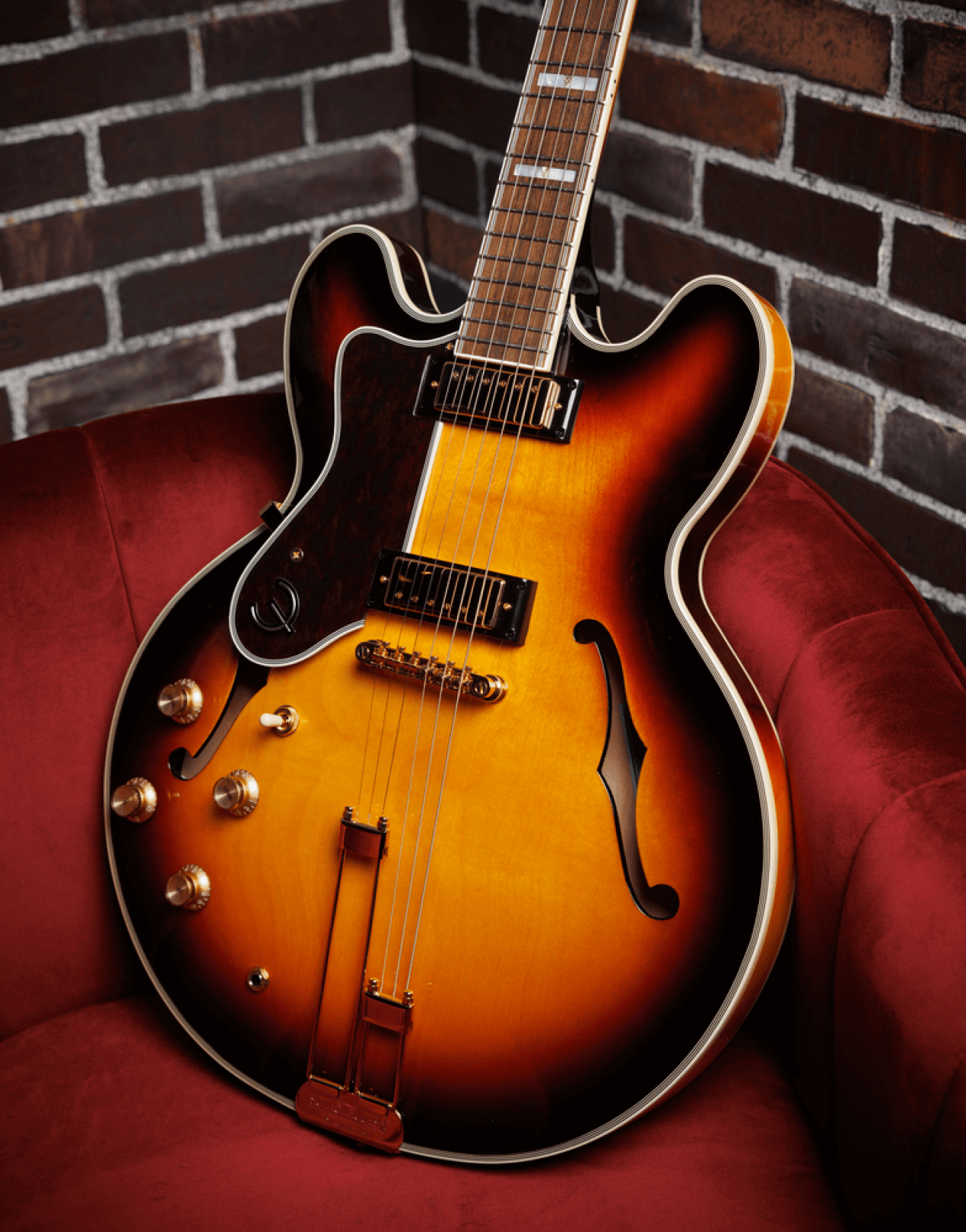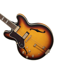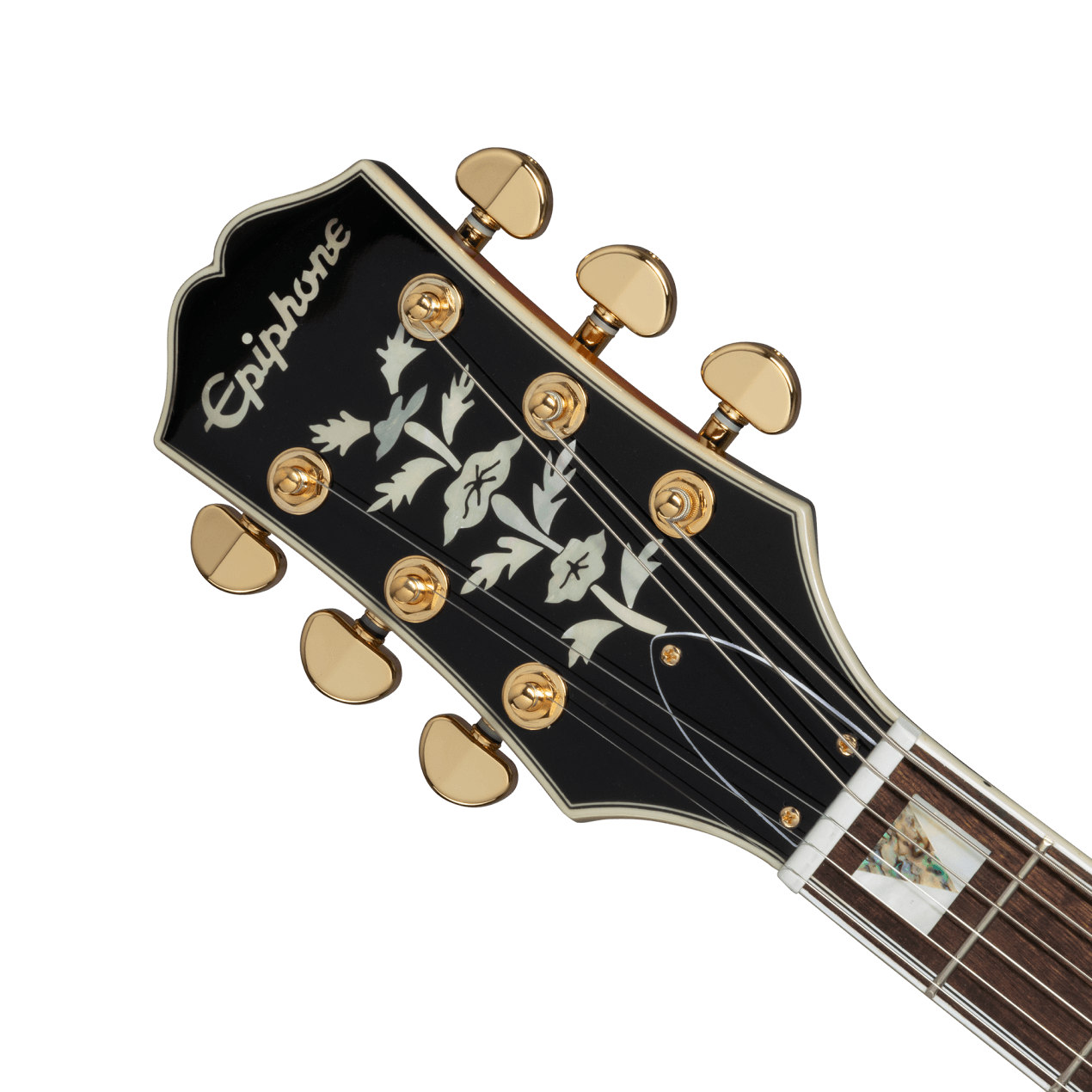 With a semi-hollow body crafted from layered maple and a maple centreblock for enhanced feedback resistance, this instrument exudes elegance and craftsmanship. The mahogany neck, adorned with a 22-fret bound Indian laurel fretboard and eye-catching block mother of pearl with abalone triangle inlays, provides smooth playability and a touch of sophistication. The bound headstock proudly displays the historic Epiphone logo and an exquisite tree of life design in mother of pearl. Equipped with Epiphone ProBucker mini humbuckers, this guitar delivers a wide dynamic tonal range that shines in almost any musical genre. The gold hardware, including the vintage-styled Frequensator Split Trapeze tailpiece, adds to the overall timeless aesthetic of this Epiphone legend.