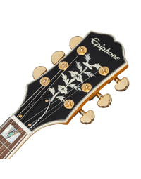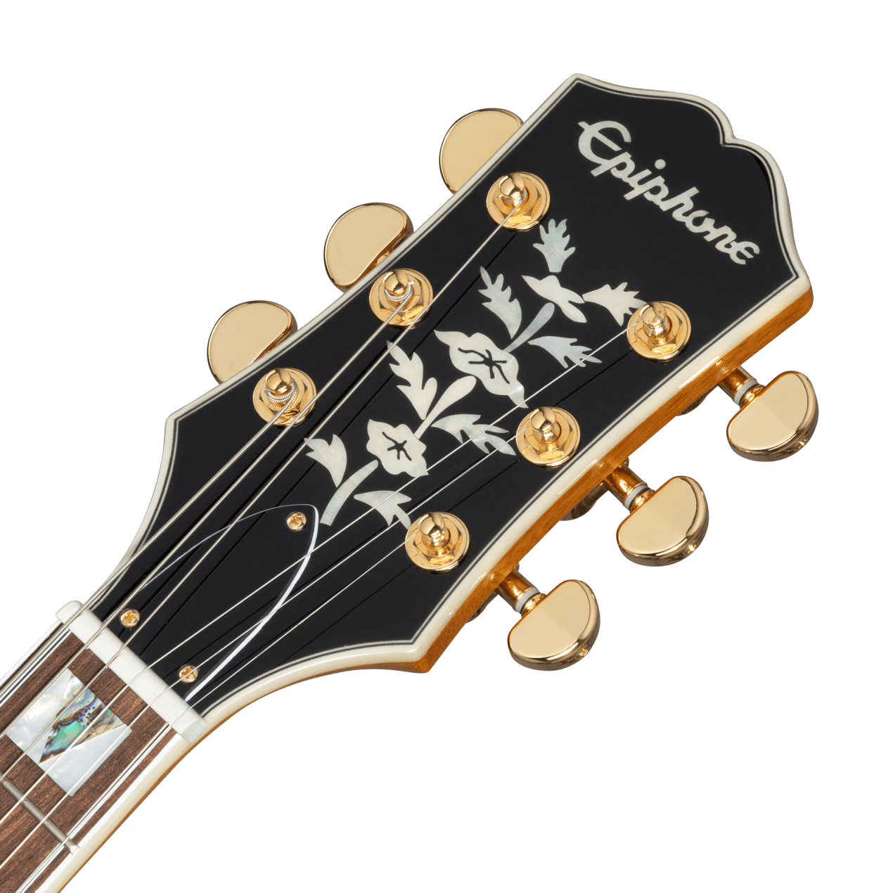 Crafted with meticulous attention to detail, the Sheraton Frequensator showcases a semi-hollow body constructed from layered maple, enhanced with a maple centreblock to minimize unwanted feedback. The mahogany neck boasts a bound 22 fret Indian laurel fretboard adorned with eye-catching block mother of pearl inlays, complemented by an exquisite bound headstock featuring a historic Epiphone logo and a stunning tree of life design in mother of pearl.