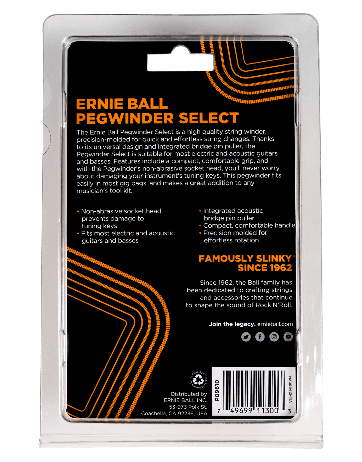 The Ernie Ball Pegwinder Select For Guitar is a high-quality precision-moulded string winder designed for quick and effortless string changes. Thanks to a universal design and integrated bridge pin puller, the Pegwinder Select is suitable for most electric and acoustic guitars. Features include a compact, comfortable grip and with the Pegwinder's non-abrasive socket head, you'll never worry about damaging your instrument's tuning keys. This compact pegwinder fits easily in most gig bags and makes a great addition to any musician's tool kit.