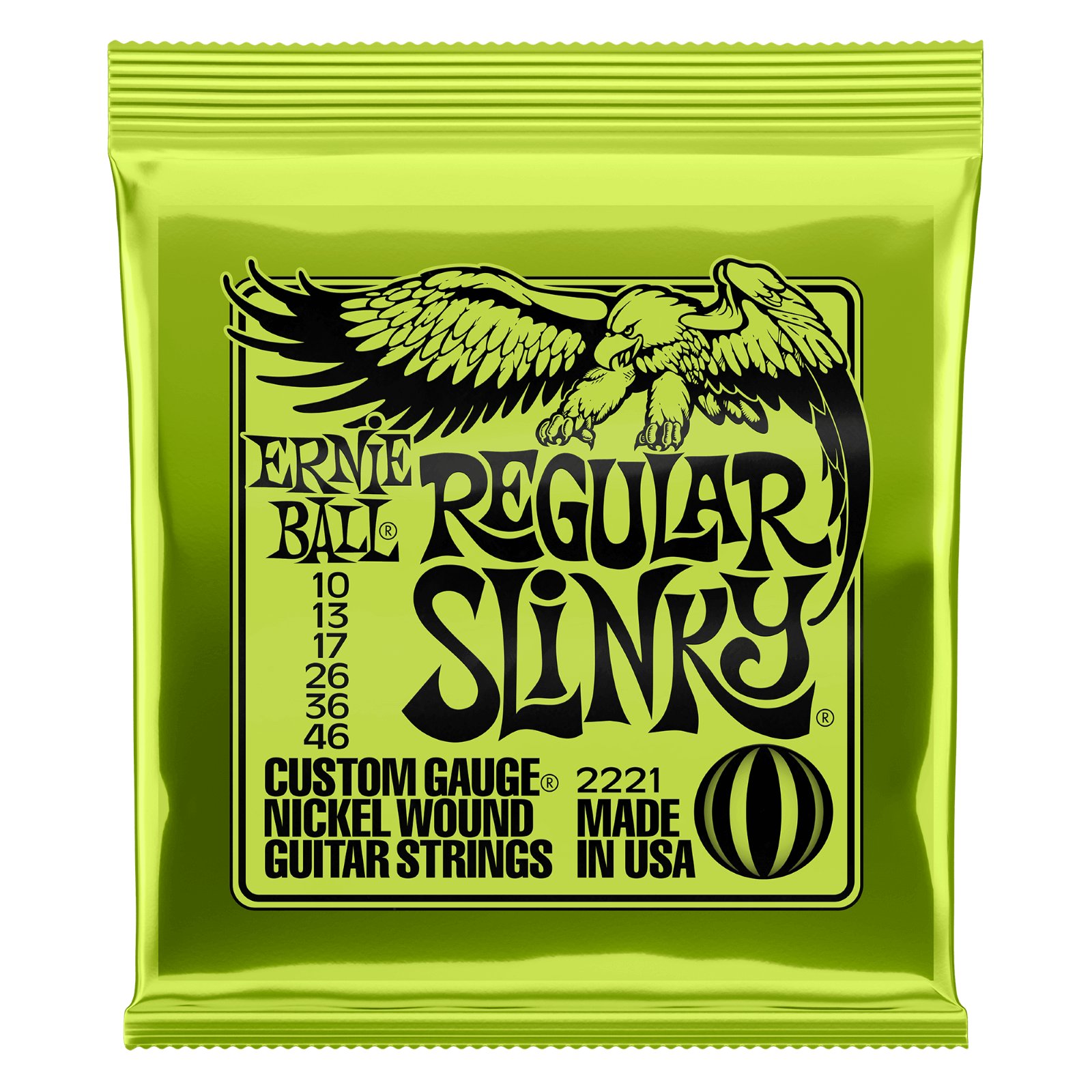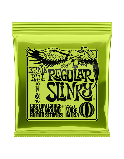 Ernie Ball Regular Slinky Electric Strings are the top selling set of Slinky Strings, and are favoured by many musicians around the globe. Regular Slinky strings are played by Eric Clapton, John Mayer, Steve Vai and legions of guitar players worldwide. These strings are precision manufactured to the highest standards and most exacting specifications to ensure consistency, optimum performance, and long life. Regular Slinky wound strings are made from nickel plated steel wire wrapped around a hex shaped steel core wire. The plain strings are made of specially tempered tin plated high carbon steel producing a well balanced tone for your guitar.