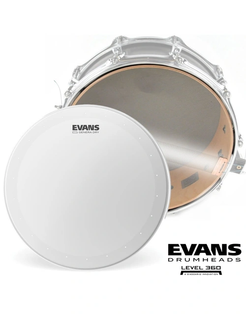 Evans Genera Dry snare heads feature a single ply of 10mil film in combination with a 2mil overtone control ring on the underside that "floats" with the head, eliminating excessive overtones and controlling sustain. Precision-drilled dry vents around the perimeter of the head further reduce overtones and sustain.
