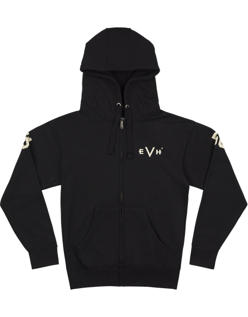 Rock the EVH brand in style with the EVH 5150 Hoodie! Featuring the logos of our best-selling EVH 5150 series in bold shell white, this cosy zip-up hoodie features a convenient zip up front, logo hits in four locations, and a drawstring hood for adjustable comfort.