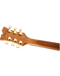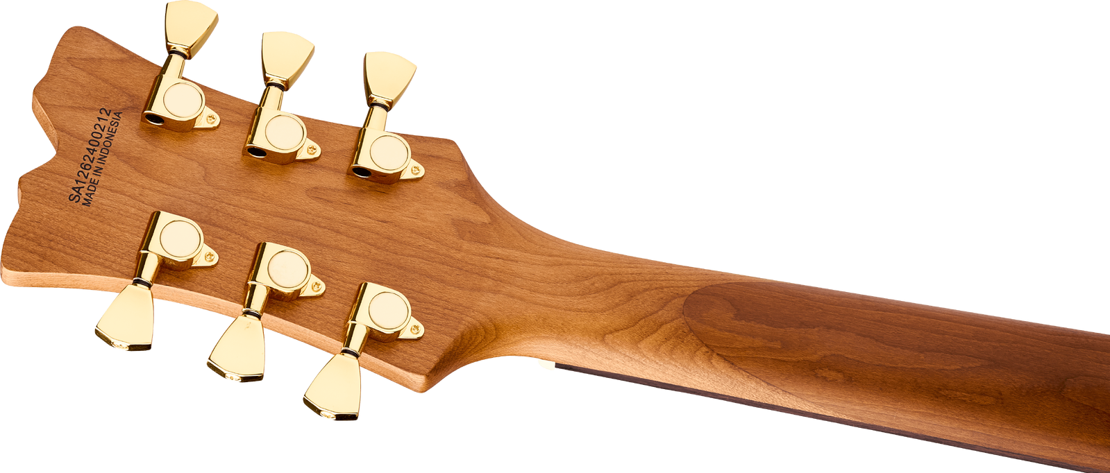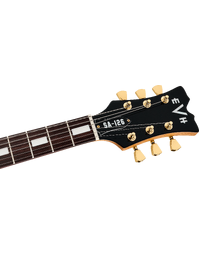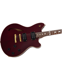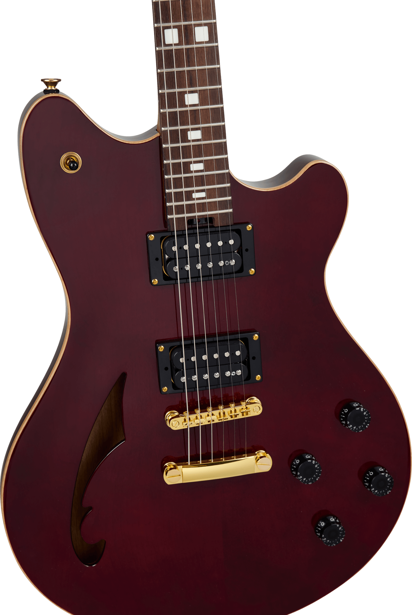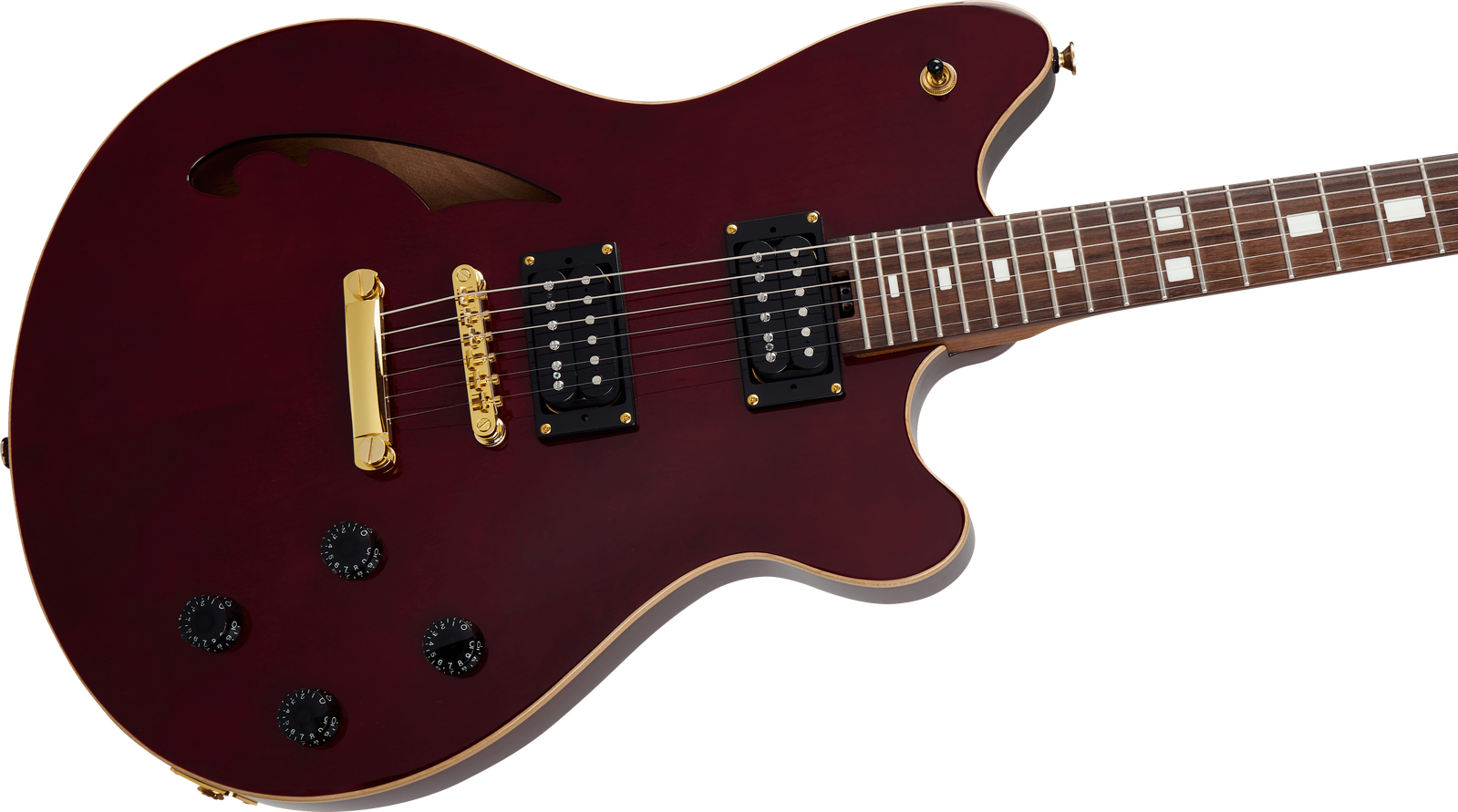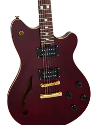 The EVH SA-126 Standard is a semi-hollowbody hybrid guitar that blends classic resonance with modern playability. Designed by Wolfgang Van Halen, it features a chambered mahogany body with a mahogany centre block for enhanced sustain and dynamic tone. A maple top with natural body binding gives it a timeless aesthetic, while the Transparent Wine Red finish with gold hardware adds a touch of elegance.