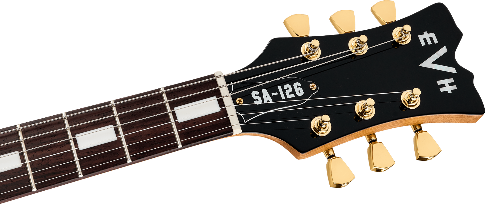 The baked maple bolt-on neck is fitted with a 12"-16" compound radius rosewood fingerboard, 22 jumbo frets, and reimagined block inlays for effortless playability. A spoke-wheel truss rod adjustment allows for quick neck tweaks. The EVH SA-126 bridge and neck pickups, designed by Tim Shaw and the EVH team, produce everything from crisp cleans to powerful overdrive. A three-way toggle, dual volume and tone controls, and a T.O.M bridge with stop tailpiece ensure precise tonal control.
