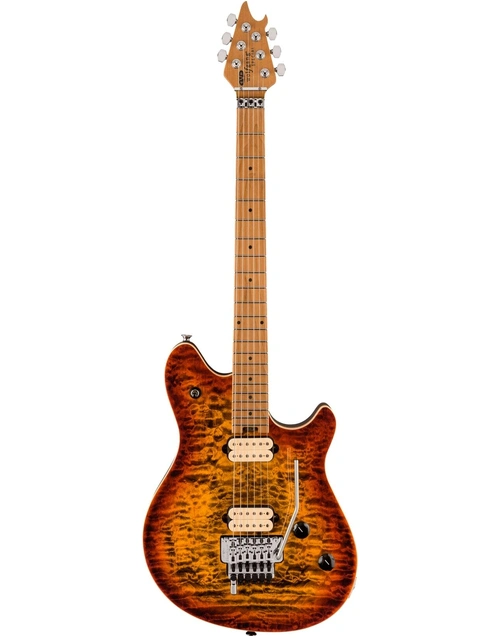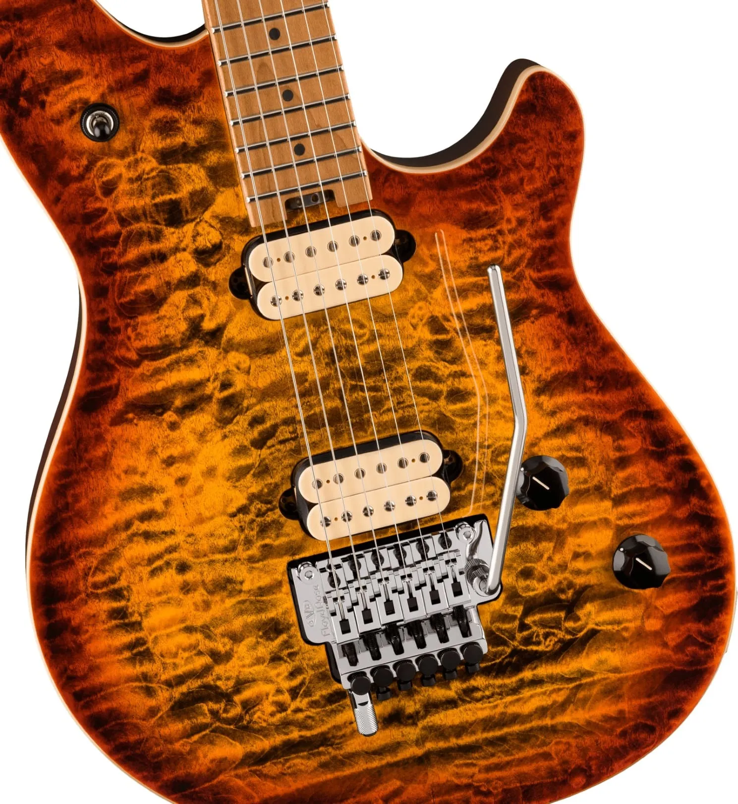 The EVH Wolfgang Special QM Tiger Eye Glow is a performance-driven guitar designed for high-speed playability and stunning style. Its basswood body features an arched quilt maple top, while the quartersawn baked maple neck is graphite-reinforced for durability. Built to Eddie Van Halen's specs, the neck has a hand-rubbed satin urethane finish for smooth feel. Equipped with direct-mount EVH Wolfgang Alnico 2 humbuckers, this guitar delivers dynamic tones and endless sustain. The EVH-branded Floyd Rose locking tremolo, paired with the D-Tuna system, ensures rock-solid tuning stability.
