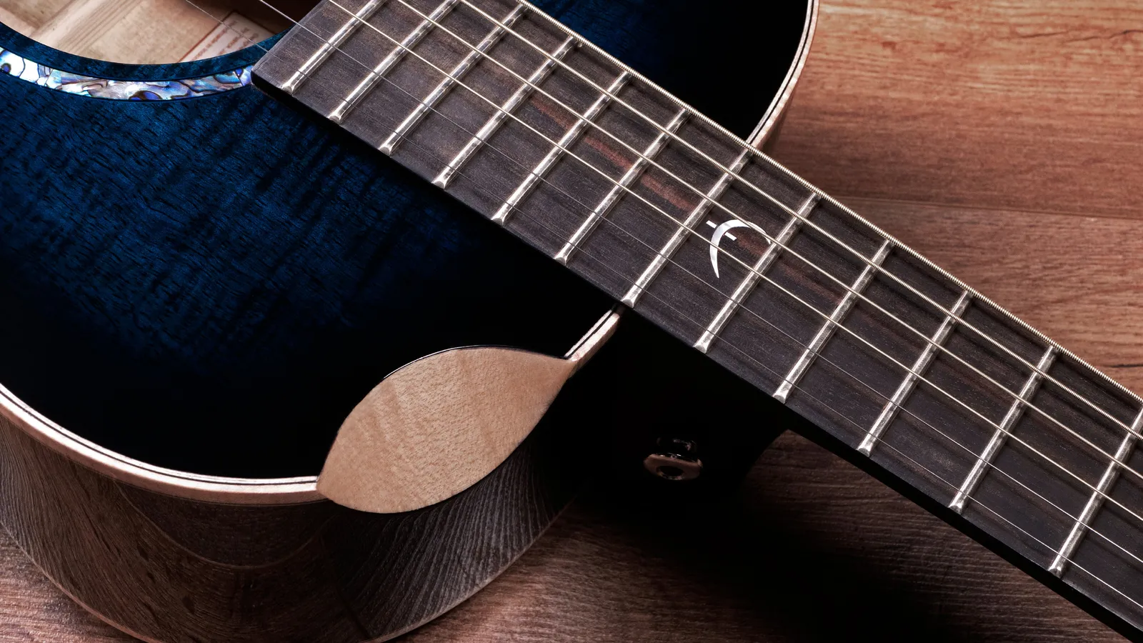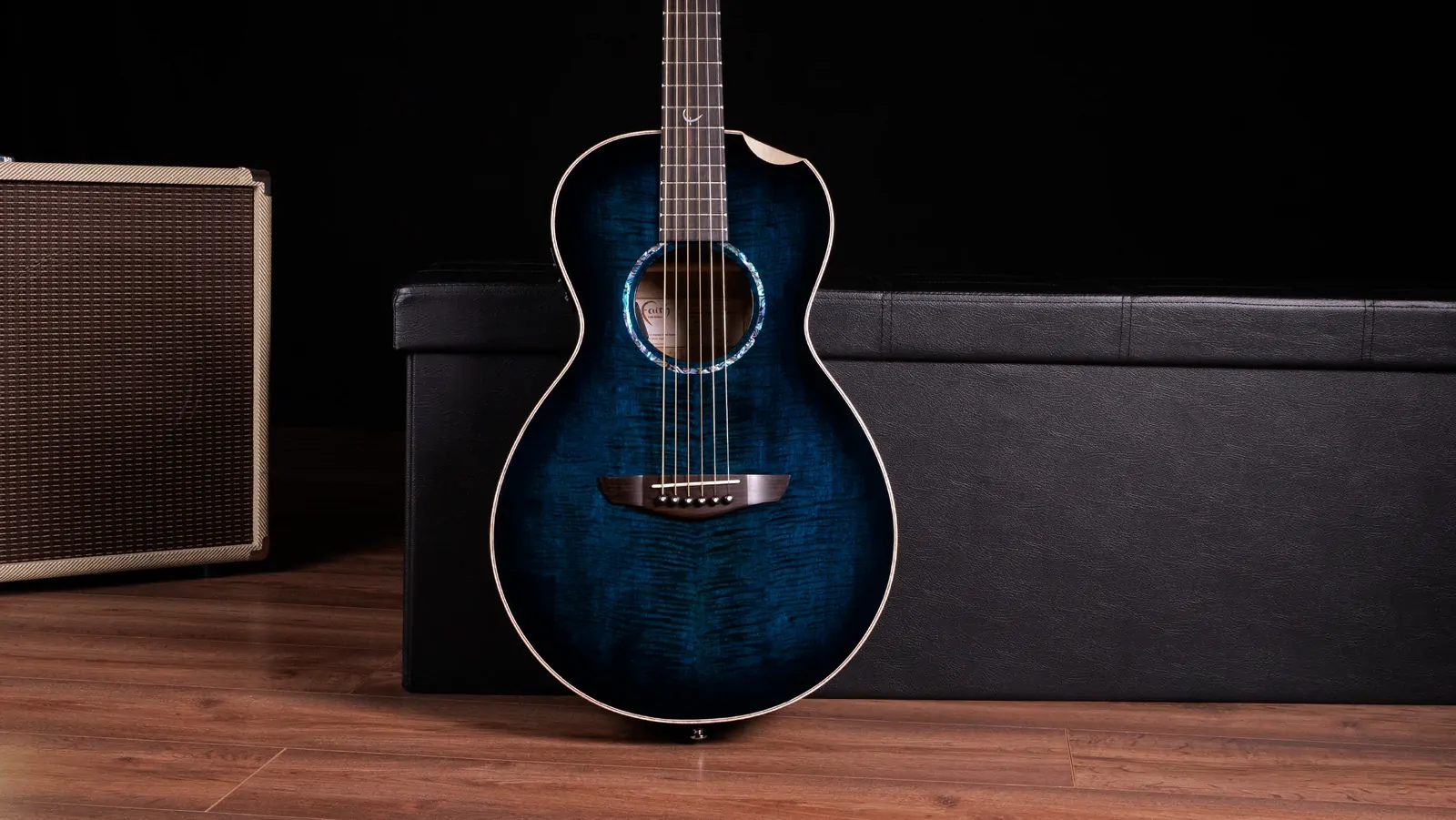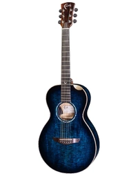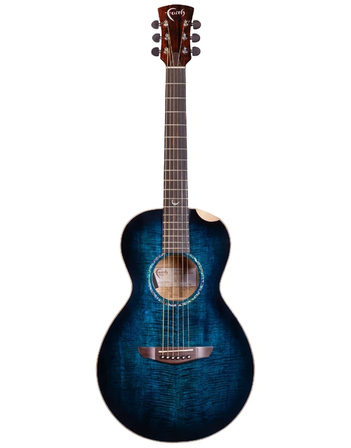 The Faith Blue Moon Mercury Scoop is a visually striking all-solid parlour guitar built from sustainable Indonesian mango wood. Its compact 12th-fret neck join and uniquely placed bridge produce a comfortable playing experience and a surprisingly powerful voice for its size. Mango offers a distinctive tonal character – darker than mahogany but well-balanced and feedback-resistant – ideal for both home playing and stage use. Each guitar features a one-of-a-kind grain pattern enhanced by the Blue Moon burst finish and flamed maple binding. A Fishman INK3 preamp with three-band EQ and tuner makes amplification simple and reliable. Supplied in a plush-lined woodshell hardcase, the Blue Moon Mercury is a perfect blend of individuality, playability, and premium tonewoods. At Riffs & Licks Music, we think this model is a beautiful choice for players seeking a unique, mid-focused parlour guitar with stage-ready electronics.