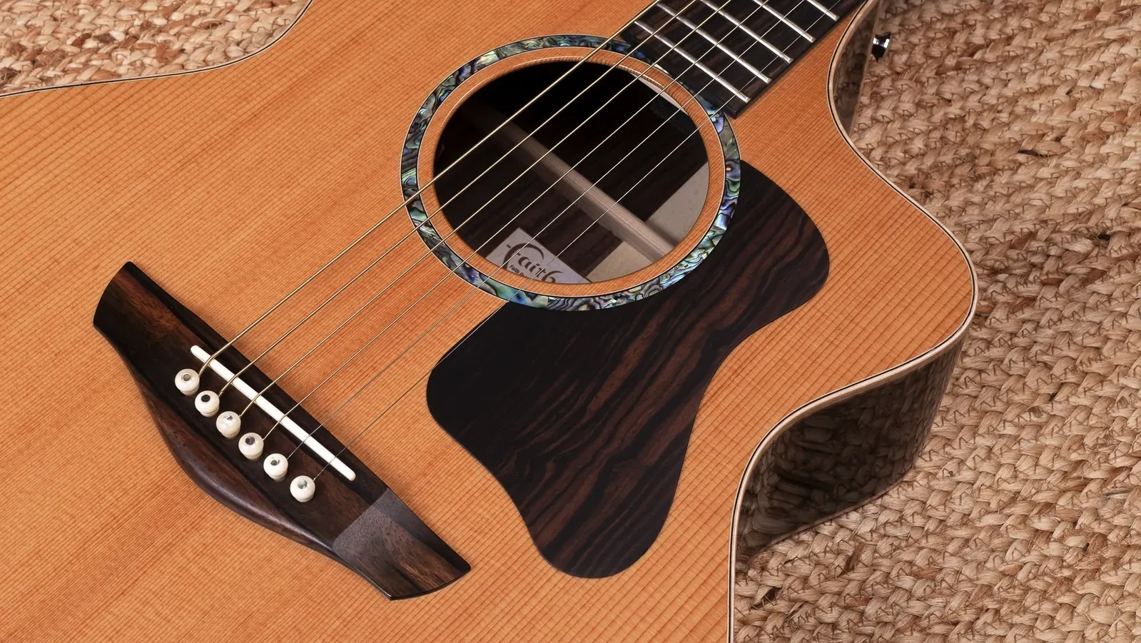| Bridge, Saddle | Macassan Figured Ebony Bridge, Natural Bone Saddle |