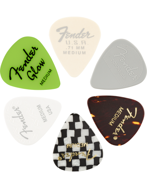 The traditional 351 shape, Fender's most popular pick design, is a perfect accessory for players of versatile styles and techniques. This six-pack of picks contains one crafted from various Fender materials: Celluloid, Glow in the Dark, Nylon and Dura-Tone, along with a Wavelength pick.