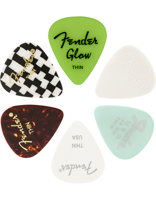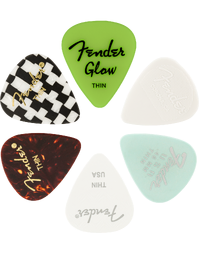 The traditional 351 shape, Fender's most popular pick design, is a perfect accessory for players of versatile styles and techniques. This six-pack of picks contains one crafted from various Fender materials: Celluloid, Glow in the Dark, Nylon and Dura-Tone, along with a Wavelength pick.