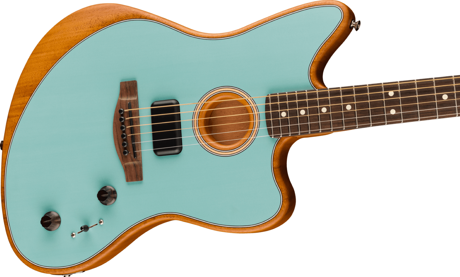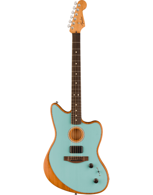 Fender continues to explore the sonic possibilities of an acoustic-electric hybrid guitar with the Acoustasonic Player Jazzmaster. Purposefully streamlined and equally versatile, this guitar intuitively transitions from acoustic to electric voices with the 3-way switch, or from clean to driven with a turn of the Blend Knob. The Fender Acoustasonic Player Jazzmaster RW, finished in Ice Blue, is an extremely innovative, ultra-versatile hybrid. Not just an acoustic, or an electric guitar, the Fender Acoustasonic Player Jazzmaster is the perfect companion on the stage, in the studio, and as a songwriting inspiration machine.