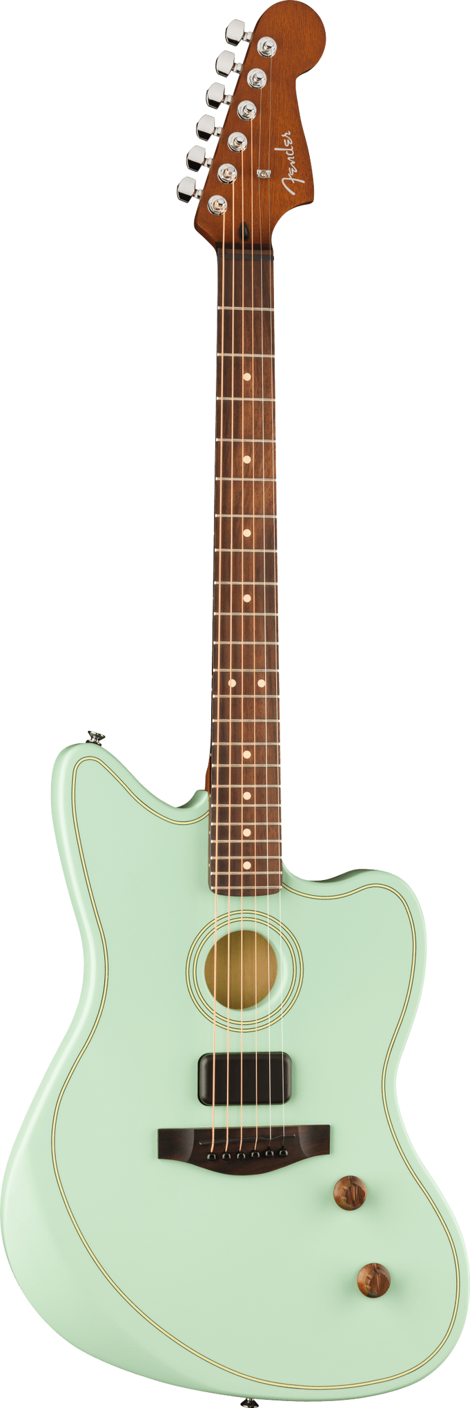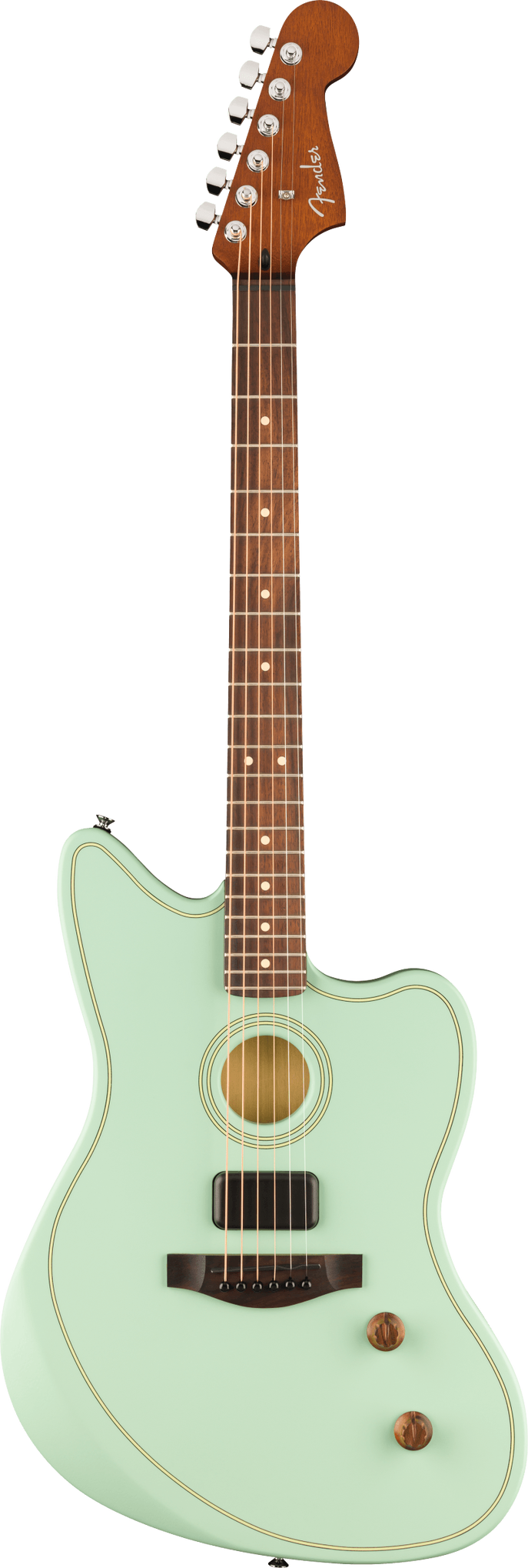 Equipped with Fender and Fishman-designed electronics, the Acoustasonic Standard Jazzmaster features a Fishman under-saddle transducer for authentic acoustic tones and a Fender Acoustasonic Shawbucker for dynamic electric sound. The master volume and blend control allow smooth transitions between acoustic and electric modes. A rosewood fingerboard and bridge enhance warmth and sustain, while the ergonomic forearm and back contours ensure playing comfort.