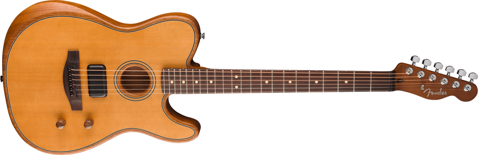 Featuring Fender and Fishman-designed electronics, this guitar includes a Fishman under-saddle transducer for authentic acoustic tones and a Fender Acoustasonic Shawbucker for warm, expressive electric sounds. The master volume and blend control allow smooth transitions between sonic textures, making it ideal for a wide range of playing styles. A rosewood fingerboard and bridge enhance sustain and tonal warmth, while contoured edges ensure playing comfort. Finished in Aged Natural, this Acoustasonic Telecaster is as visually striking as it is versatile.