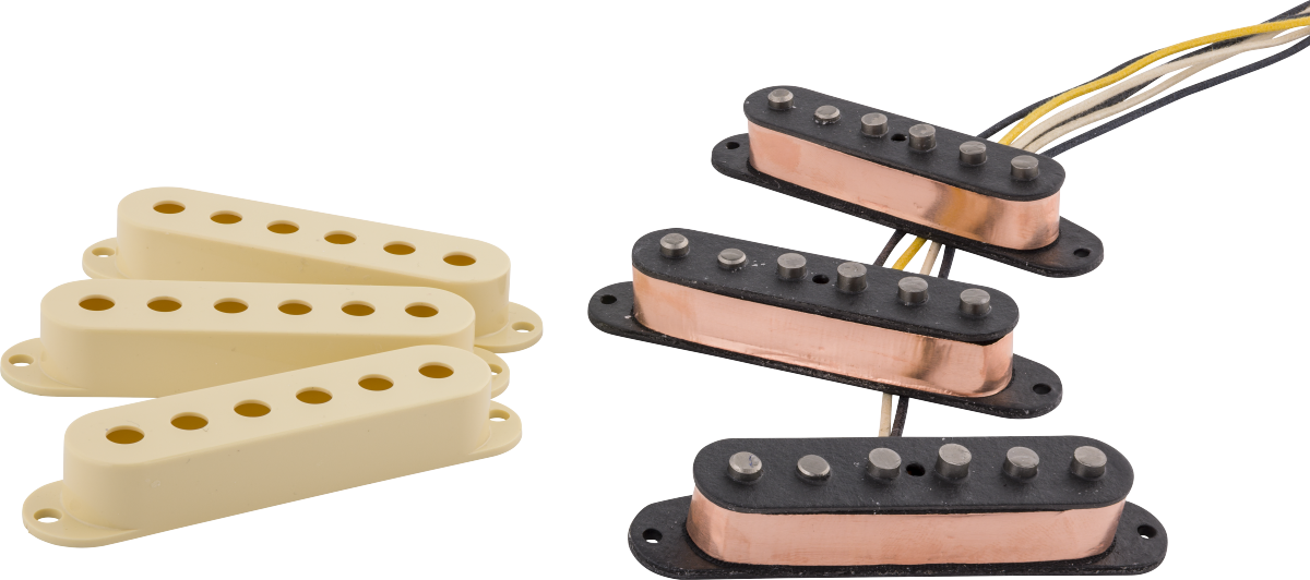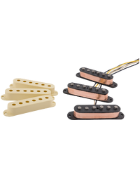 The Fender American Custom Shop Dual Mag II Stratocaster Pickup Set delivers exceptional clarity and balance using a unique combination of alnico 5 and alnico 2 magnets. Alnico 5 magnets are used for the low E to G strings, while hand-bevelled alnico 2 magnets for the B and high E ensure smooth treble response. A reverse-wound, reverse-polarity (RWRP) middle pickup eliminates hum in positions 2 and 4, and Formvar-coated magnet wire enhances brightness. With staggered pole pieces and copper shielding tape for reduced noise, this set is designed for players who demand precision and tonal clarity.
