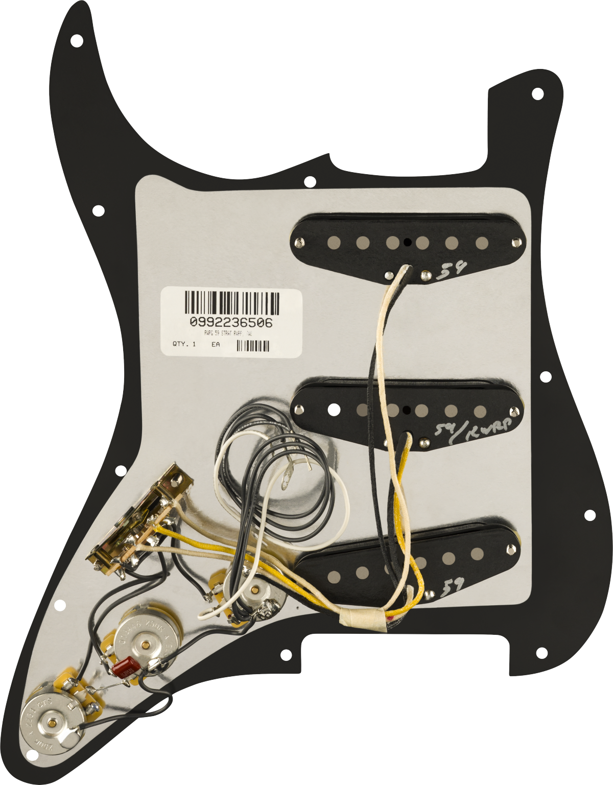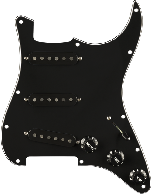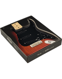The staggered pole pieces help balance output across all strings, and the reverse-wound, reverse-polarity middle pickup eliminates hum in positions two and four, giving you clean, noise-free Strat “quack” tones. With genuine cloth wiring, fibre bobbins and wax potting, this pre-wired guard offers accurate vintage voicing and reliable modern performance. The 11-hole black pickguard and black skirted knobs add a sleek, period-inspired look to match its tone.