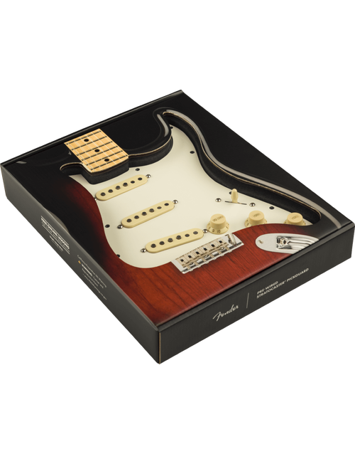 Upgrade your Stratocaster with the Fender American Pre-Wired Stratocaster Pickguard Pure Vintage '59 with RWRP Middle in Parchment 11 Hole. Crafted with premium components in the same factory as Fender's iconic guitars, this drop-in pickguard offers effortless installation. Simply swap out your old guard, solder the output jack and ground wires, and screw in the new one for authentic Fender sound.