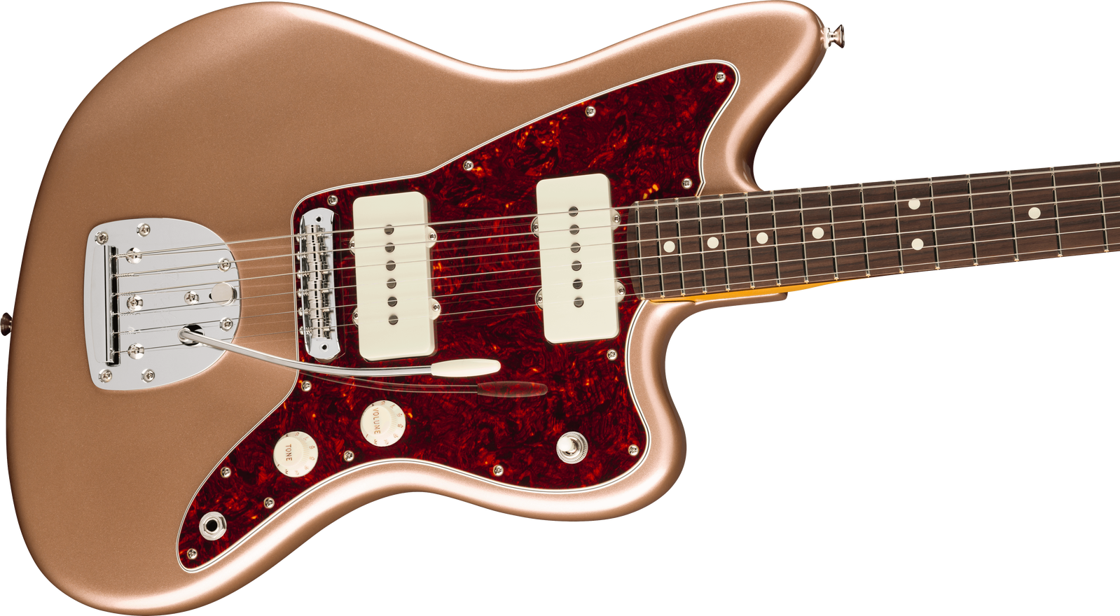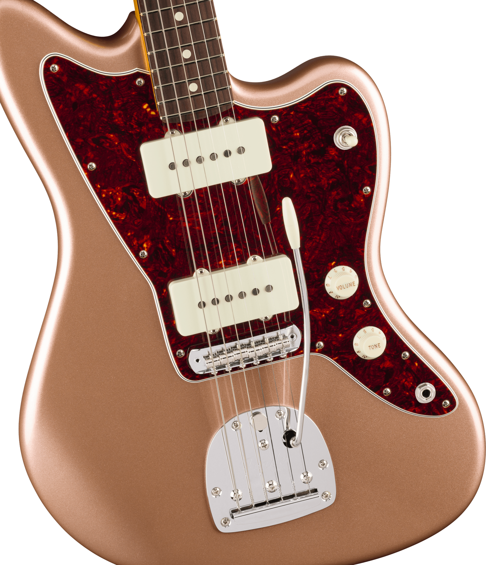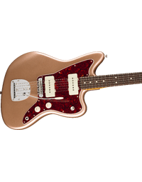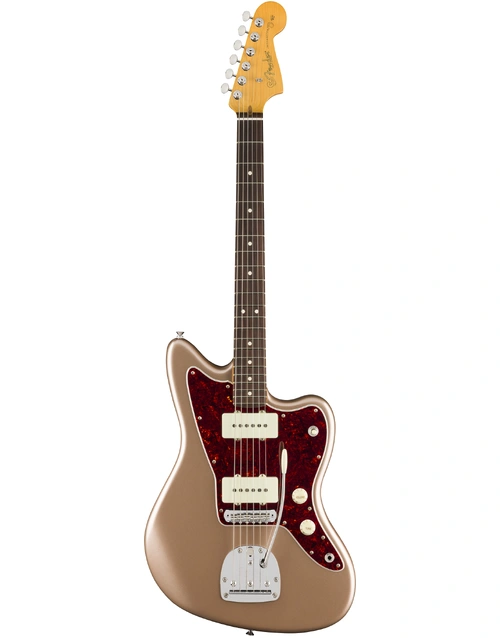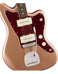 The Fender American Professional Classic Jazzmaster in Faded Firemist Gold combines iconic Fender style with modern playability and tone. Its alder body produces balanced resonance and clarity, while the Coastline ’65 Jazzmaster pickups capture the shimmering highs, warm mids, and dynamic punch that define classic Fender sound. The Modern “C”-shaped maple neck with a 9.5" rosewood fingerboard and medium jumbo frets offers a smooth, comfortable playing feel. Staggered ClassicGear tuners ensure precise tuning stability, while the Greasebucket Tone System preserves clarity when rolling off highs. With its striking Faded Firemist Gold finish and vintage-style hardware, this Jazzmaster is built to inspire both on stage and in the studio.